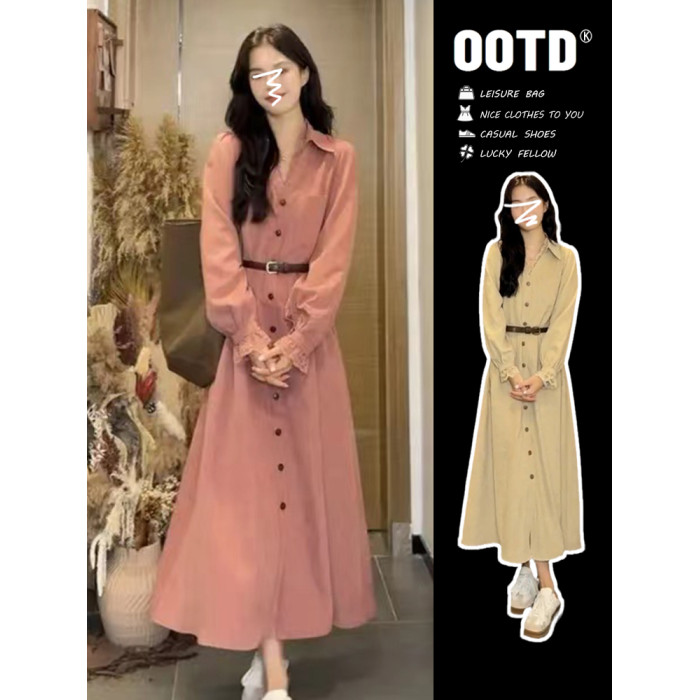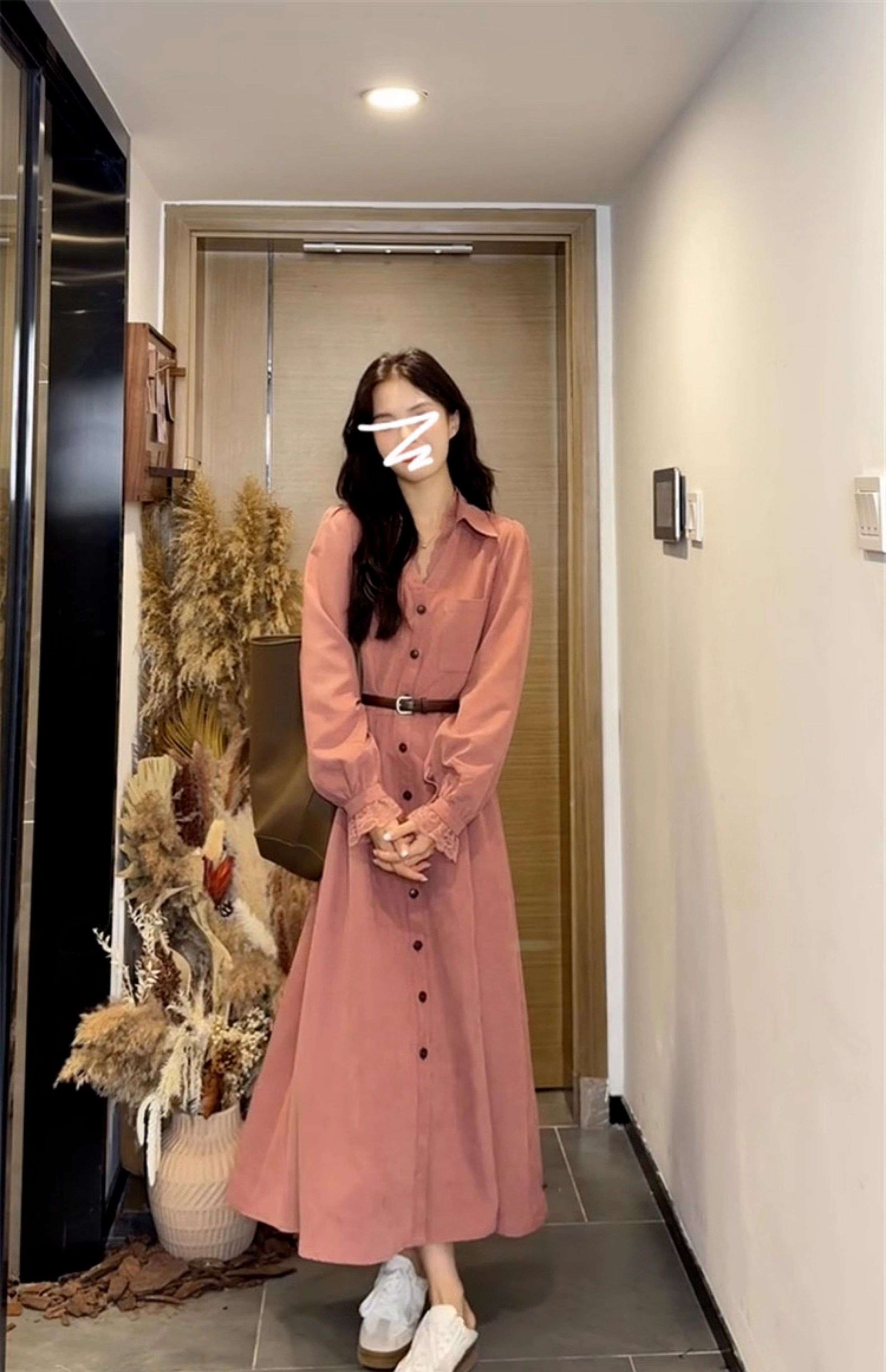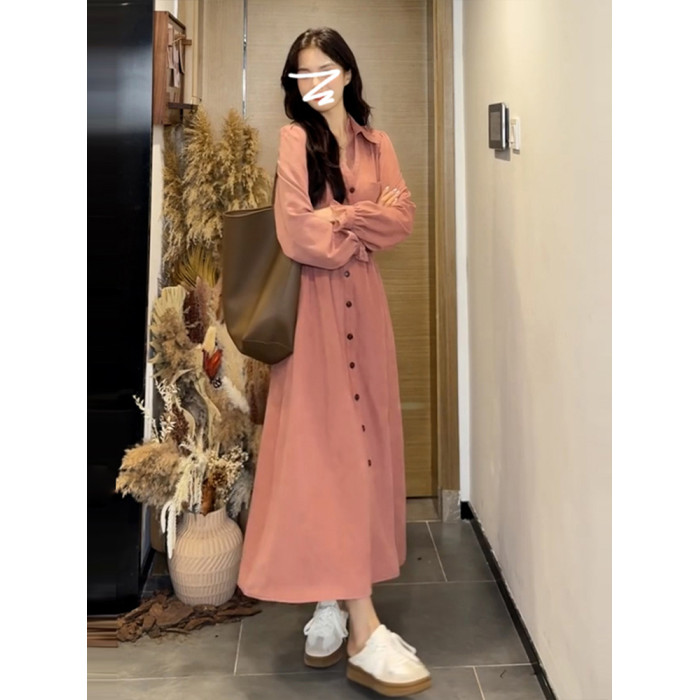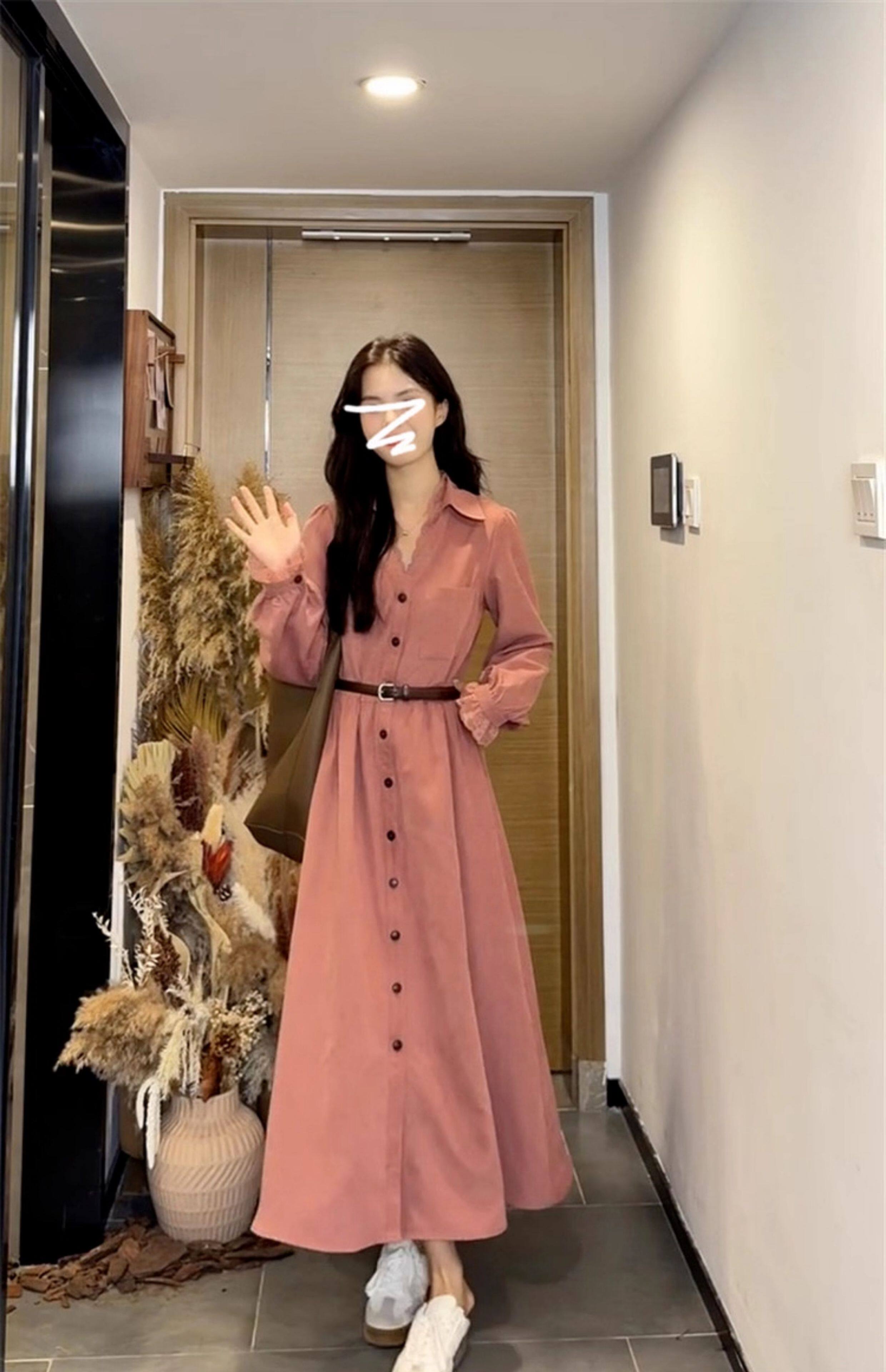 2025新款長袖襯衫粉色V領連衣裙子女裝早秋季高級感法式氣質長裙