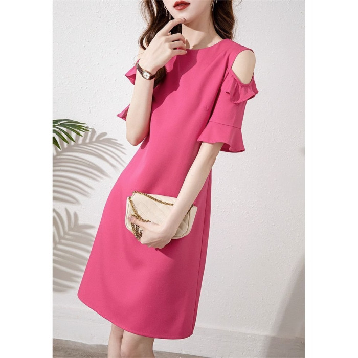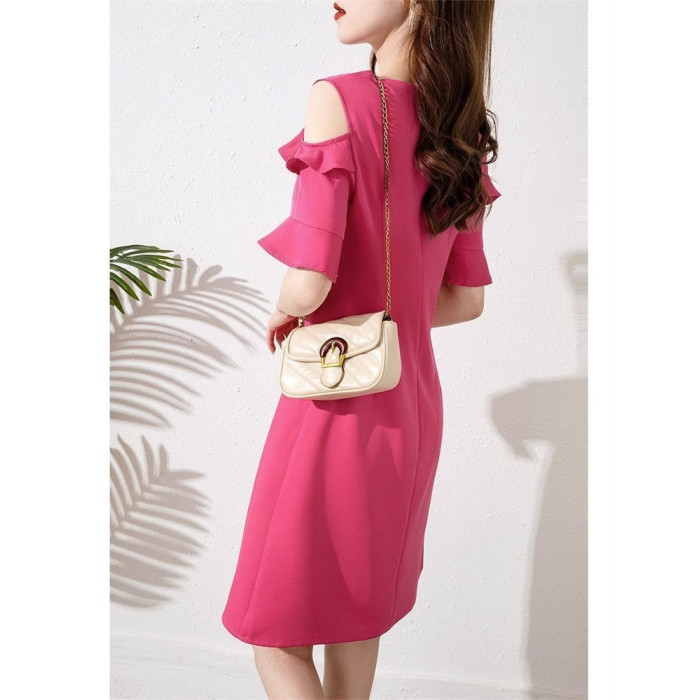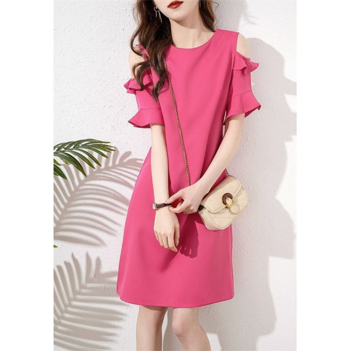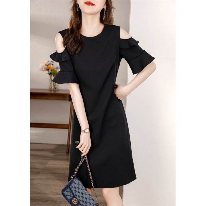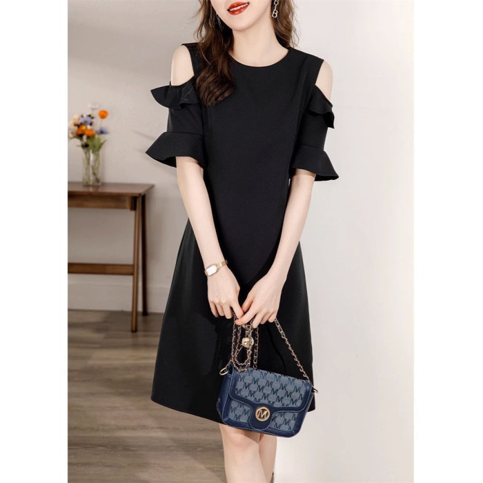 法式氣質連衣裙女2025夏季新款黑色高級感露肩荷葉袖中長款a字裙