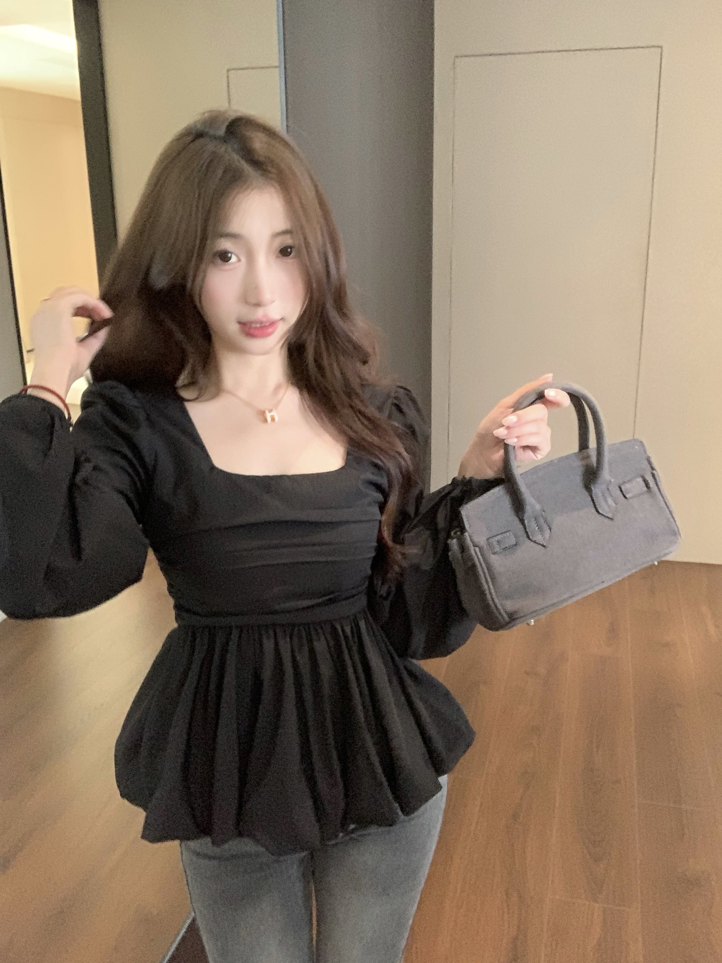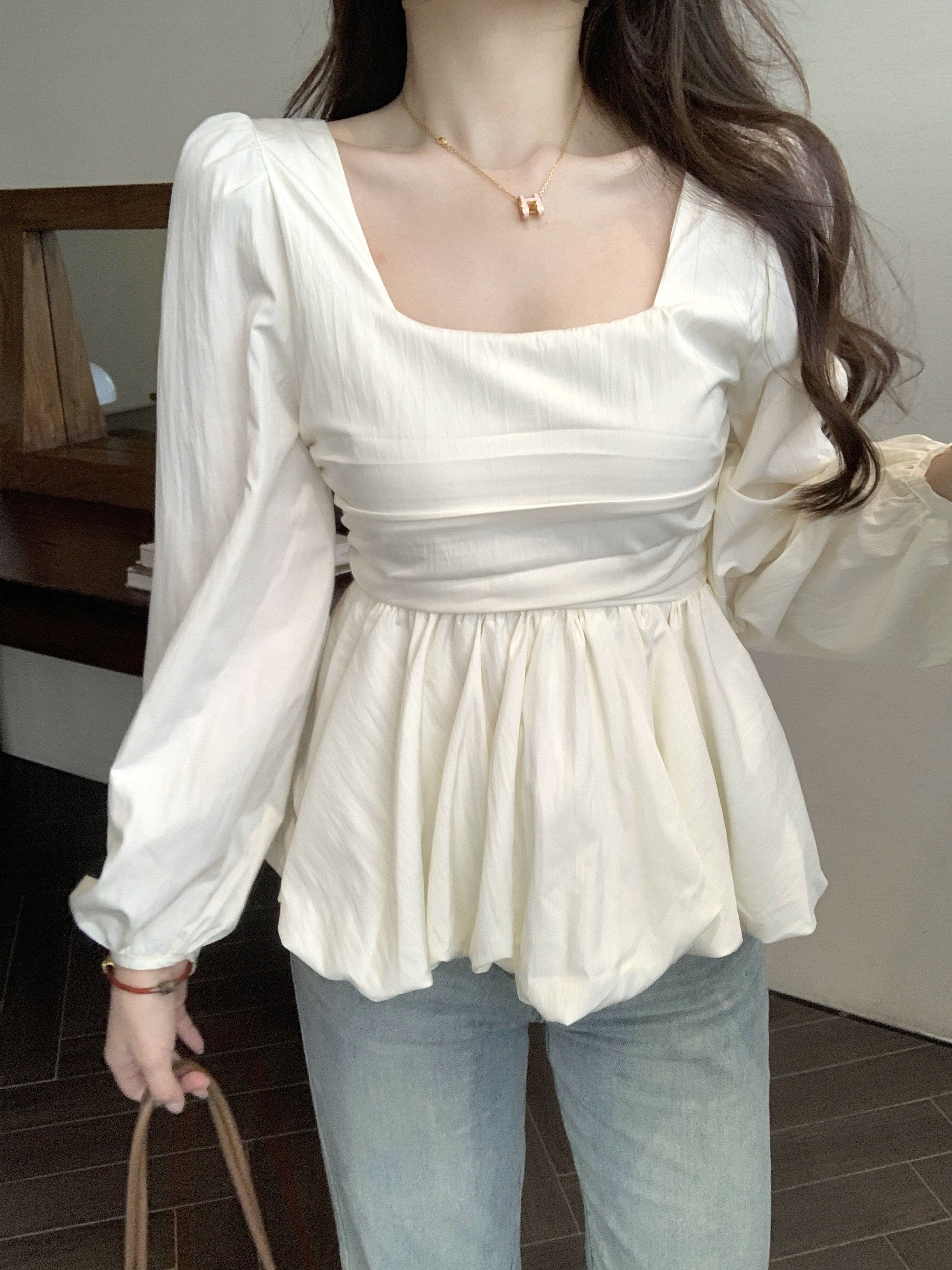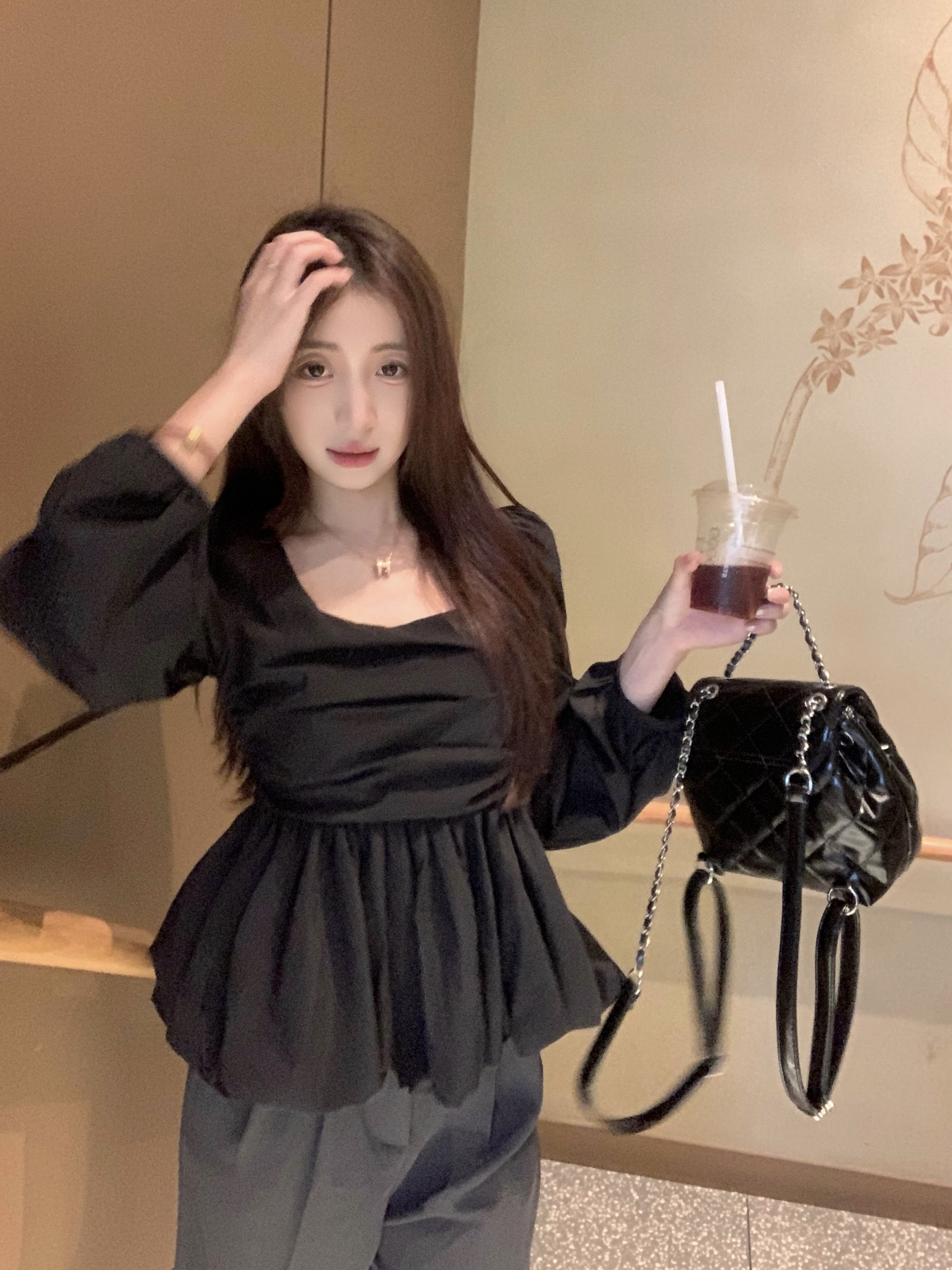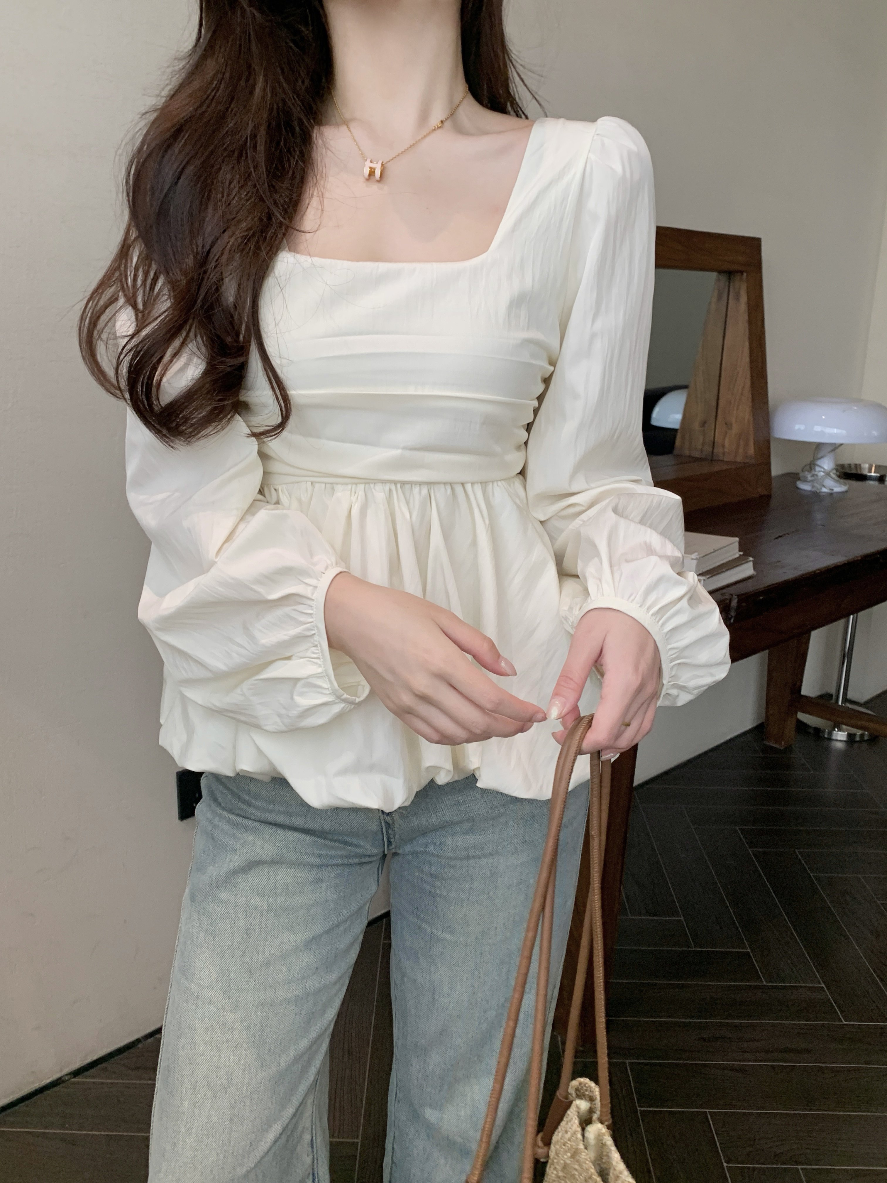 大碼胖mm韓版方領娃娃衫女秋季修身遮肚子顯瘦高級感長袖襯衫上衣