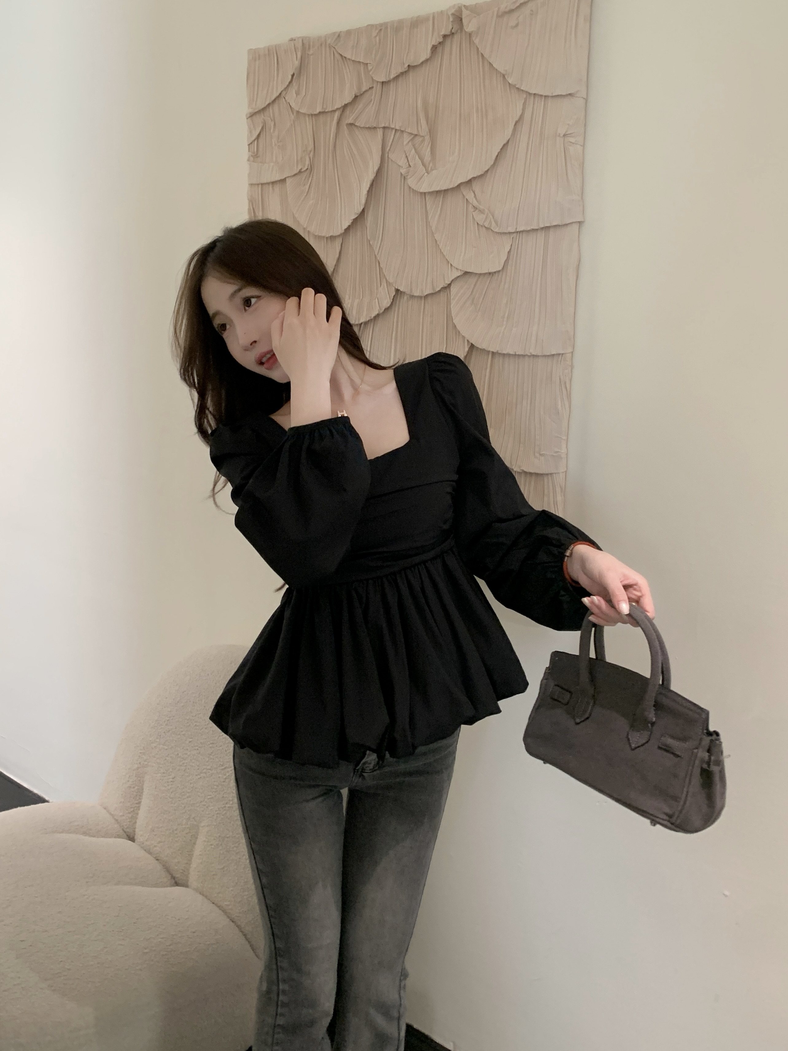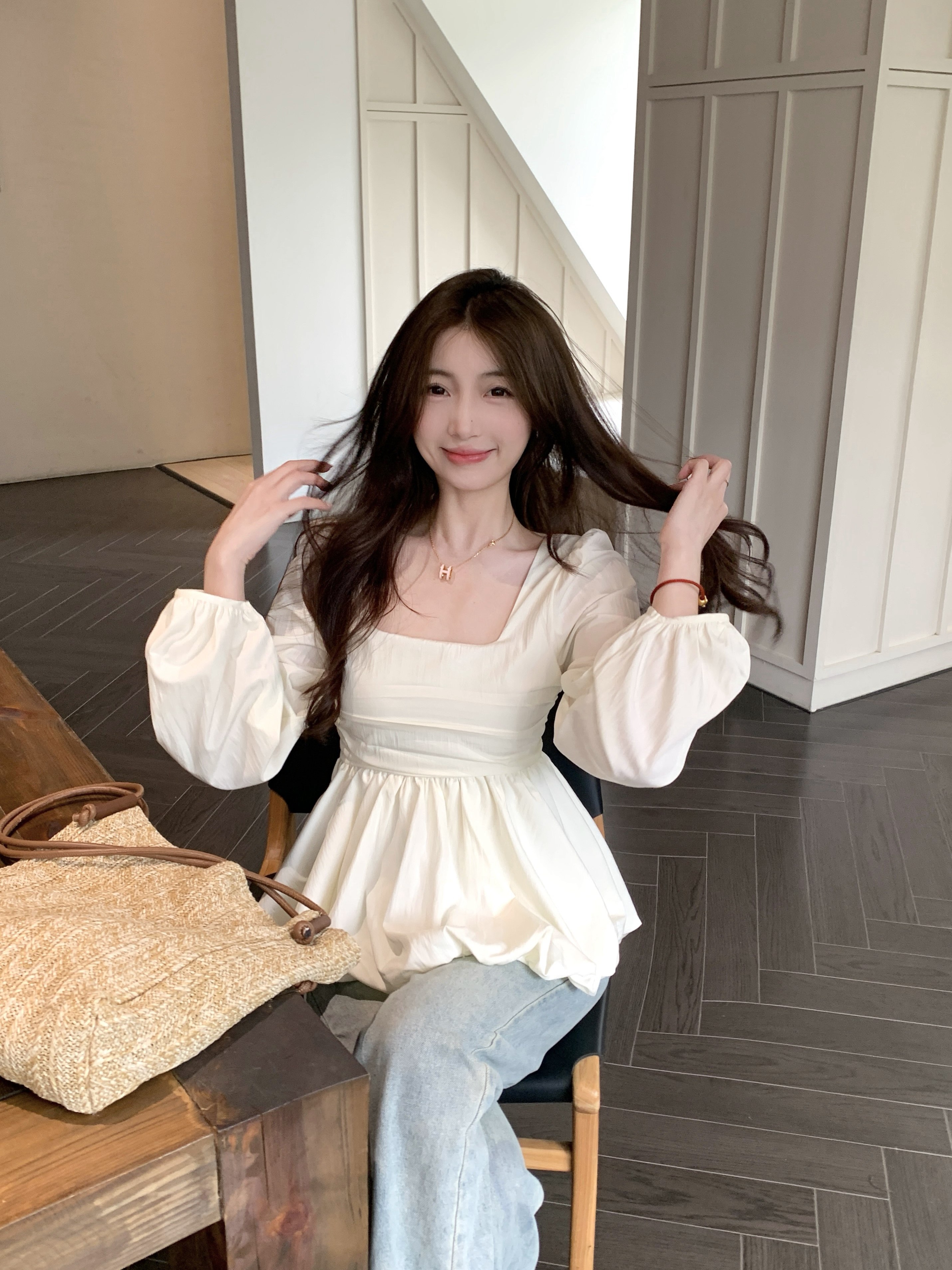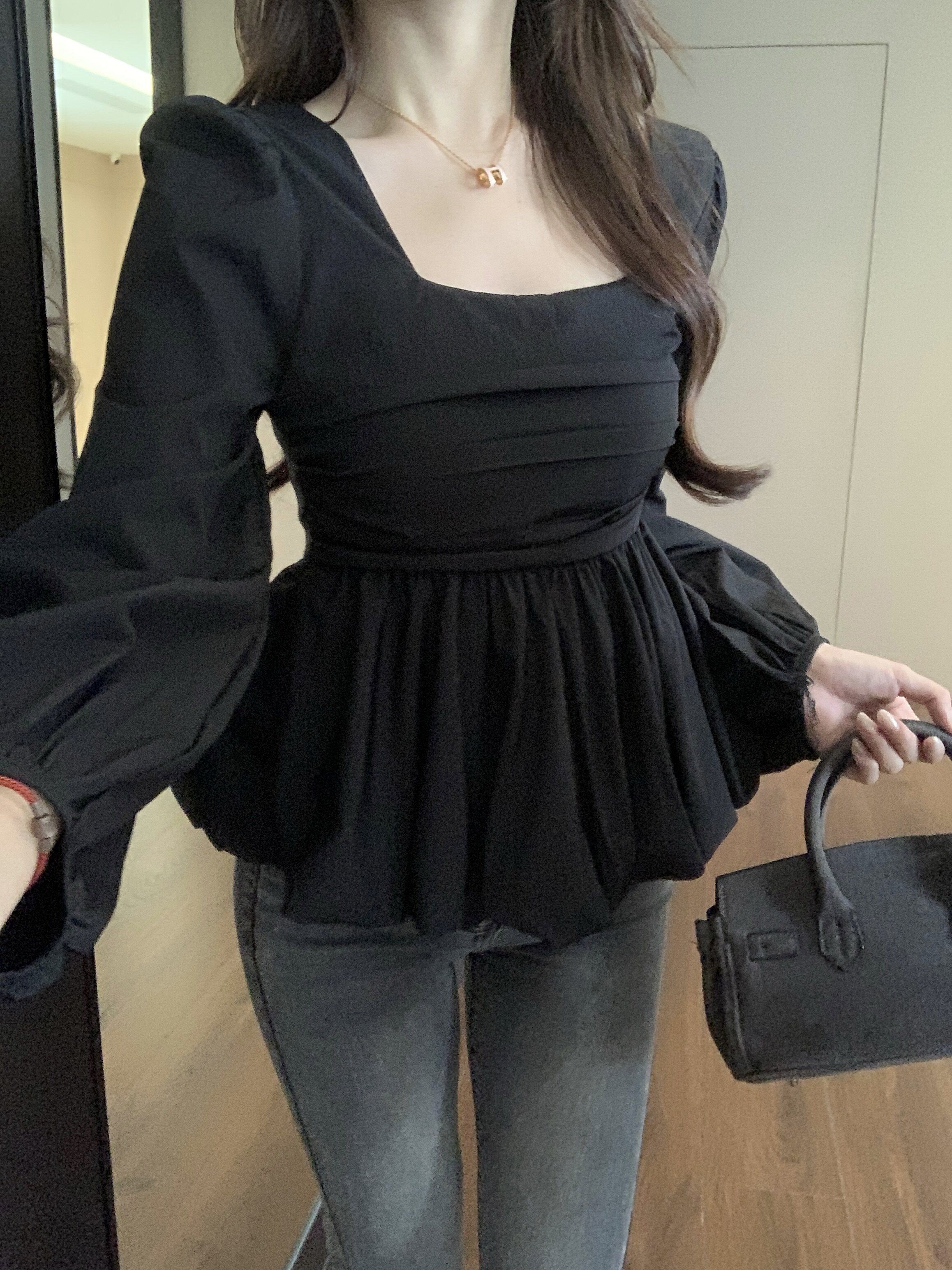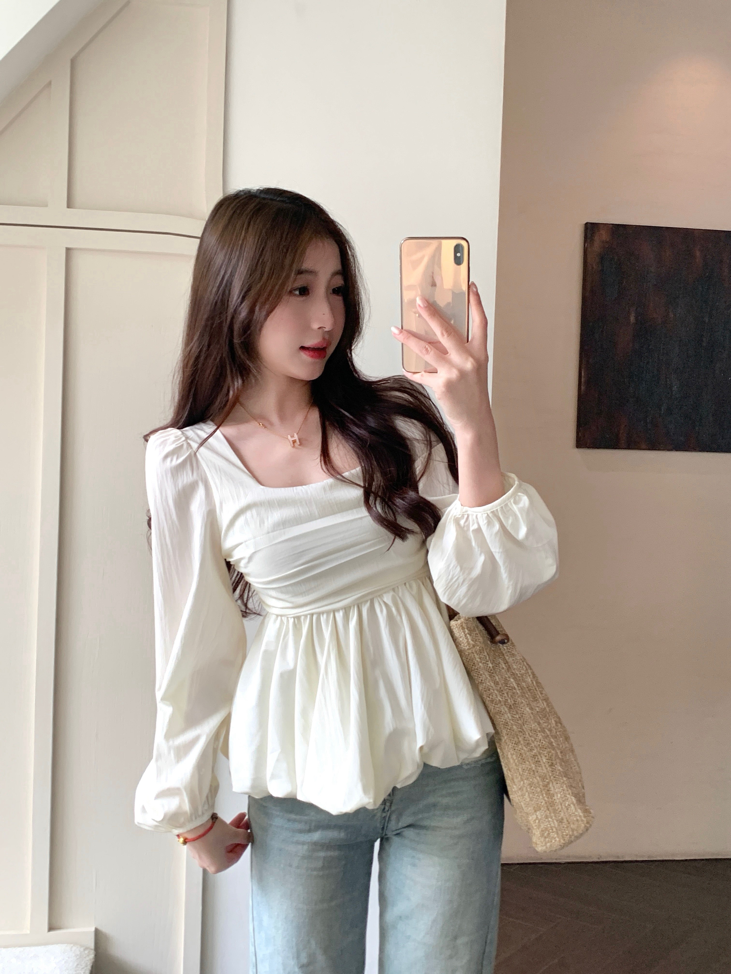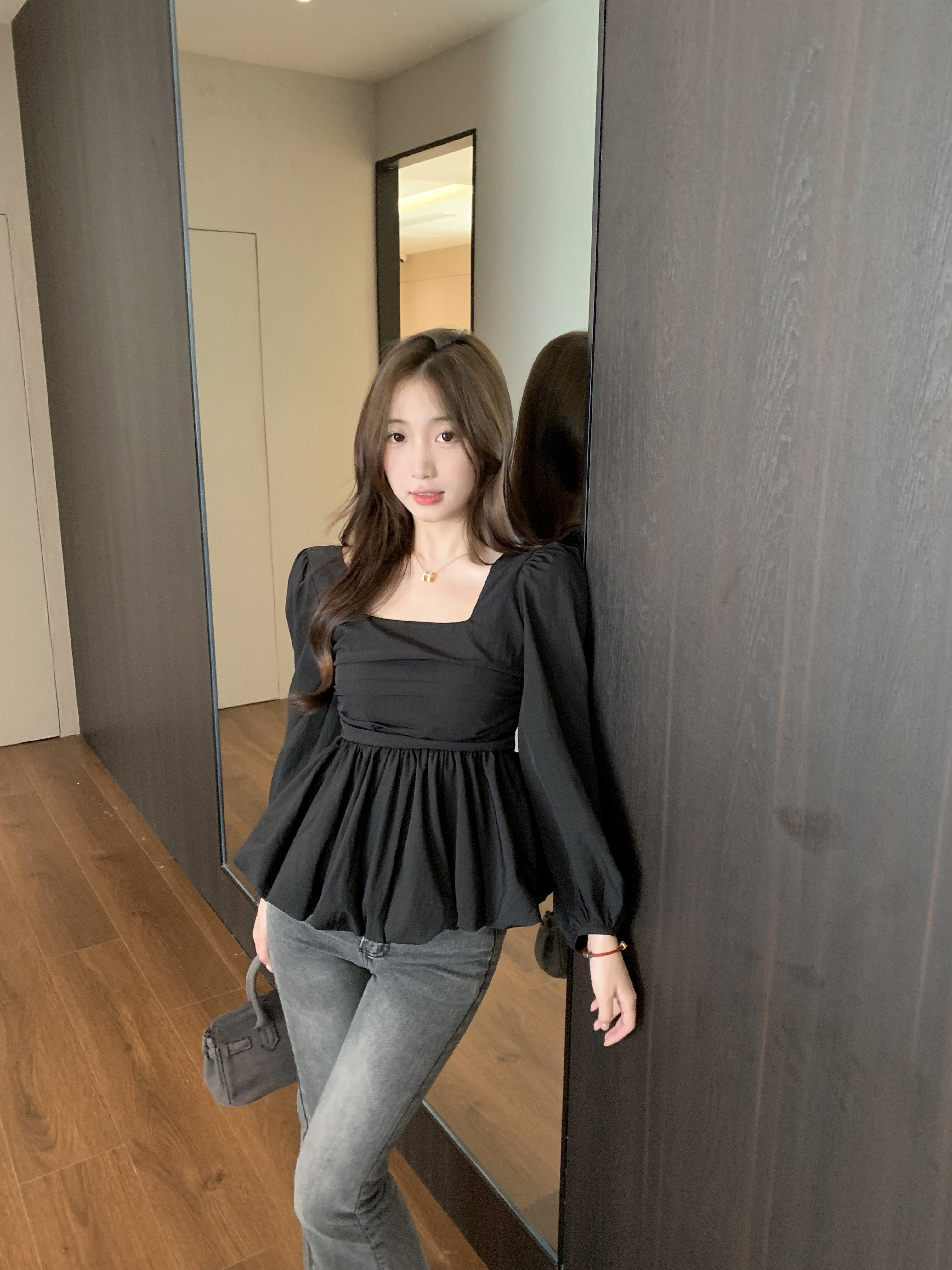 大碼胖mm韓版方領娃娃衫女秋季修身遮肚子顯瘦高級感長袖襯衫上衣