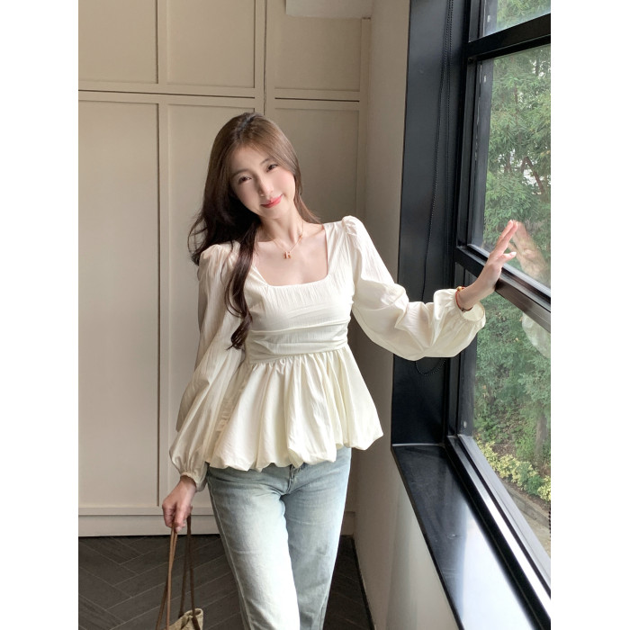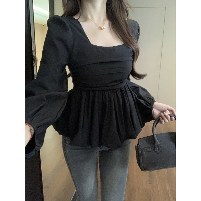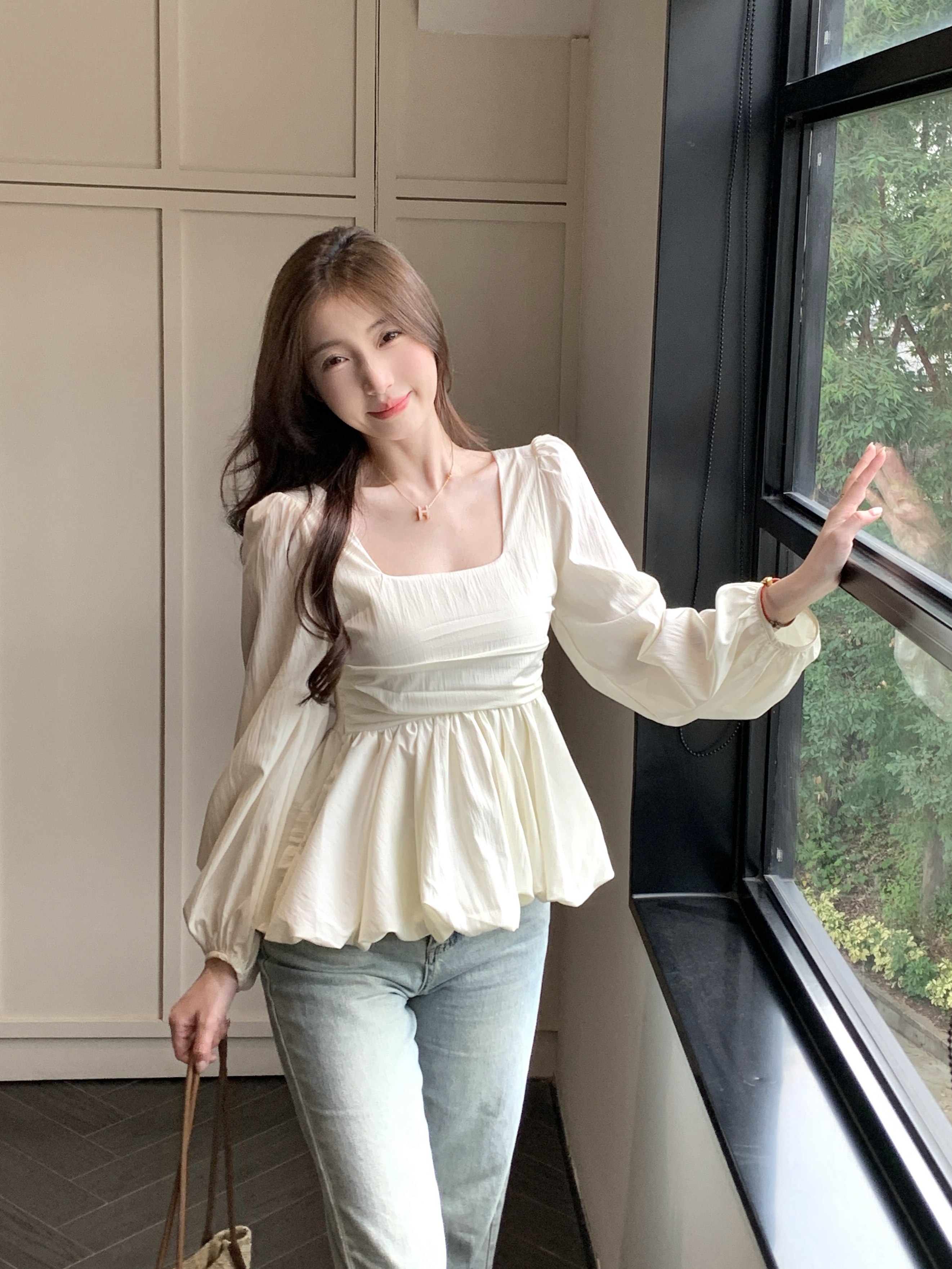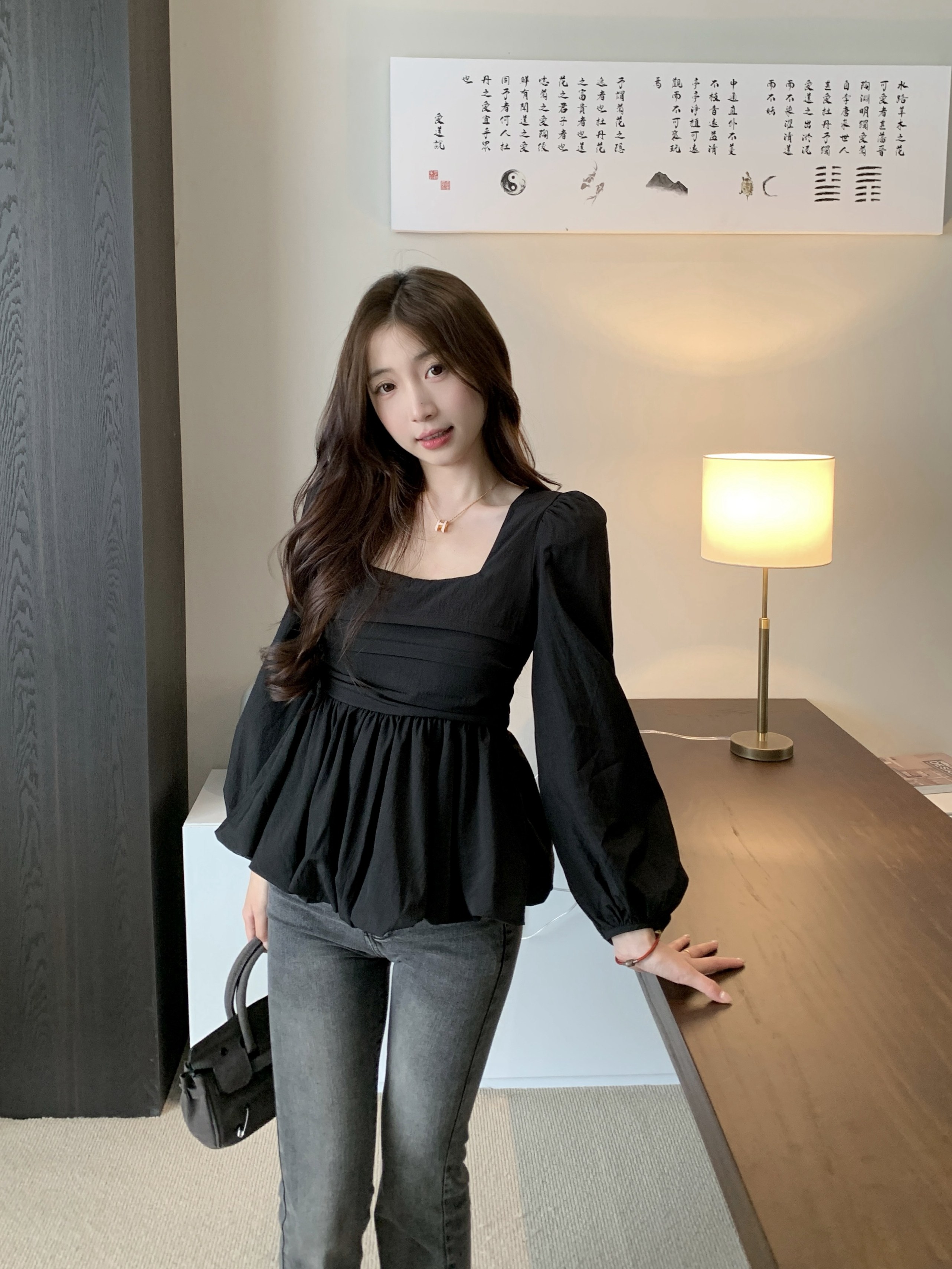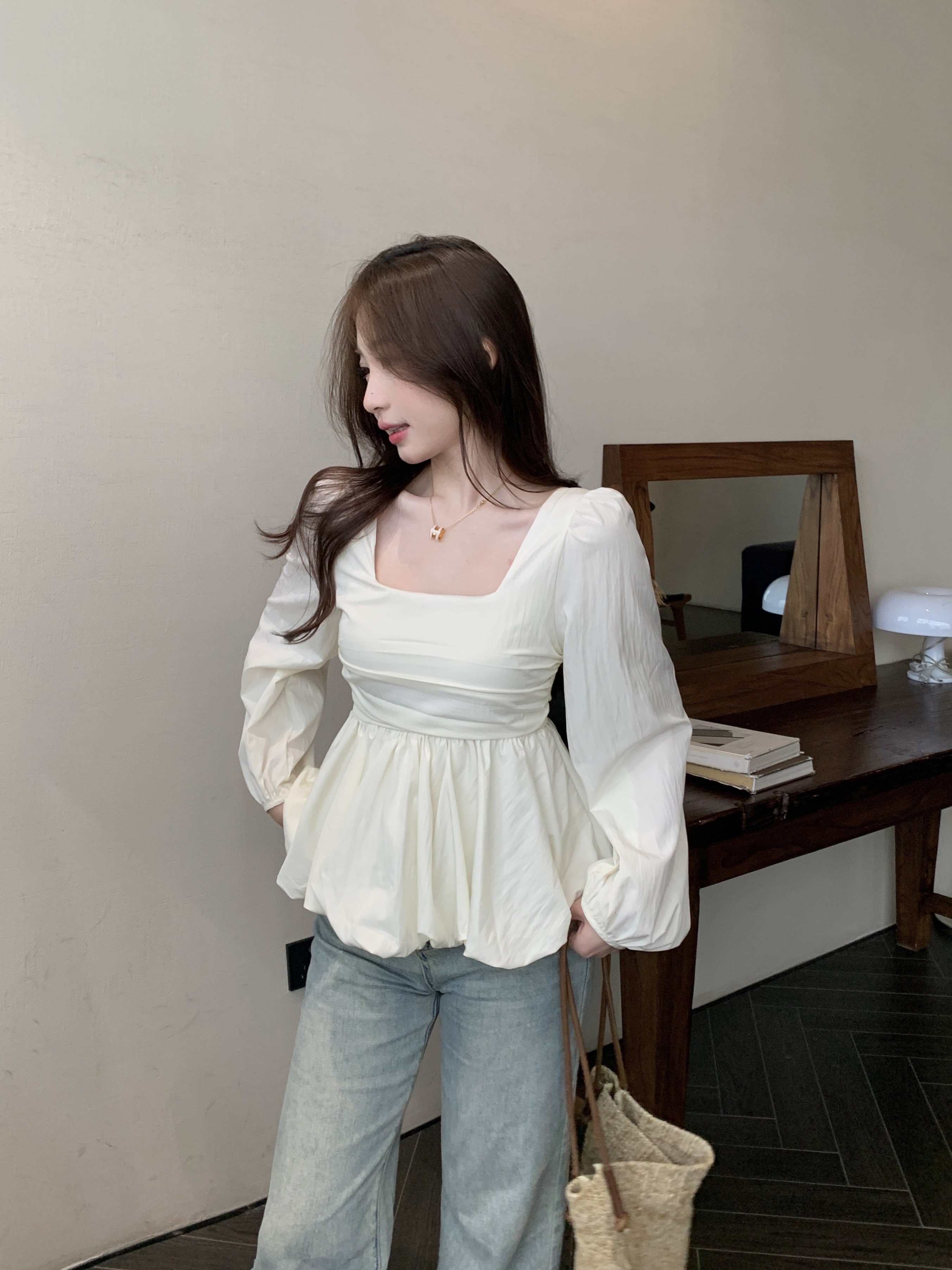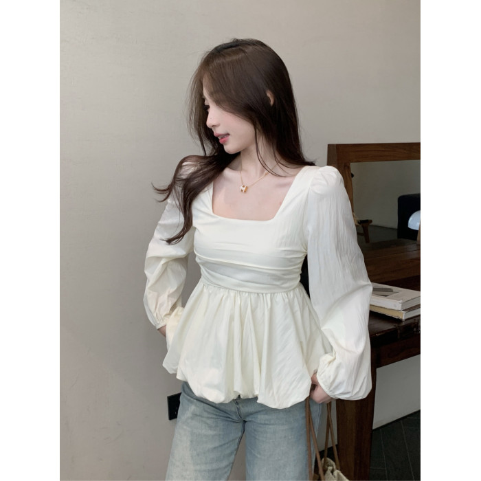 大碼胖mm韓版方領娃娃衫女秋季修身遮肚子顯瘦高級感長袖襯衫上衣
