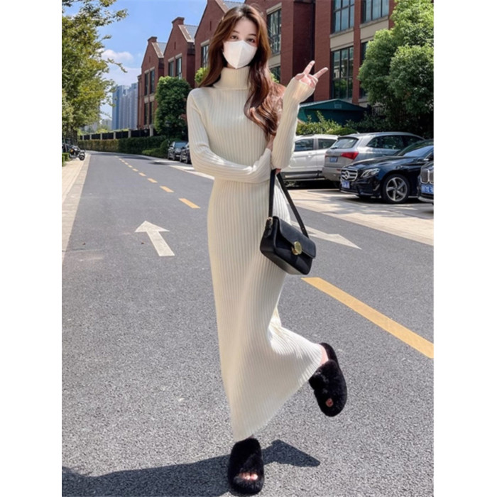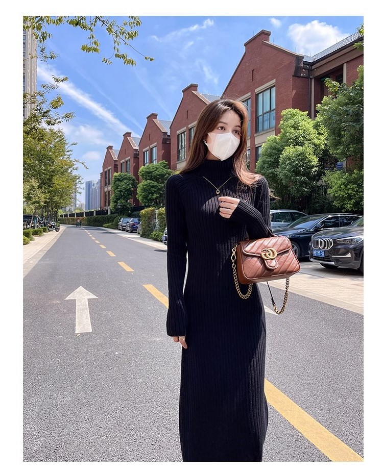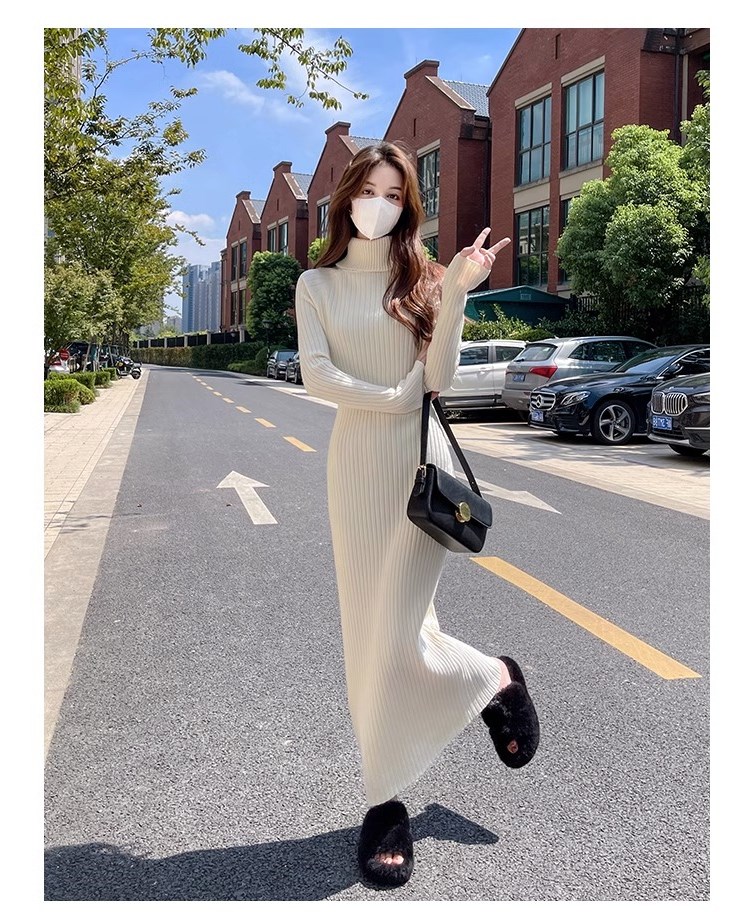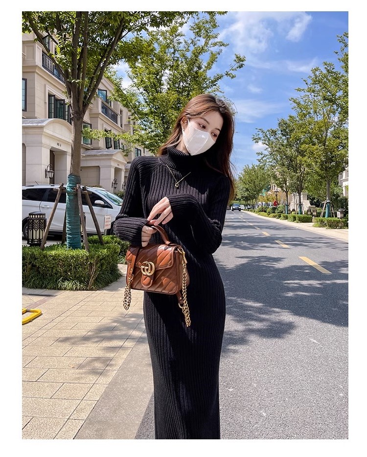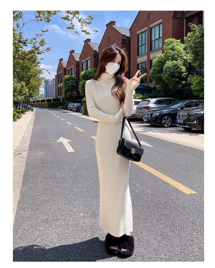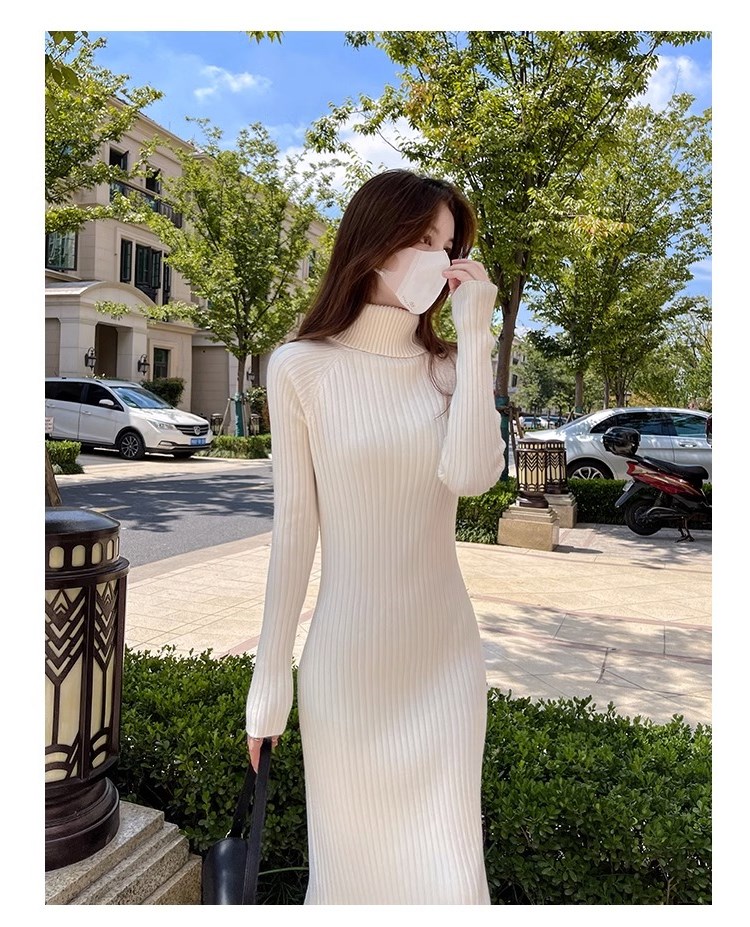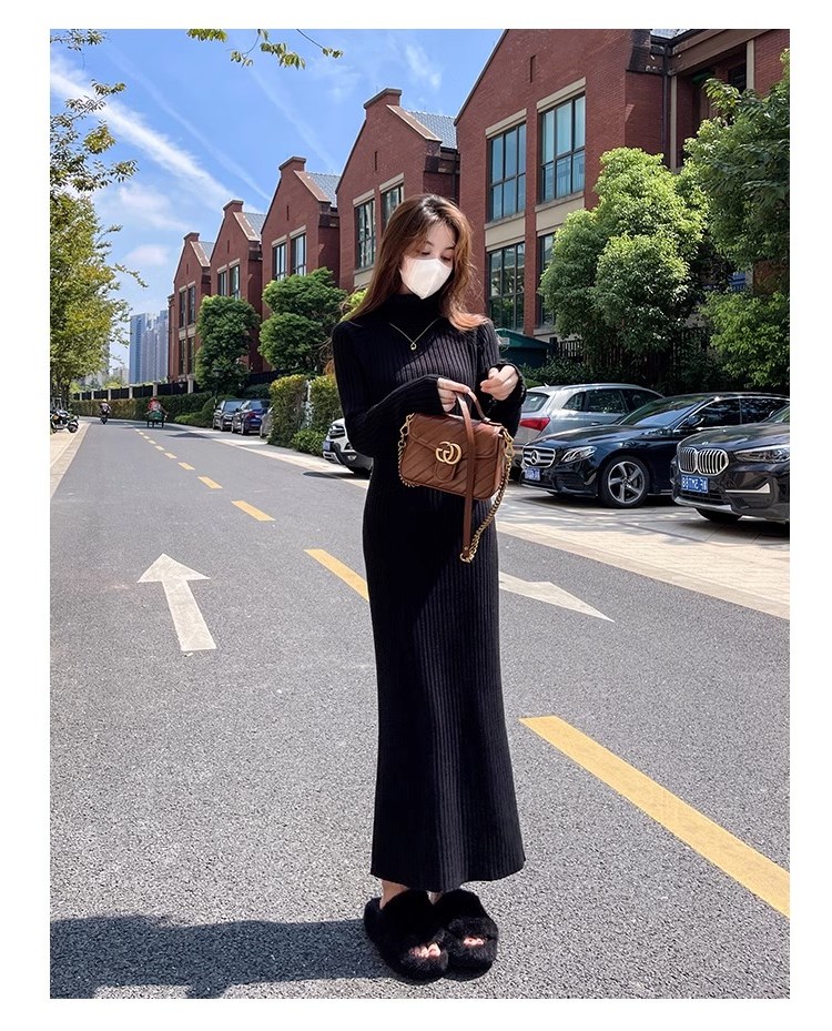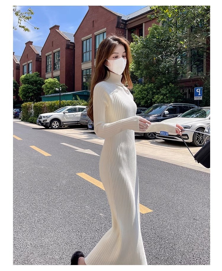 配大衣的長款內搭針織連衣裙女秋冬季慵懶高領過膝羊絨打底毛衣裙