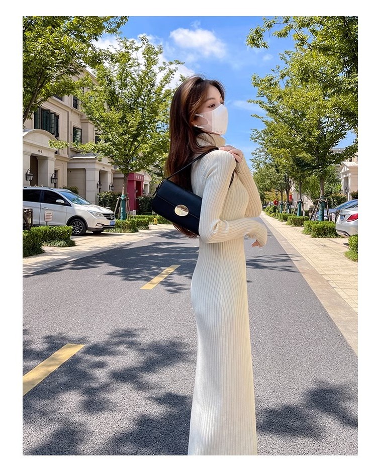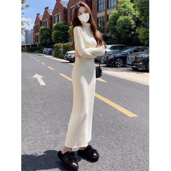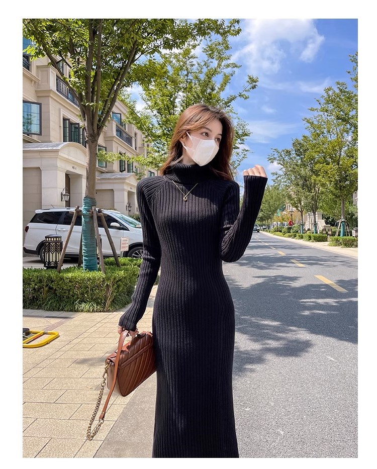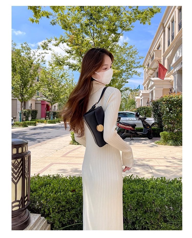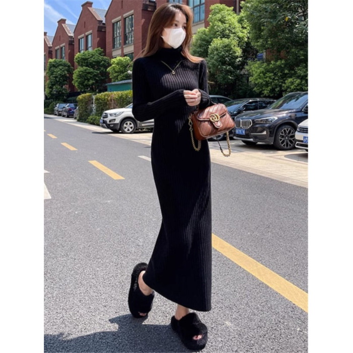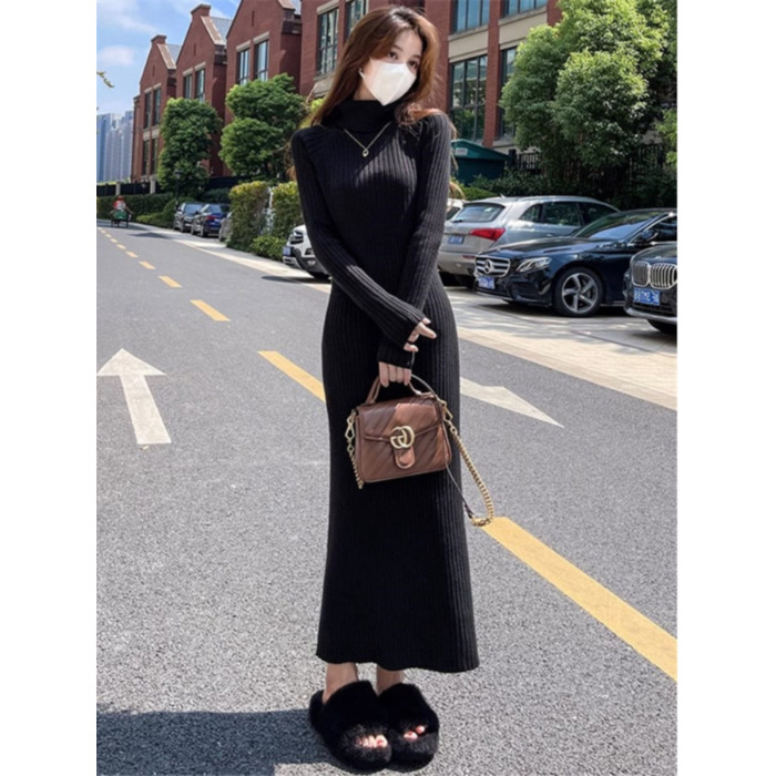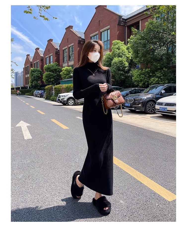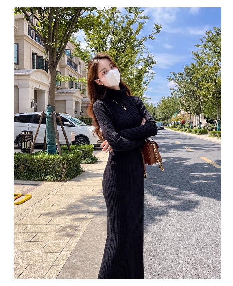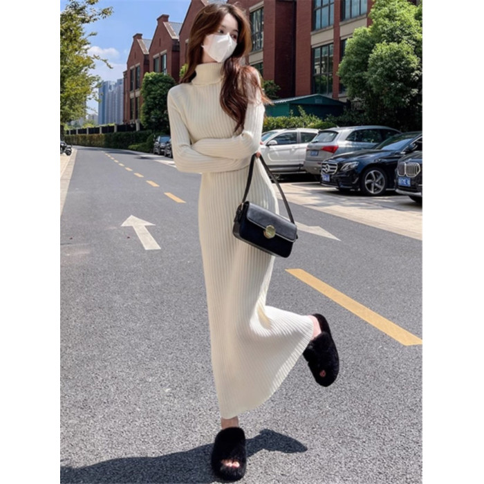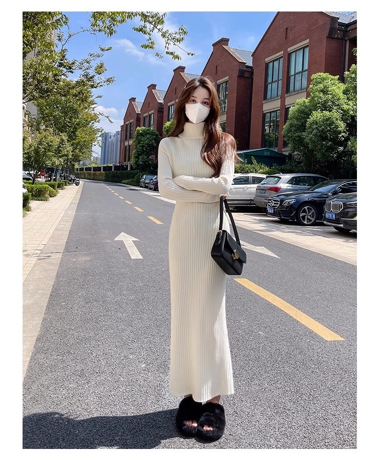 配大衣的長款內搭針織連衣裙女秋冬季慵懶高領過膝羊絨打底毛衣裙