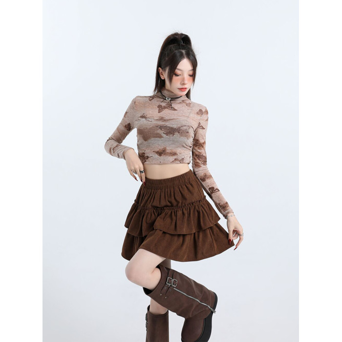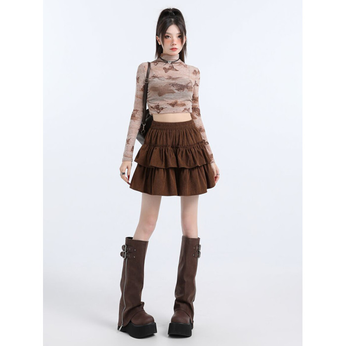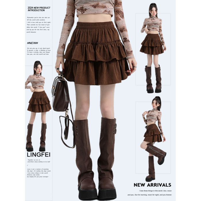 咖色燈芯絨半身裙女秋冬新款小個子美拉德穿搭蛋糕裙高腰a字短裙