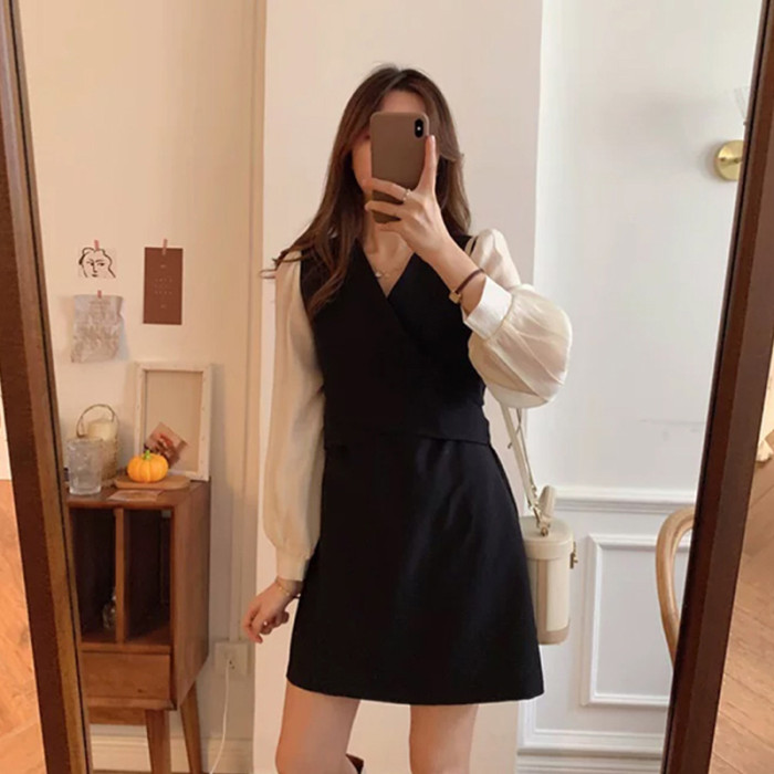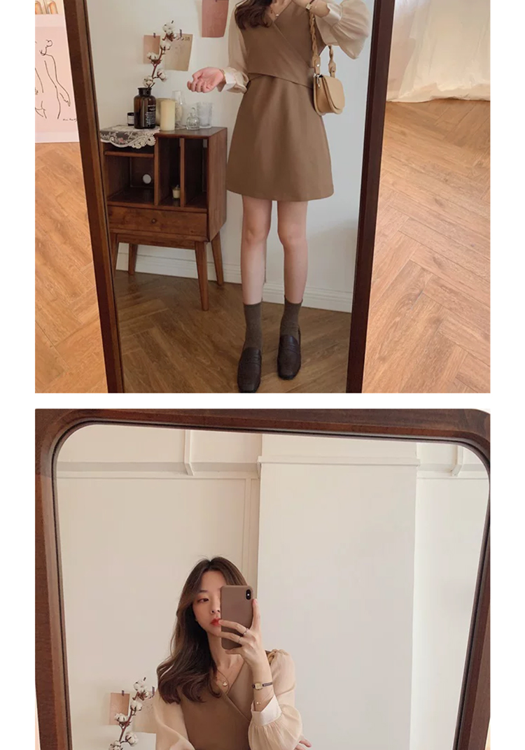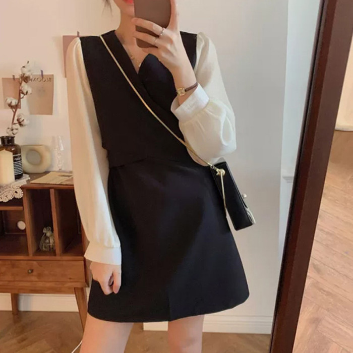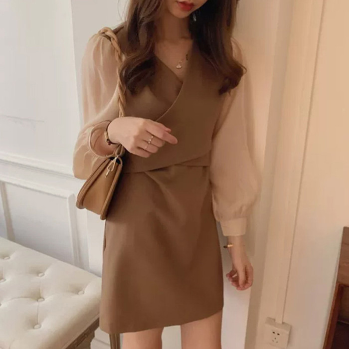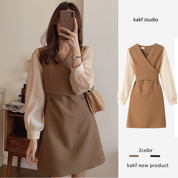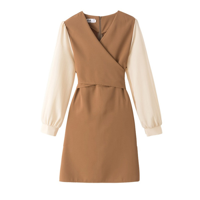 2024早春新款連衣裙女韓版ins遮肚子顯瘦收腰氣質v領長袖a字裙子