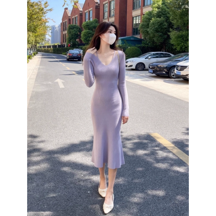 紫色v領針織連衣裙女秋冬法式收腰氣質魚尾長裙修身打底包臀裙子