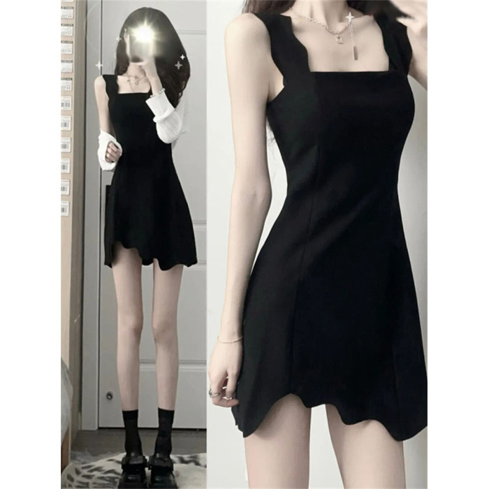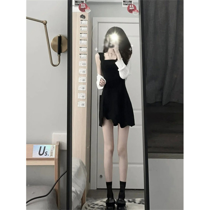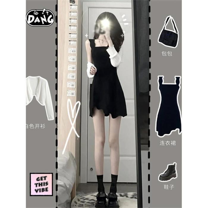 2025新款法式高級感赫本風小個子短裙黑色吊帶連衣裙兩件套裝女夏