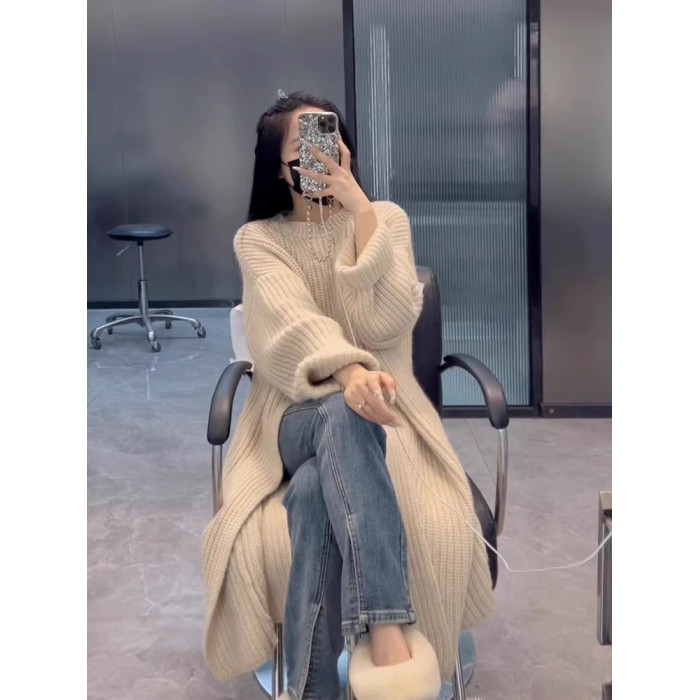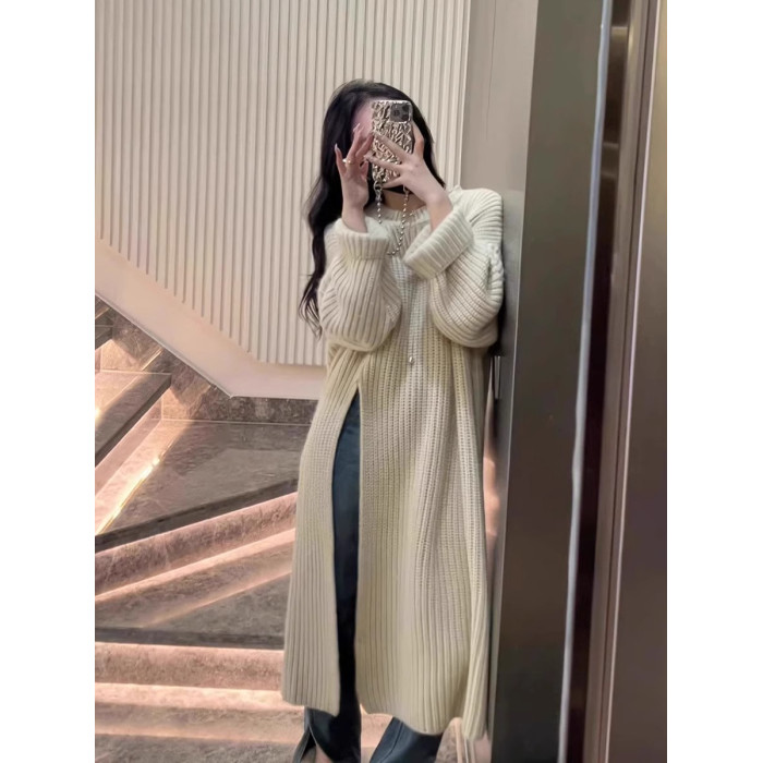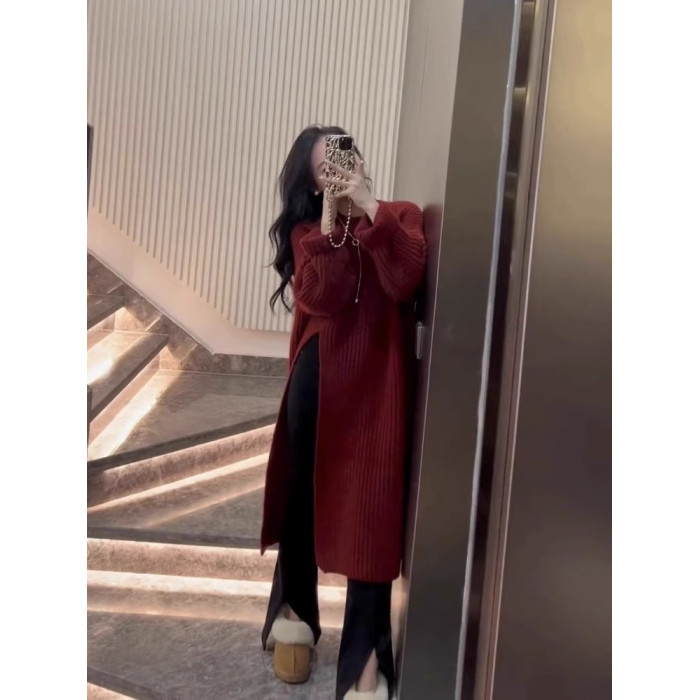 設計感復古毛衣裙女2024秋冬季新款套頭開叉過膝中長款針織連衣裙