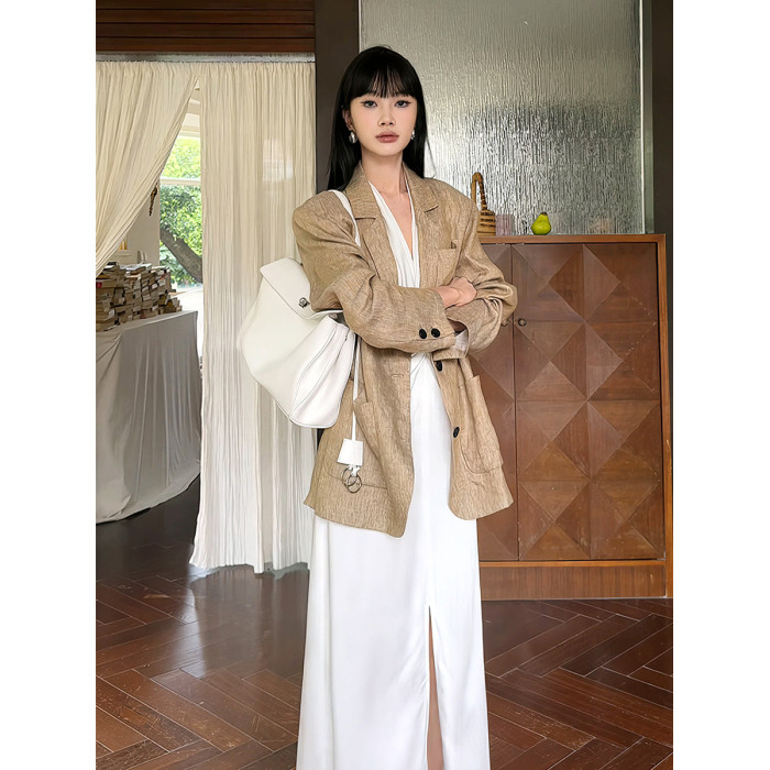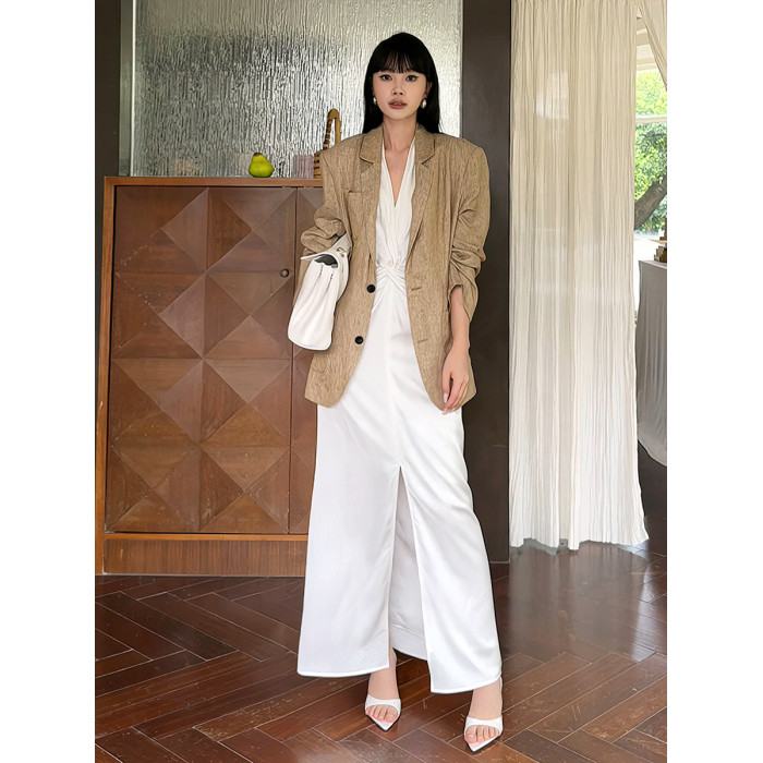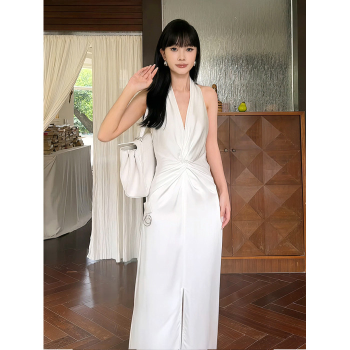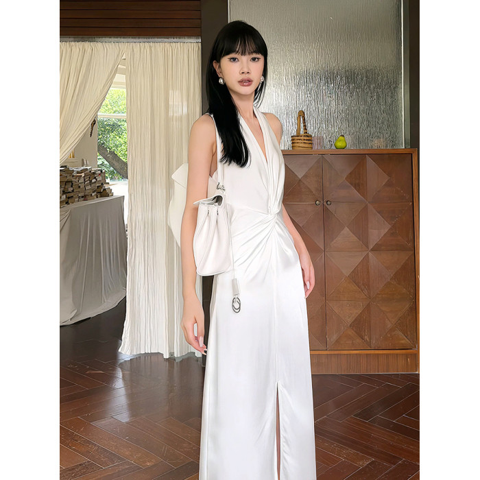 高級感白色緞面掛脖連衣裙女夏法式泰式名媛氣質小禮服生日裙長裙