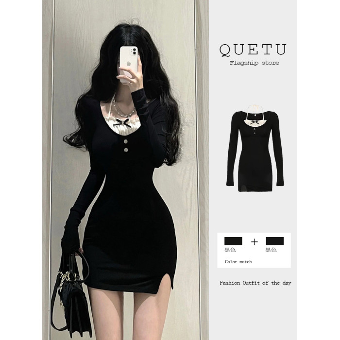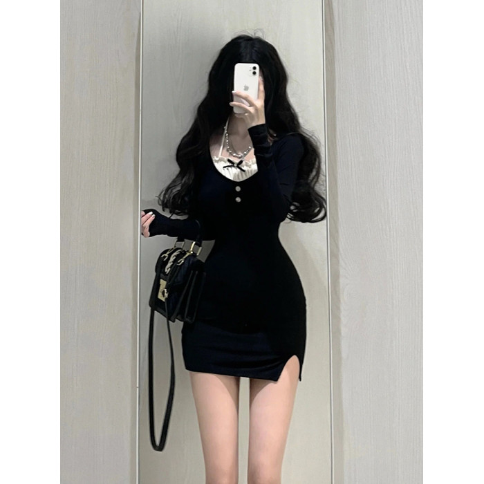 辣妹純欲風性感黑色掛脖長袖連衣裙女秋季緊身顯瘦約會包臀短裙子