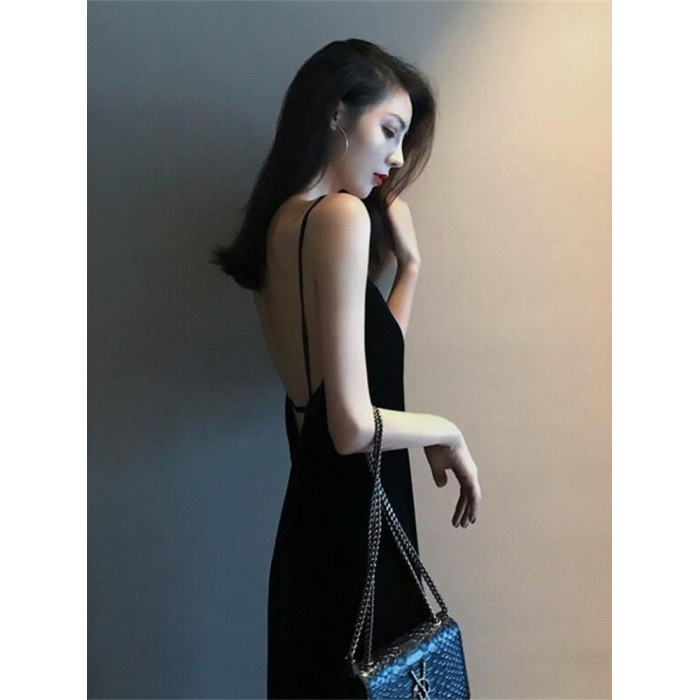 赫本小黑裙黑色高冷禦姐風吊帶連衣裙女夏季法式性感露背開叉長裙