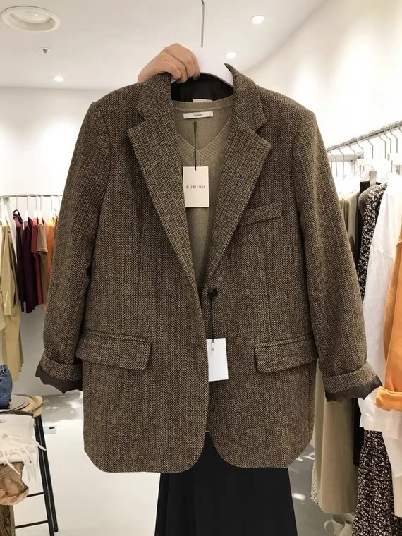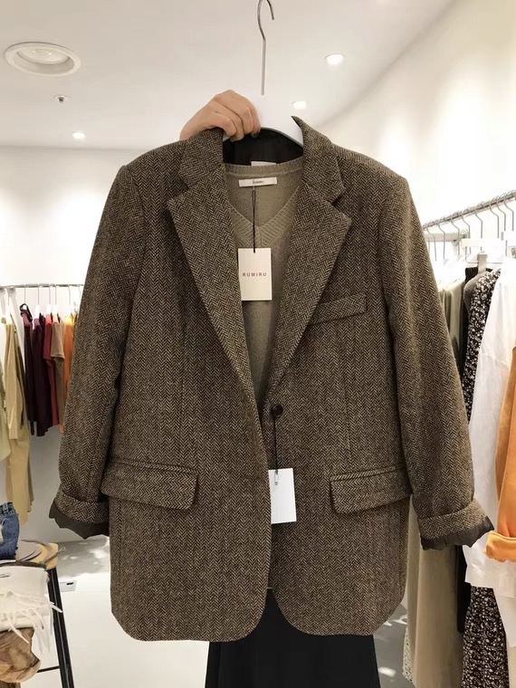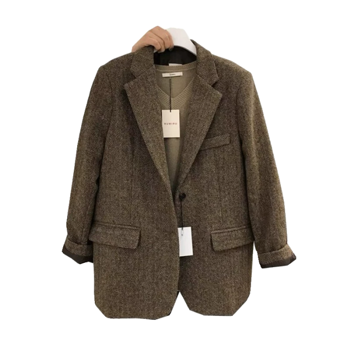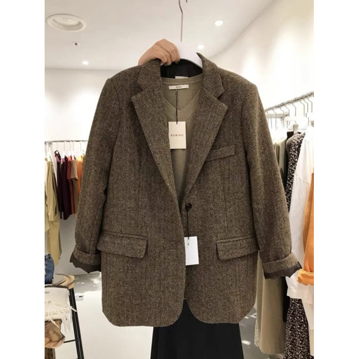 東大門秋冬加厚呢子西服上衣新款韓版復古人字紋毛呢小西裝外套女