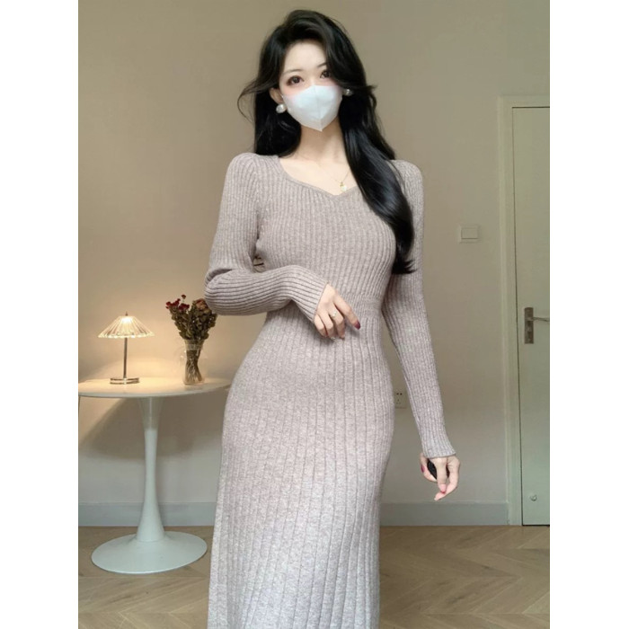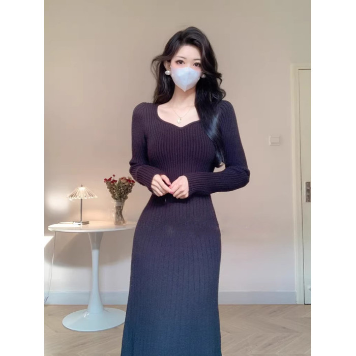 大衣內搭長袖針織連衣裙子女秋冬長款輕奢高級感氣質修身打底長裙