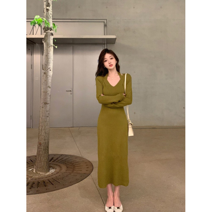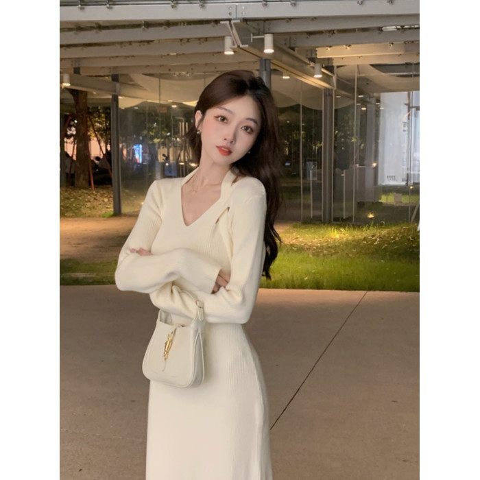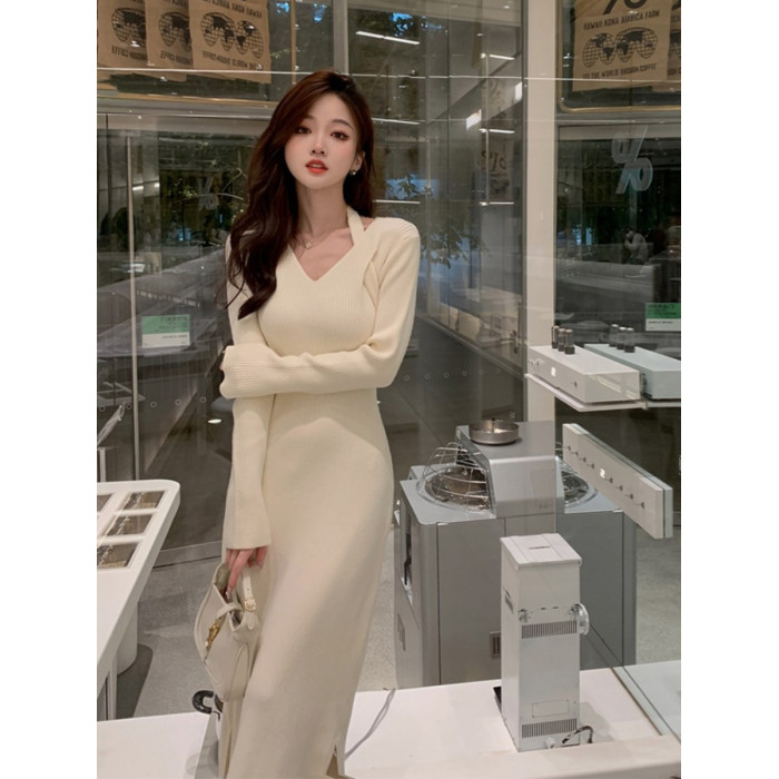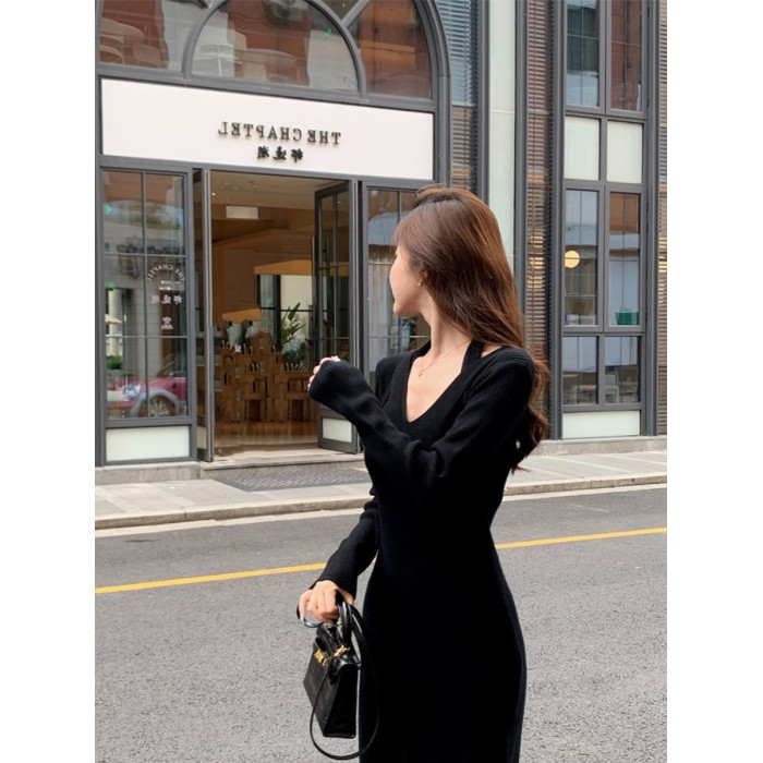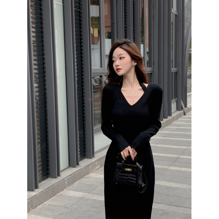 2024冬季流行爆款設計感掛脖修身針織連衣裙女收腰顯瘦新款長裙
