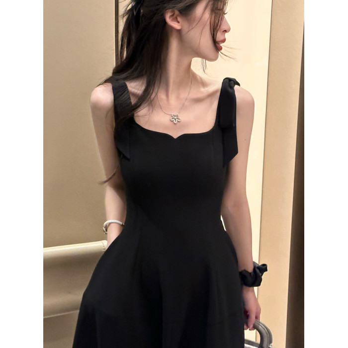 法式赫本風黑色吊帶連衣裙女夏季新款輕奢氣質收腰顯瘦a字長裙子