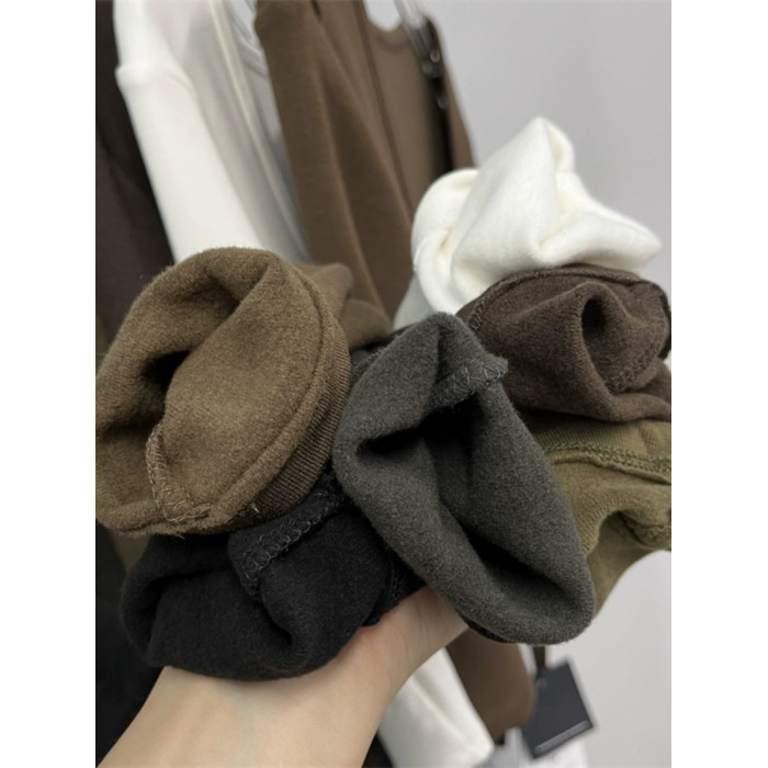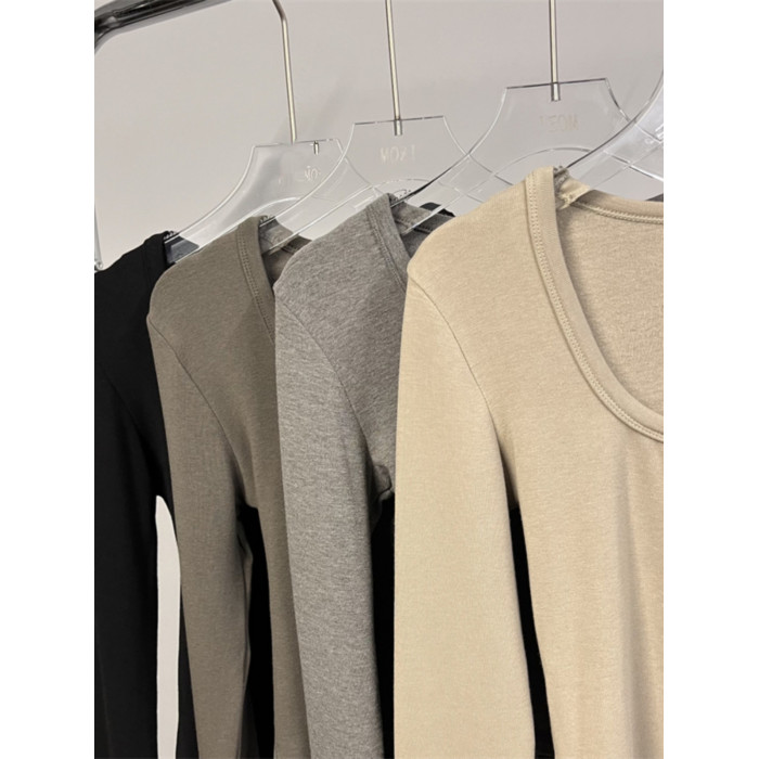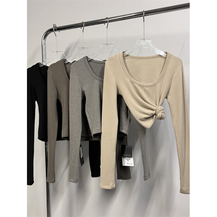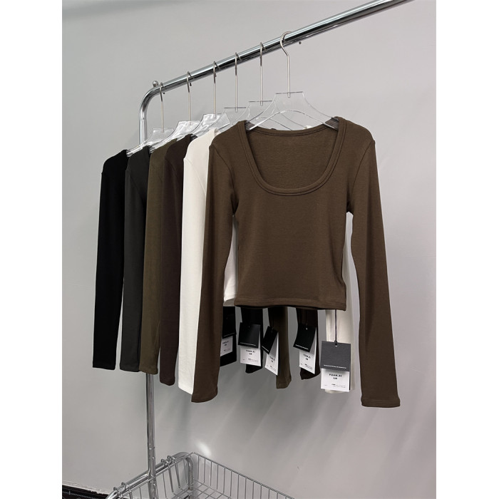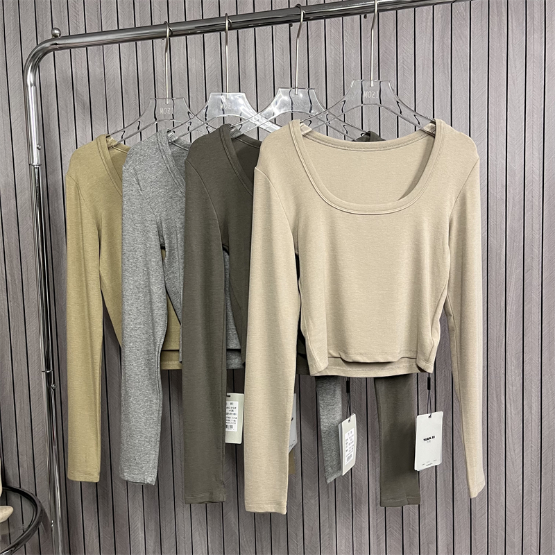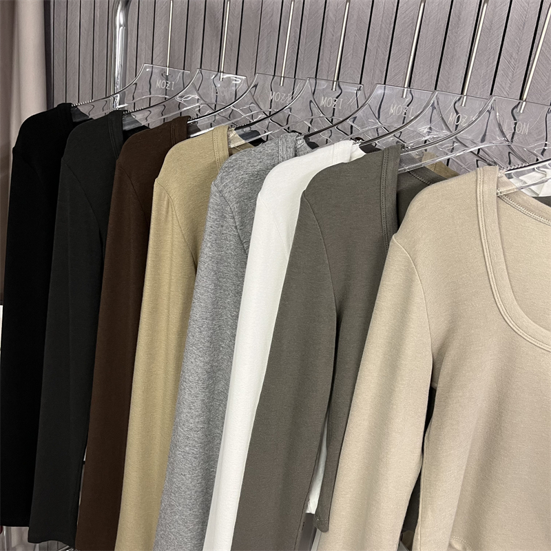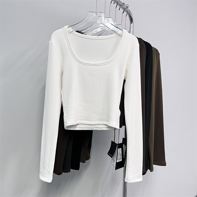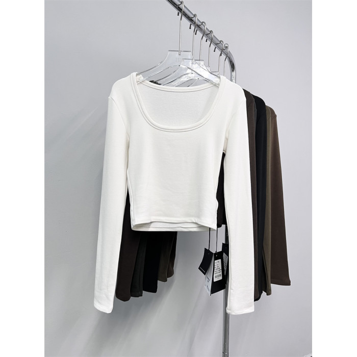 元熙8078秋冬新款純色簡約百搭高彈修身短款U領長袖T恤女加絨上衣