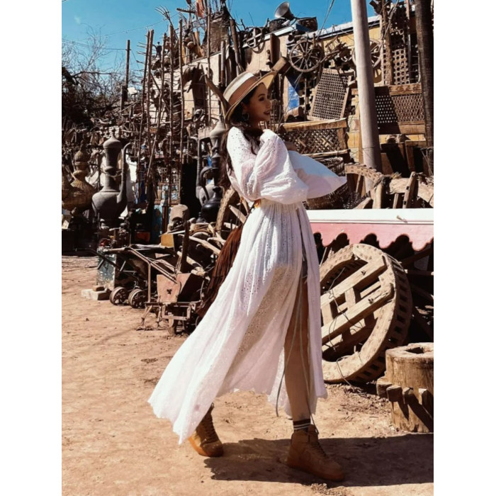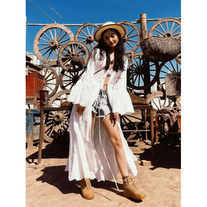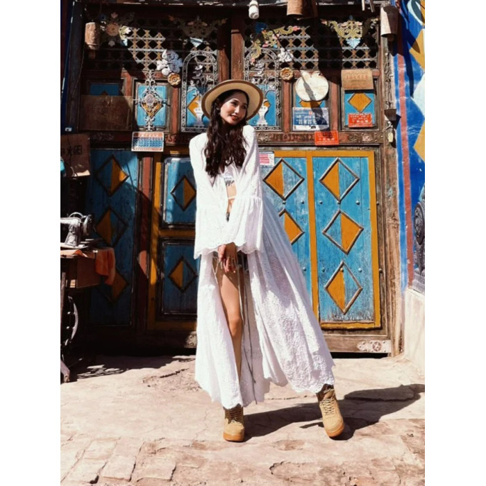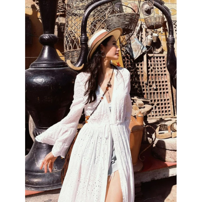 法式鏤空開衫外套女喇叭袖休閒海邊度假風長款刺綉超仙白色連衣裙