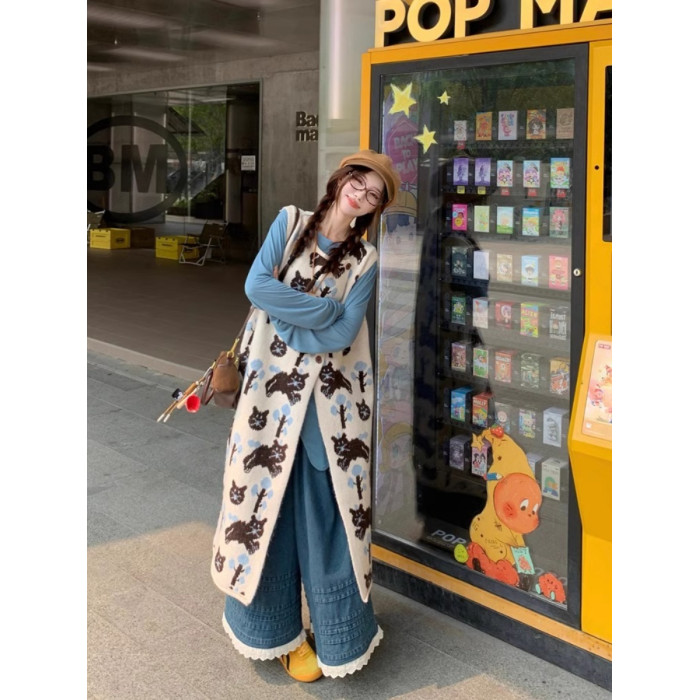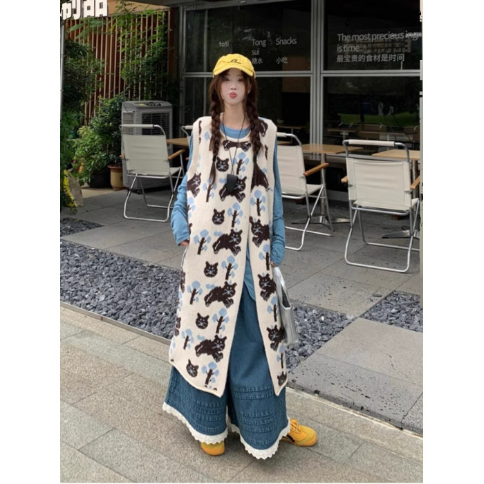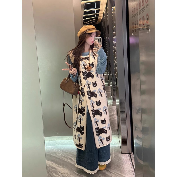 卡通貓咪提花背心連衣裙女秋冬季新款復古寬松顯瘦打底針織長裙子
