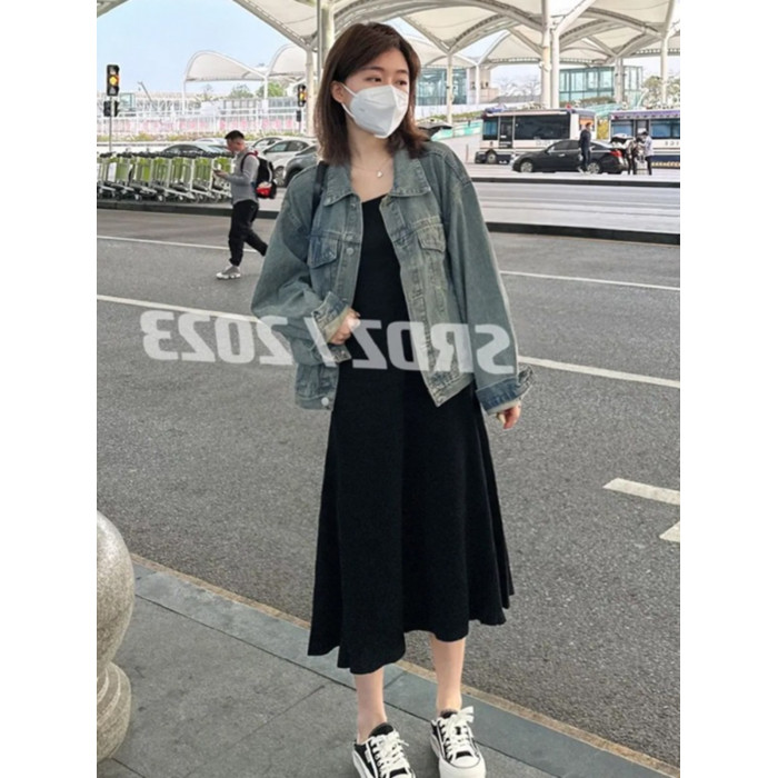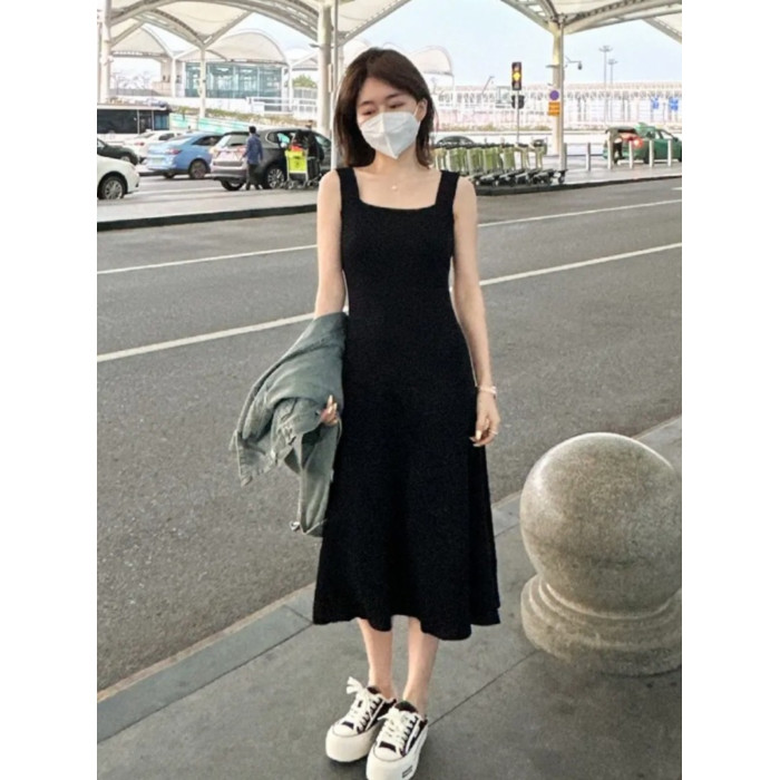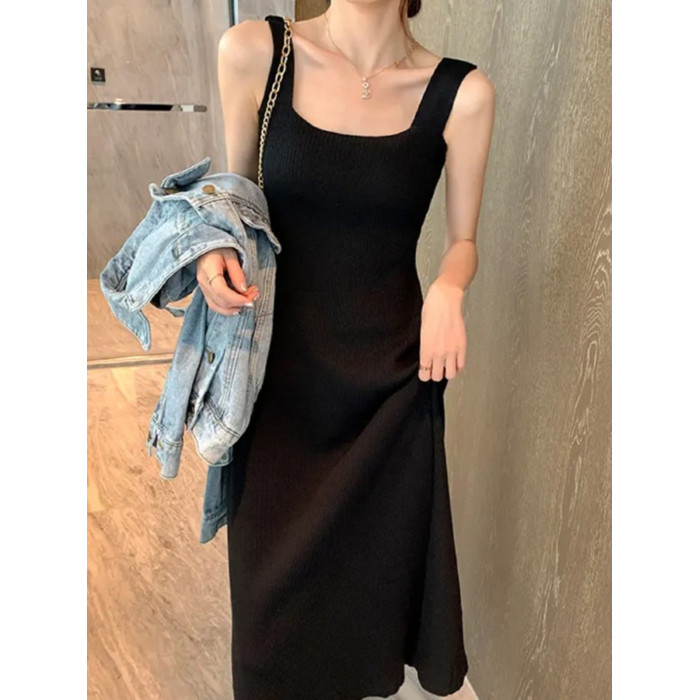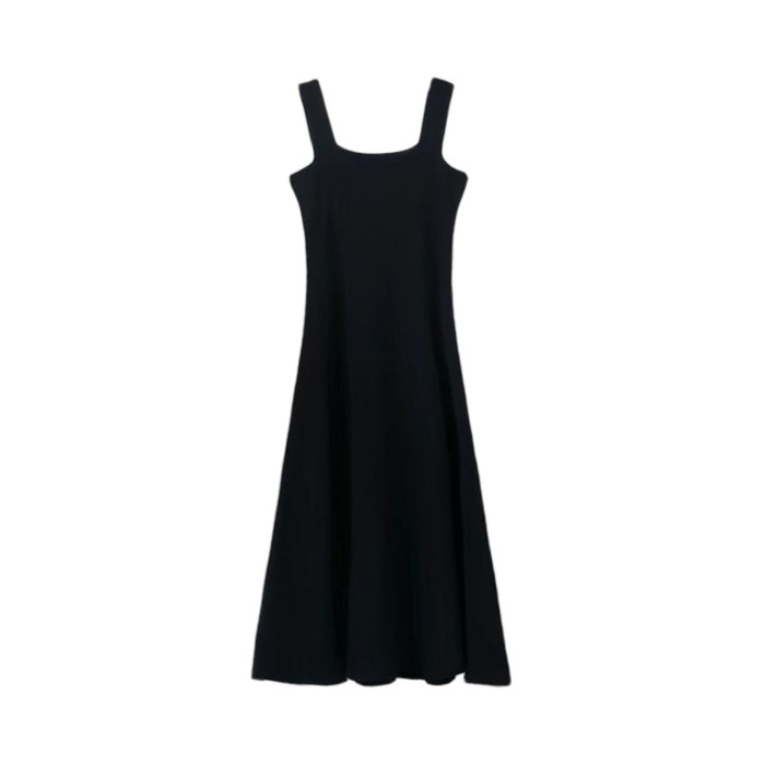 2025新款針織吊帶連衣裙女一字領遮肉顯瘦收腰中長款內搭打底長裙