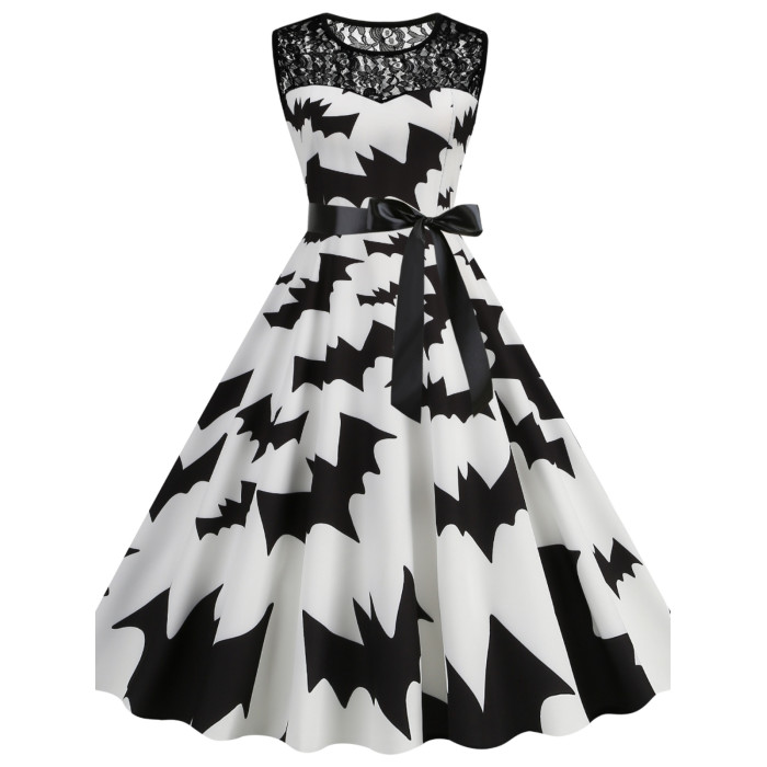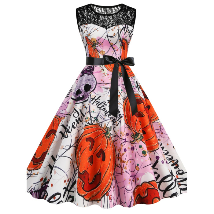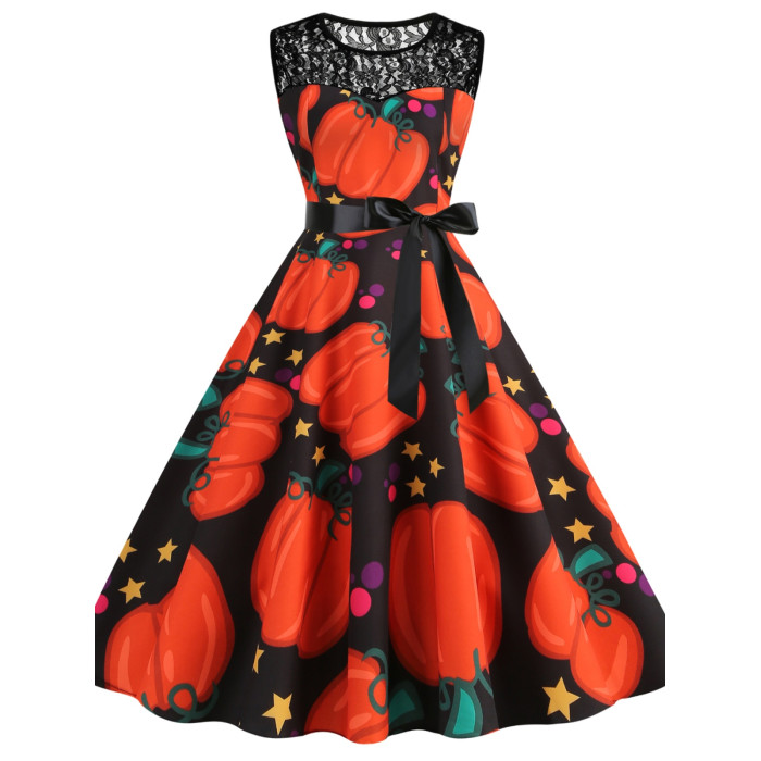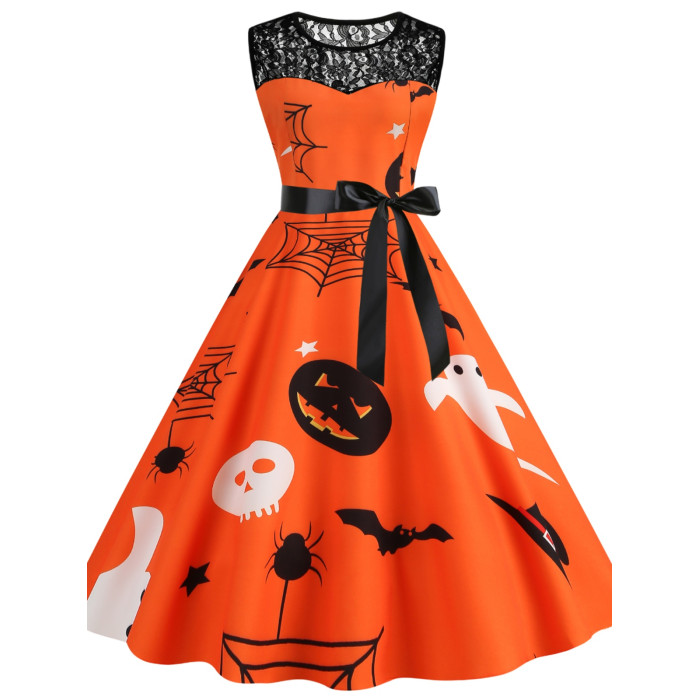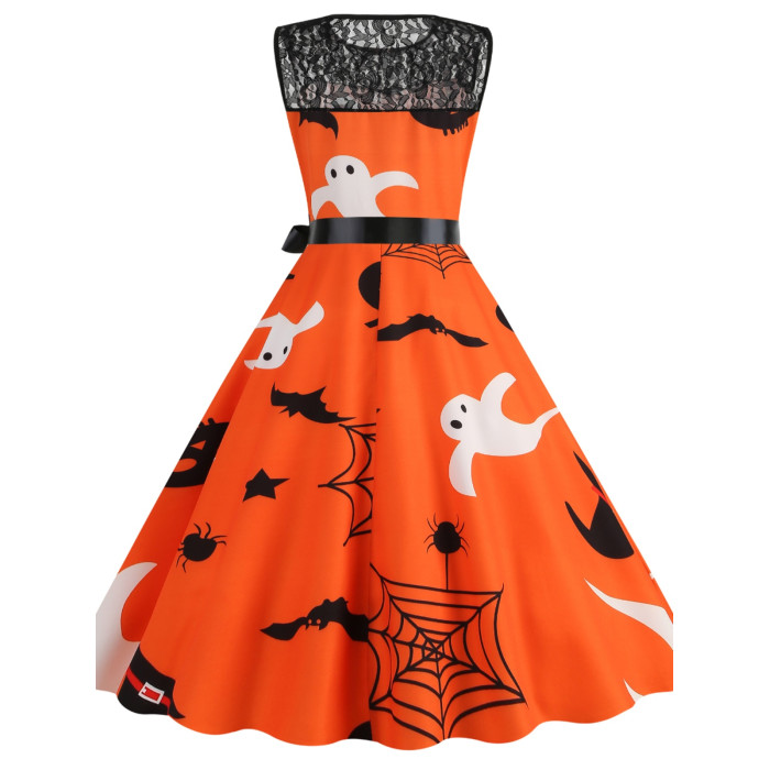 背心裙歐美萬聖節圓領蕾絲拼接南瓜蝙蝠印花修身無袖大擺連衣裙女