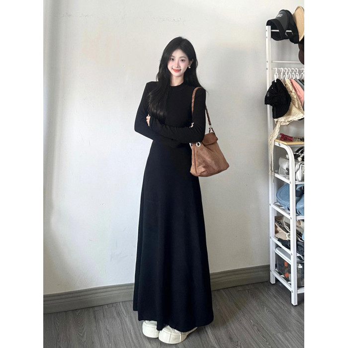 法式氣質赫本風黑色長袖打底連衣裙女秋季高級感收腰修身內搭長裙