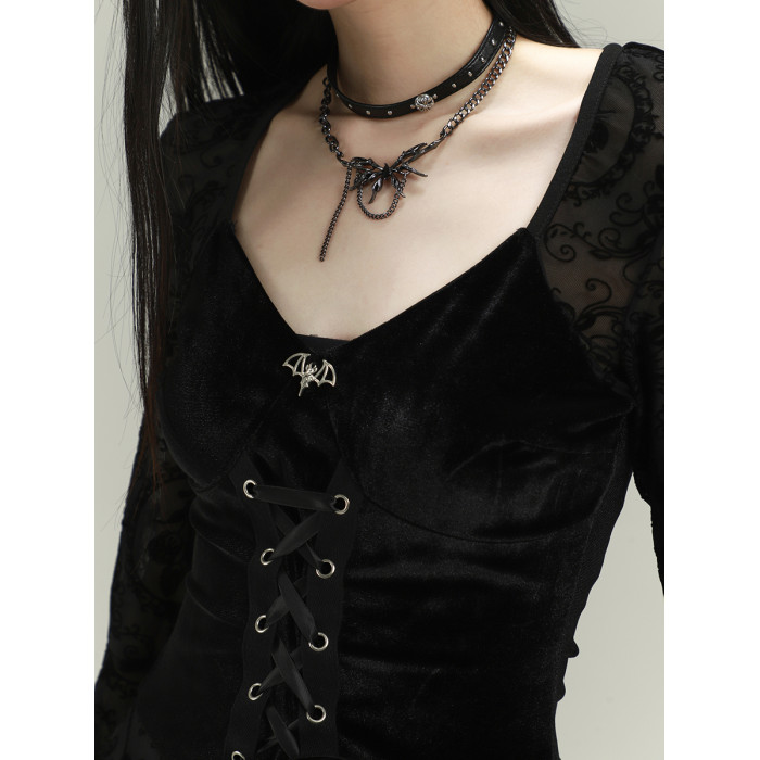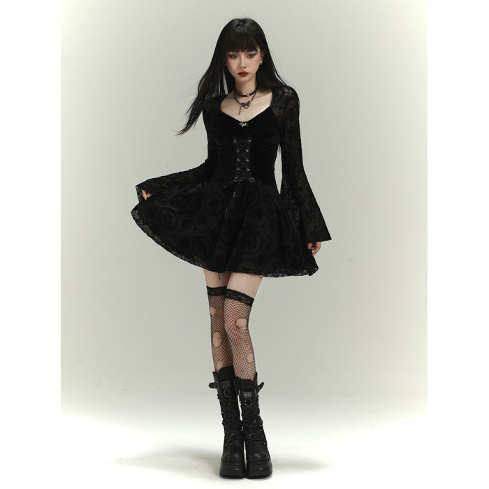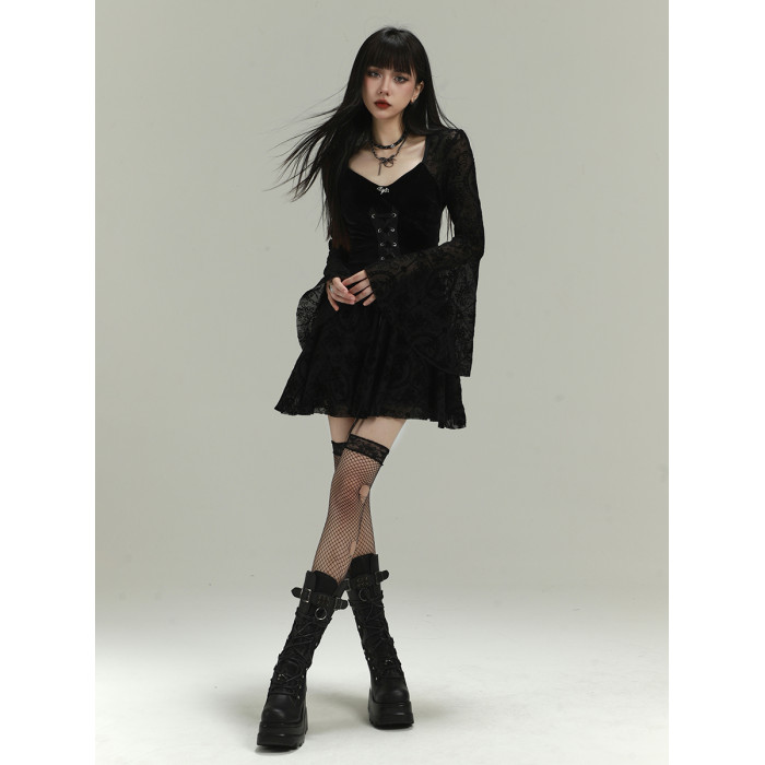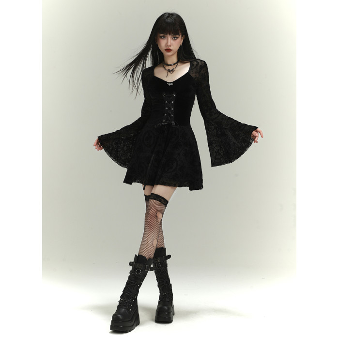 幽靈少女哥特風女裝黑色喇叭袖連衣裙子亞文化萬聖節穿搭cos服裝