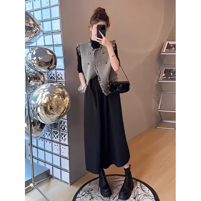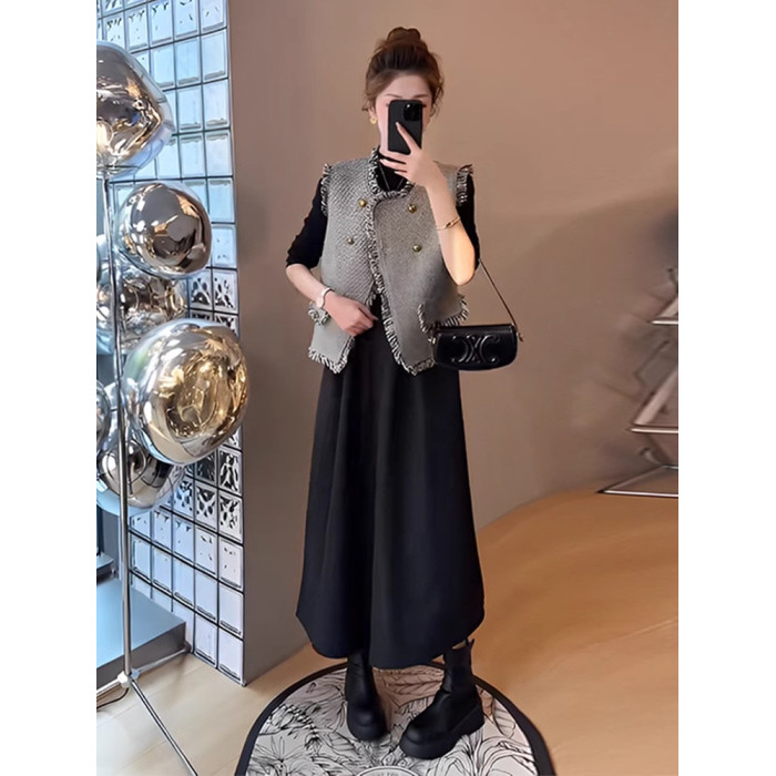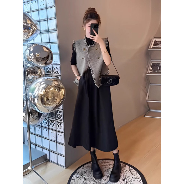 胖mm時尚顯瘦遮肉套裝女大碼秋季新款流蘇馬甲長袖連衣裙子兩件套