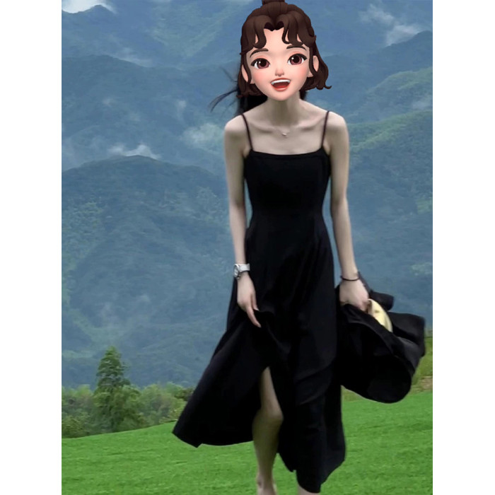 黑色吊帶連衣裙2025新款女夏法式長裙收腰顯瘦長款高級感A字裙子