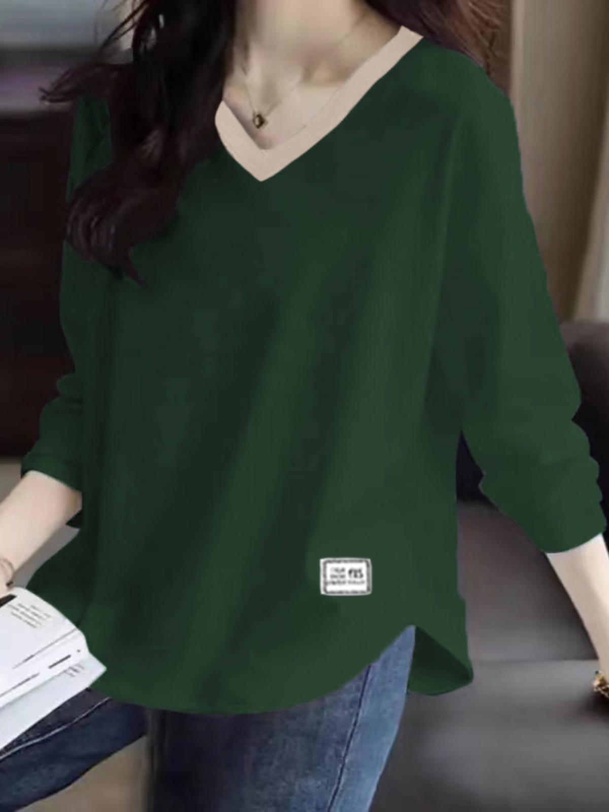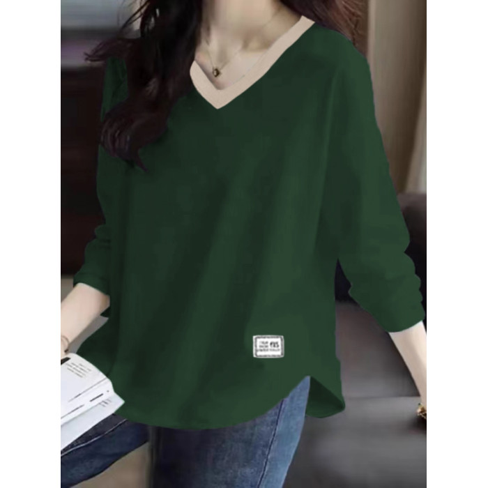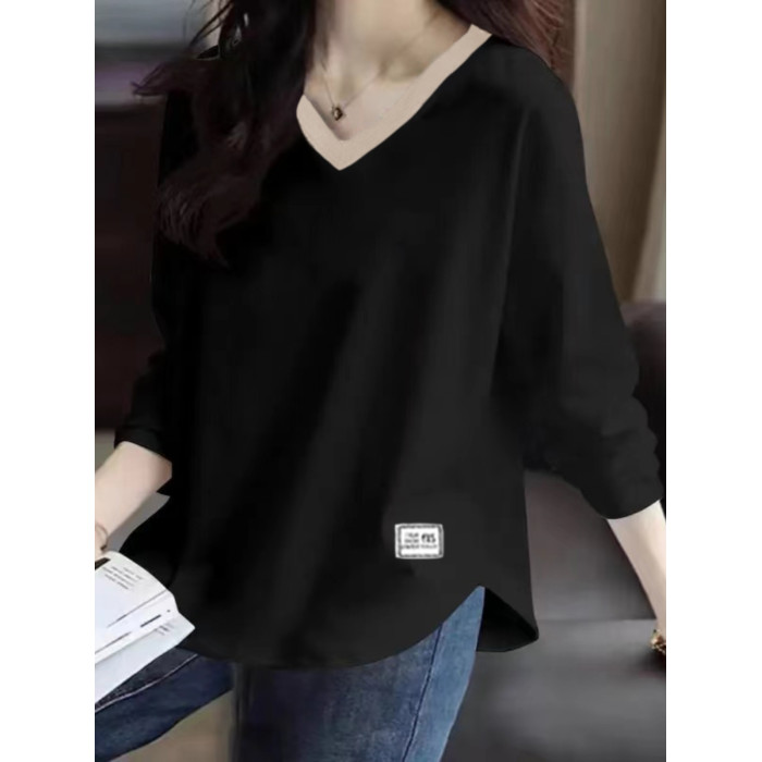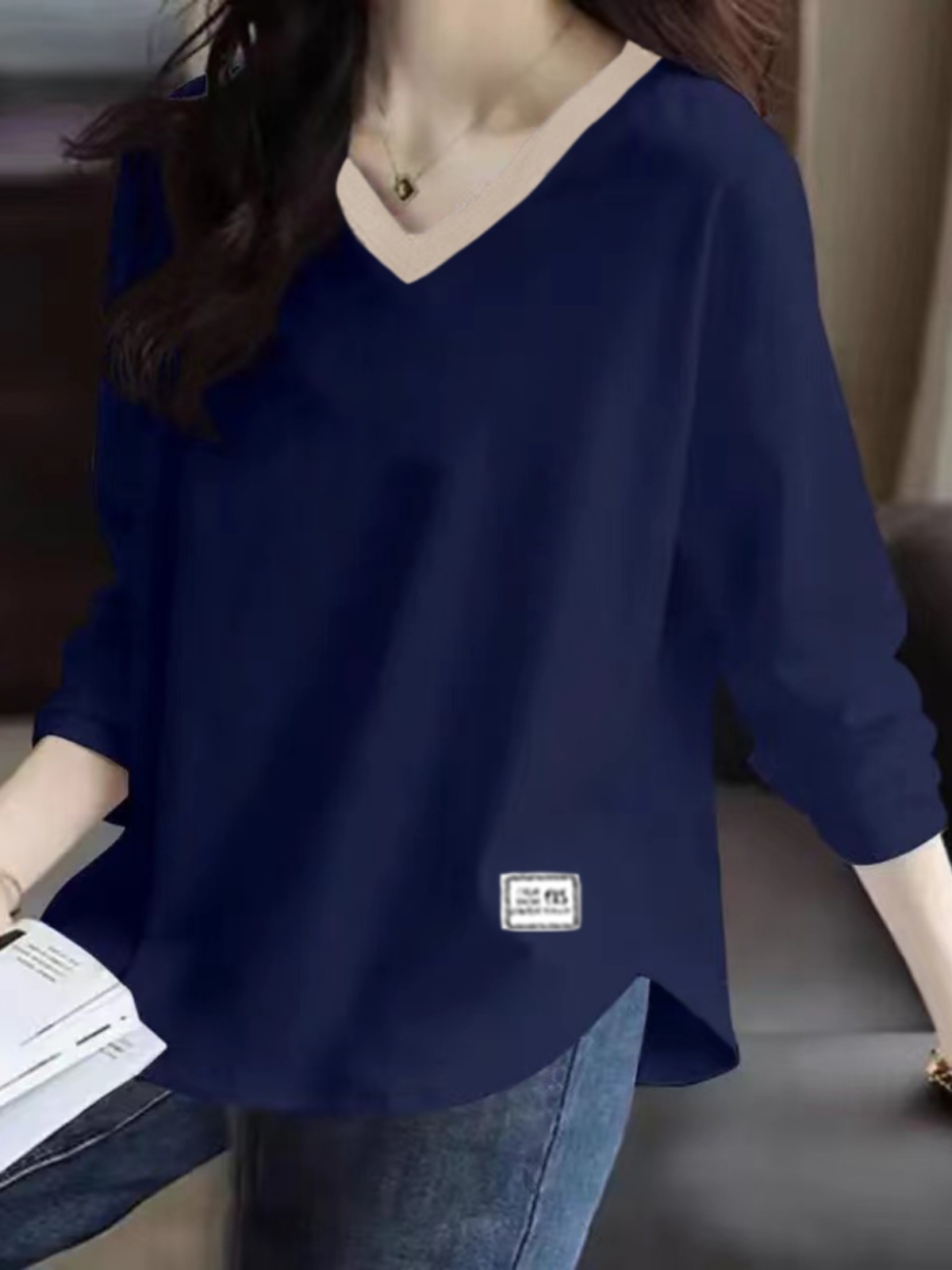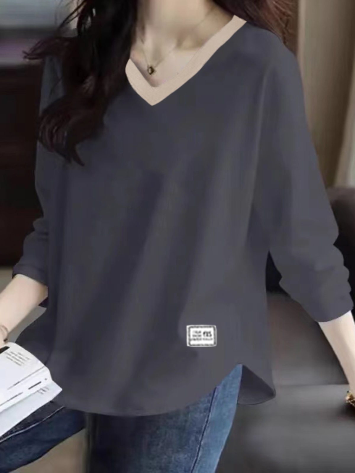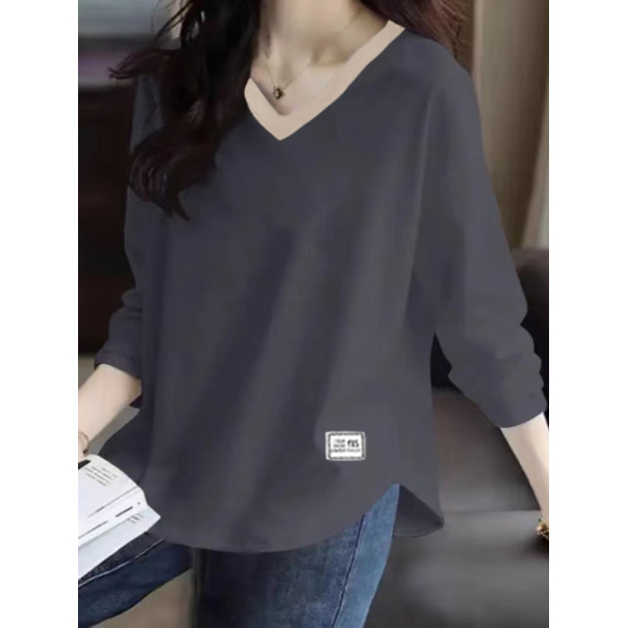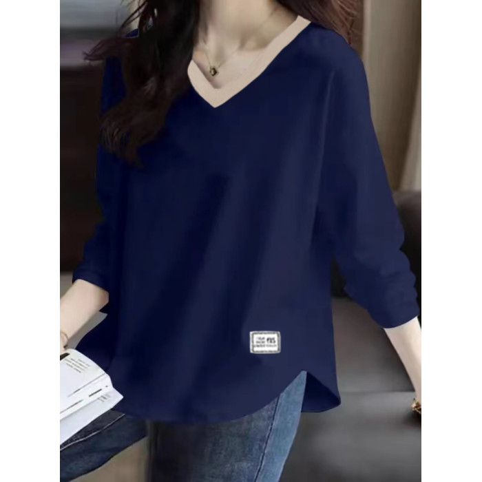 純棉拼色V領長袖T恤女春秋季大碼寬松遮肚顯瘦百搭減齡打底衫上衣