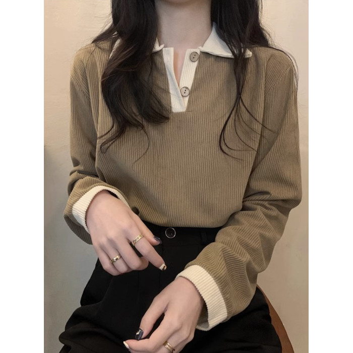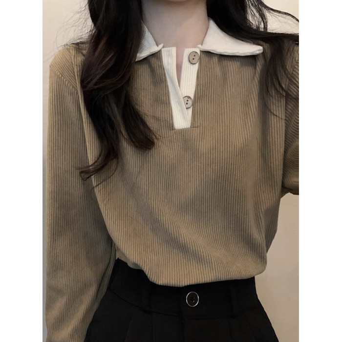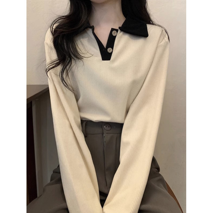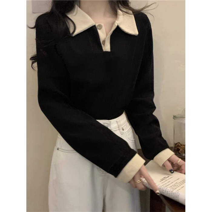 黑色打底衫女春秋款外穿長袖針織衫小個子內搭正肩t恤polo領上衣