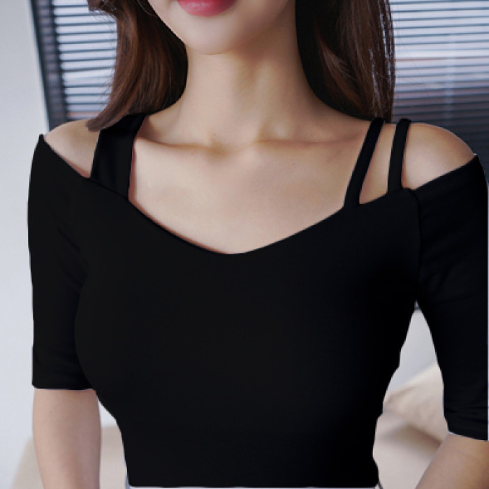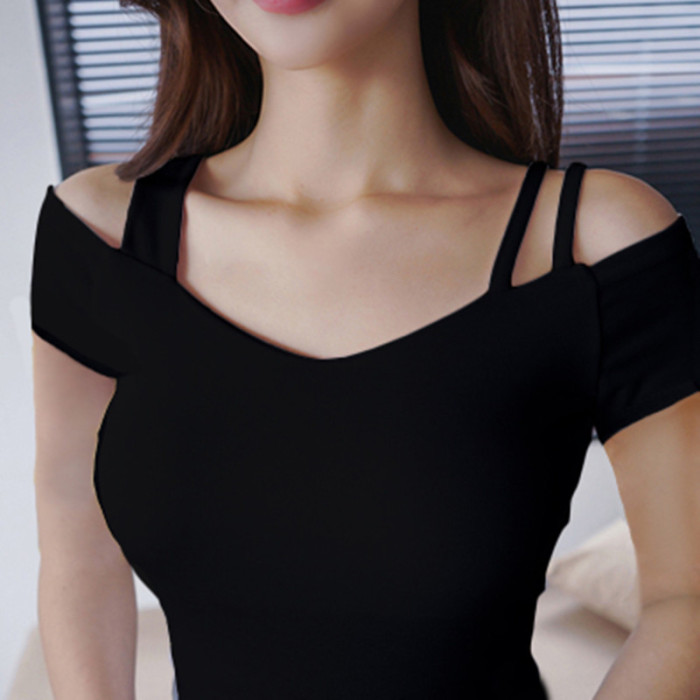 2024春季新款韓版緊身黑色打底衫漏肩t恤女短袖V領顯瘦一字領上衣