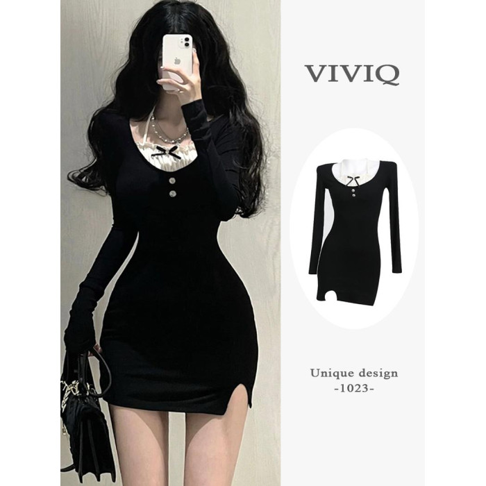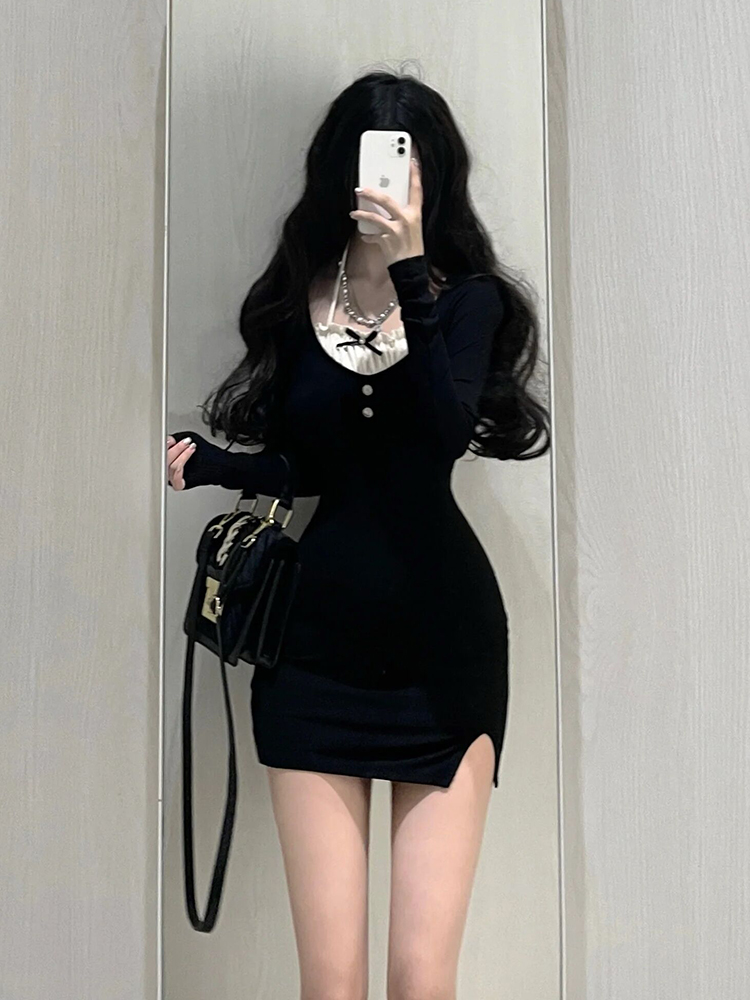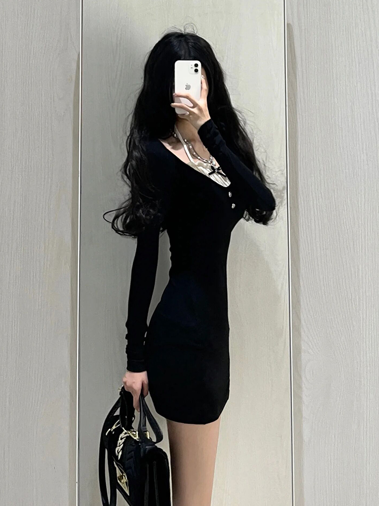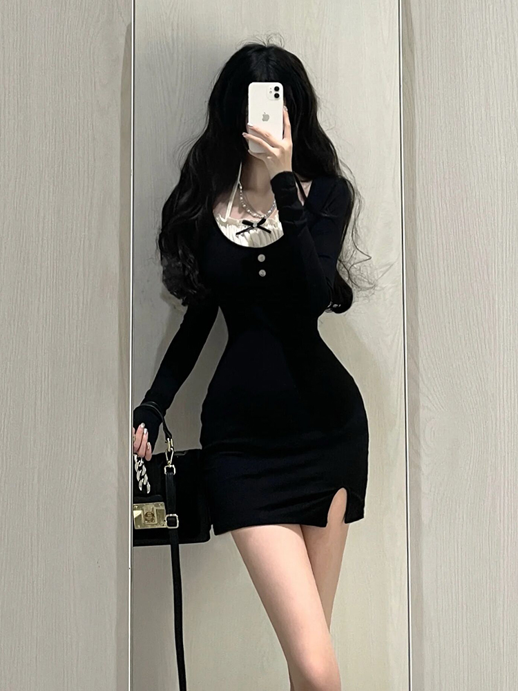 禦姐風性感黑色長袖連衣裙女秋季小個子修身掐腰顯瘦約會包臀短裙