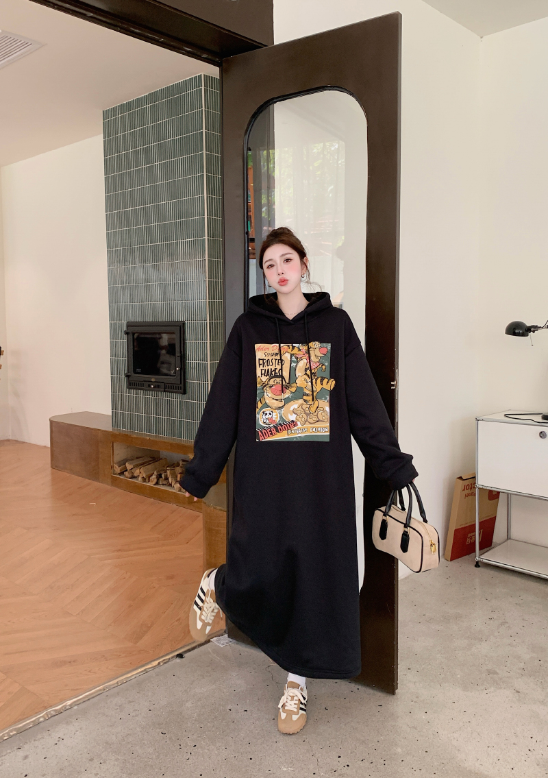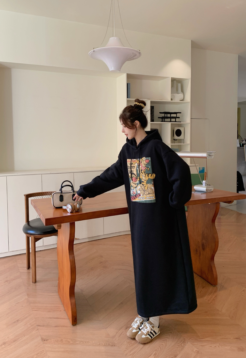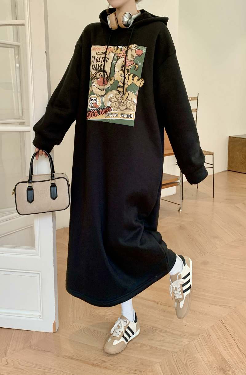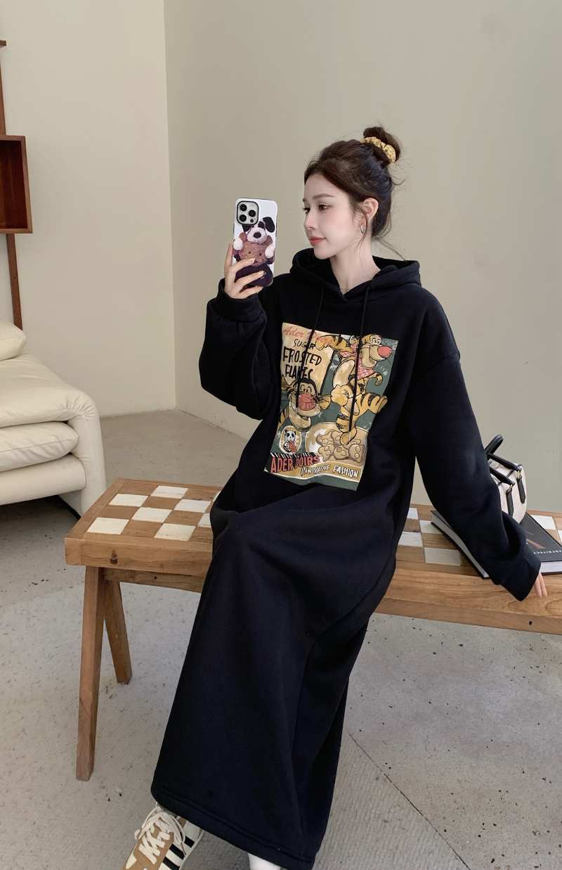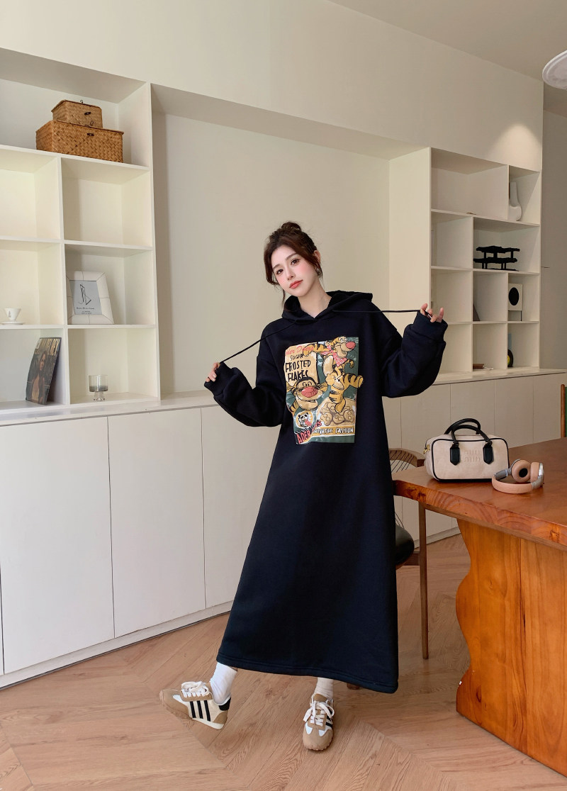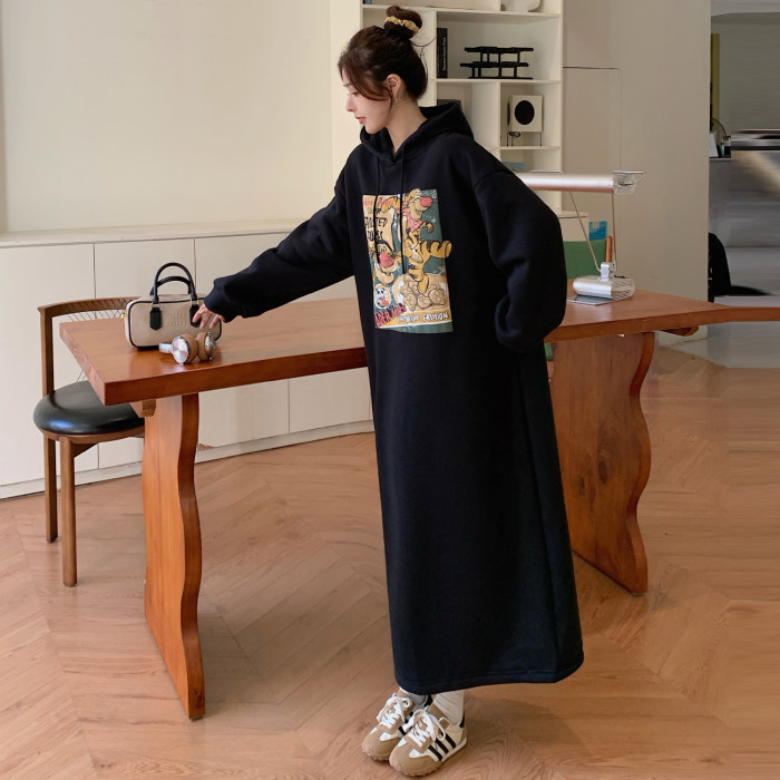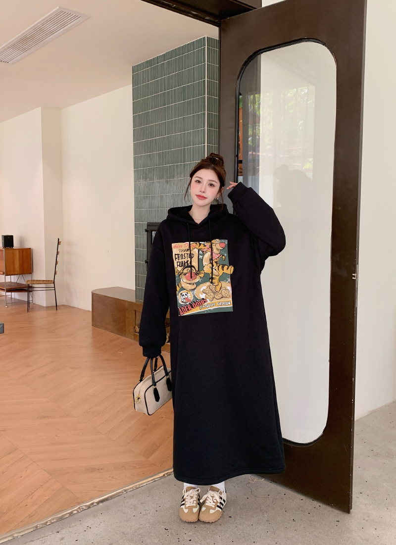 加絨加厚卡通印花大碼衛衣裙女冬季胖mm寬松顯瘦嬰兒絨連帽連衣裙