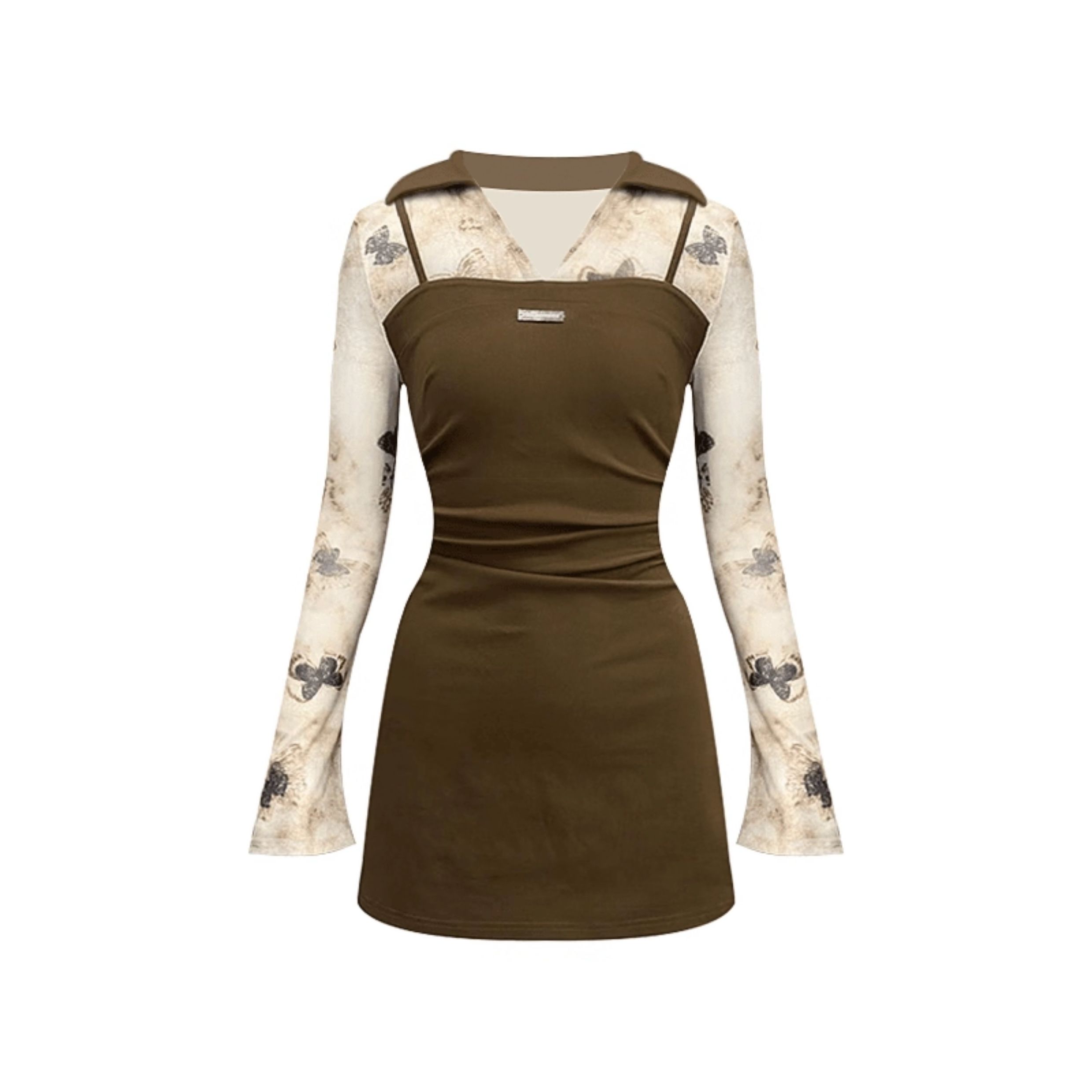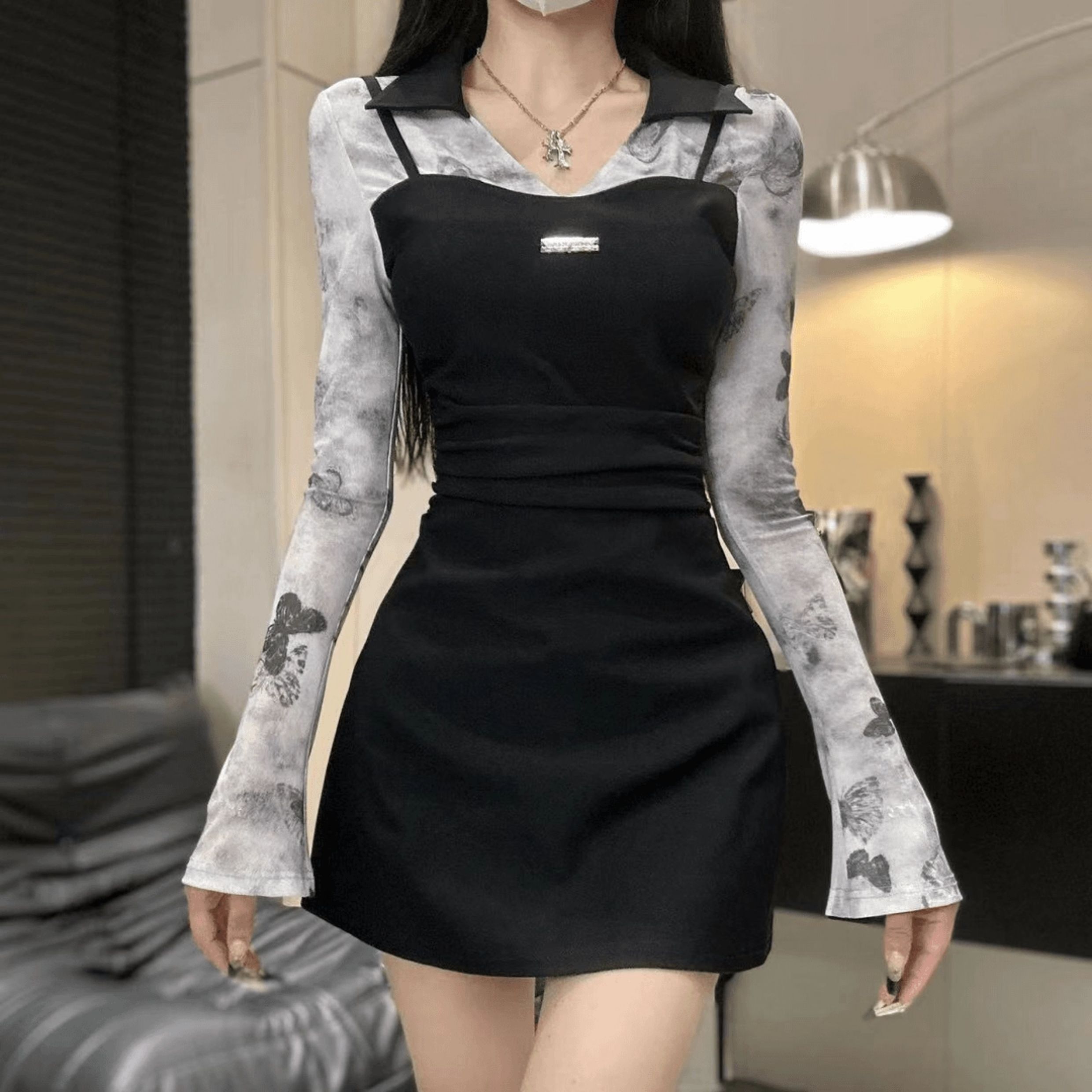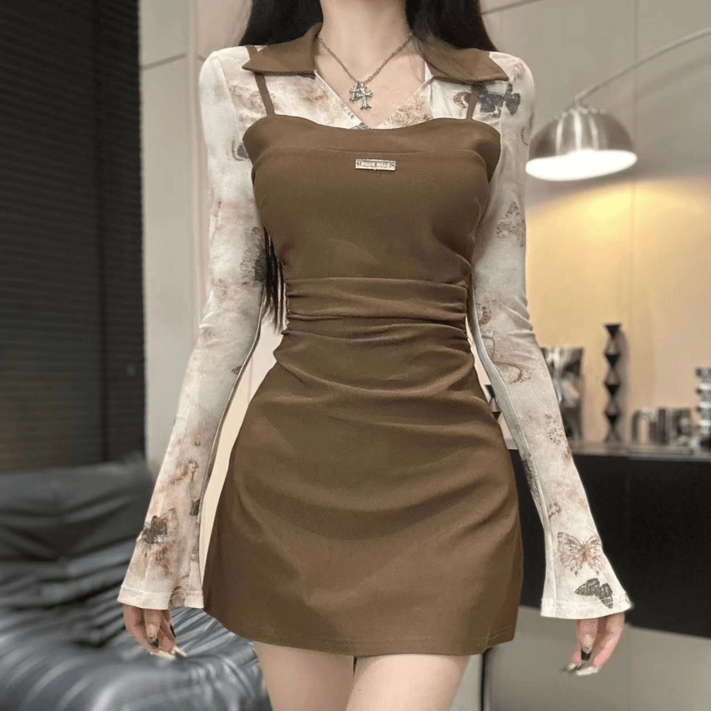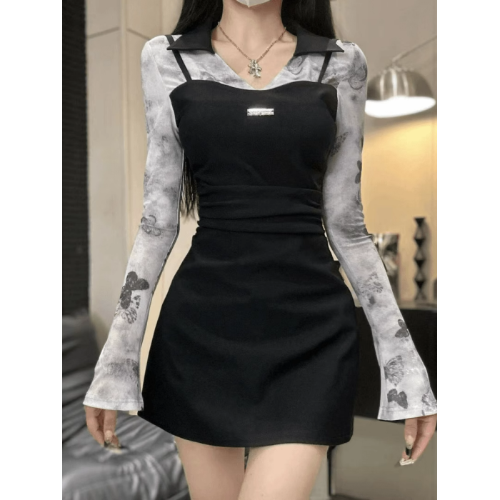 美式辣妹拼接假兩件polo領長袖連衣裙女秋季褶皺收腰顯瘦包臀短裙
