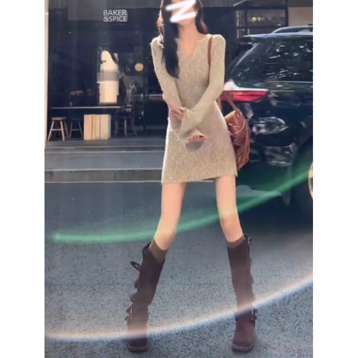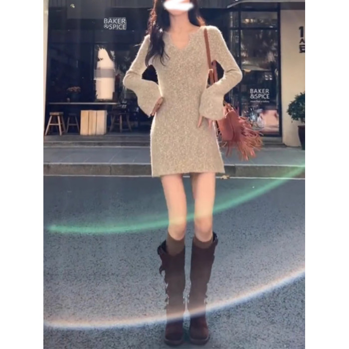 打底V領針織連衣裙女秋冬季配大衣內搭毛衣裙修身內搭包臀短裙子