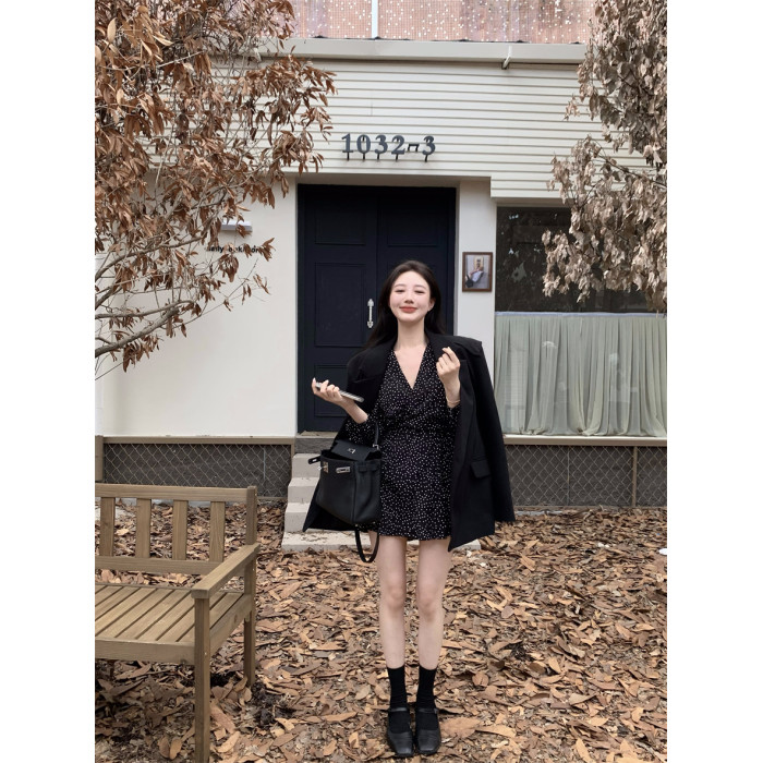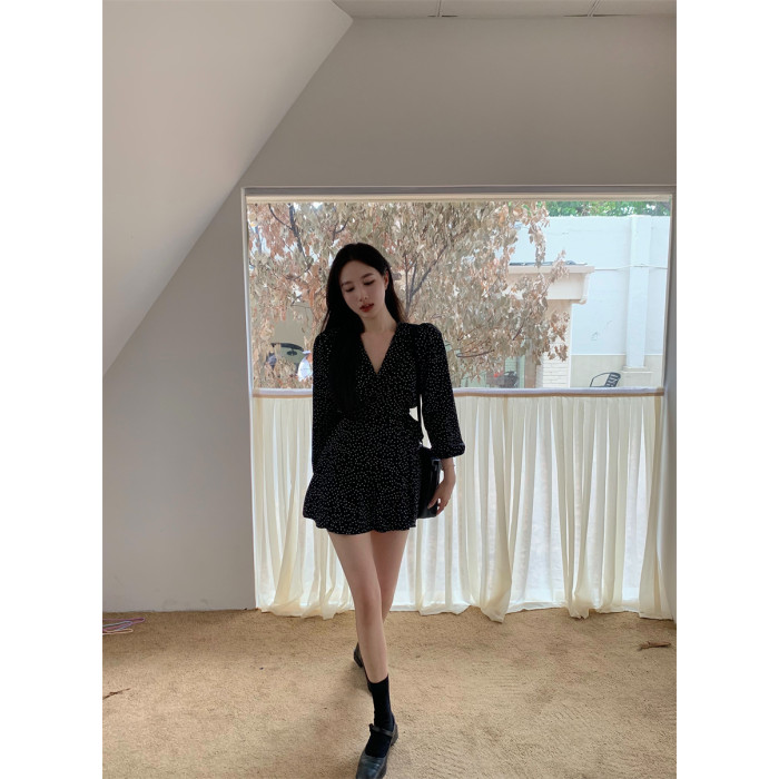 PPHOME媮媮藏不住~露思桑稚V領長袖波點連衣裙女收腰泡泡袖雪紡裙