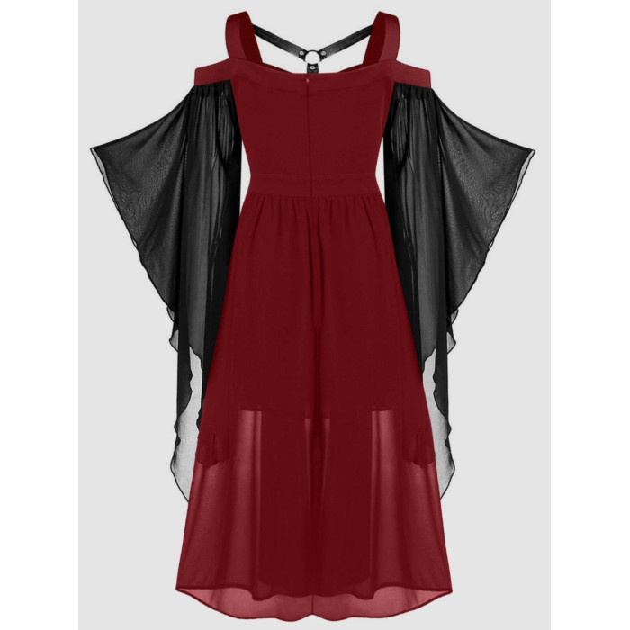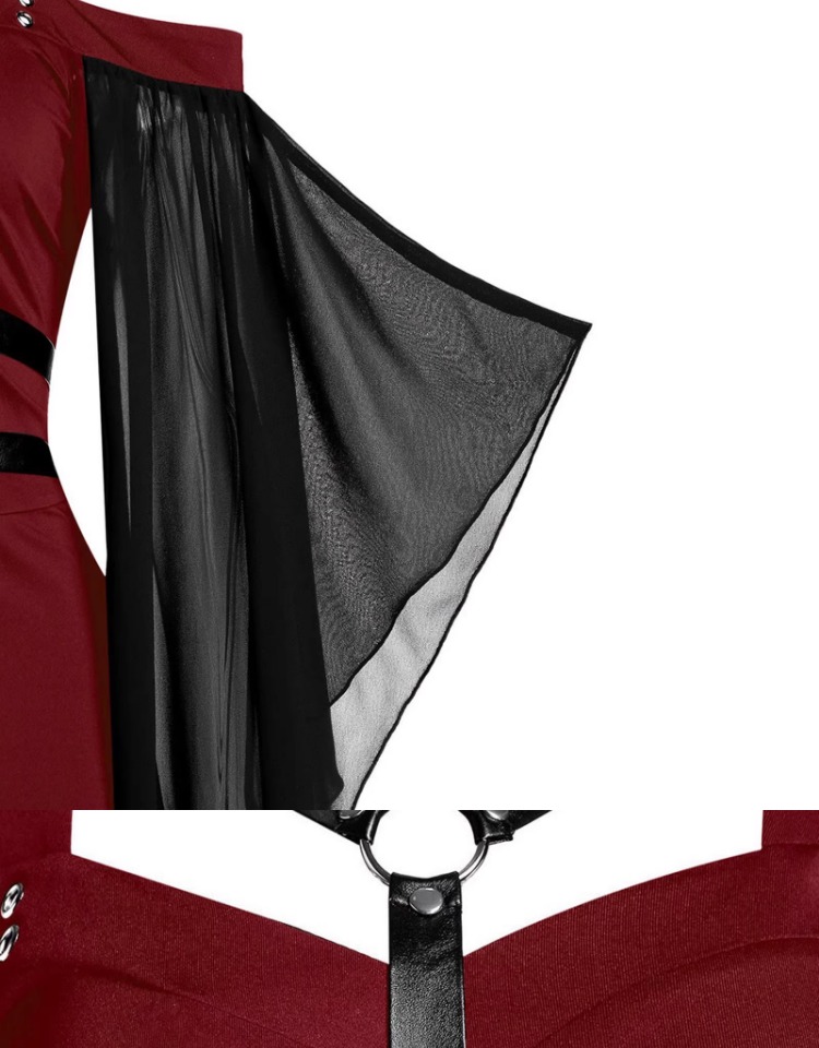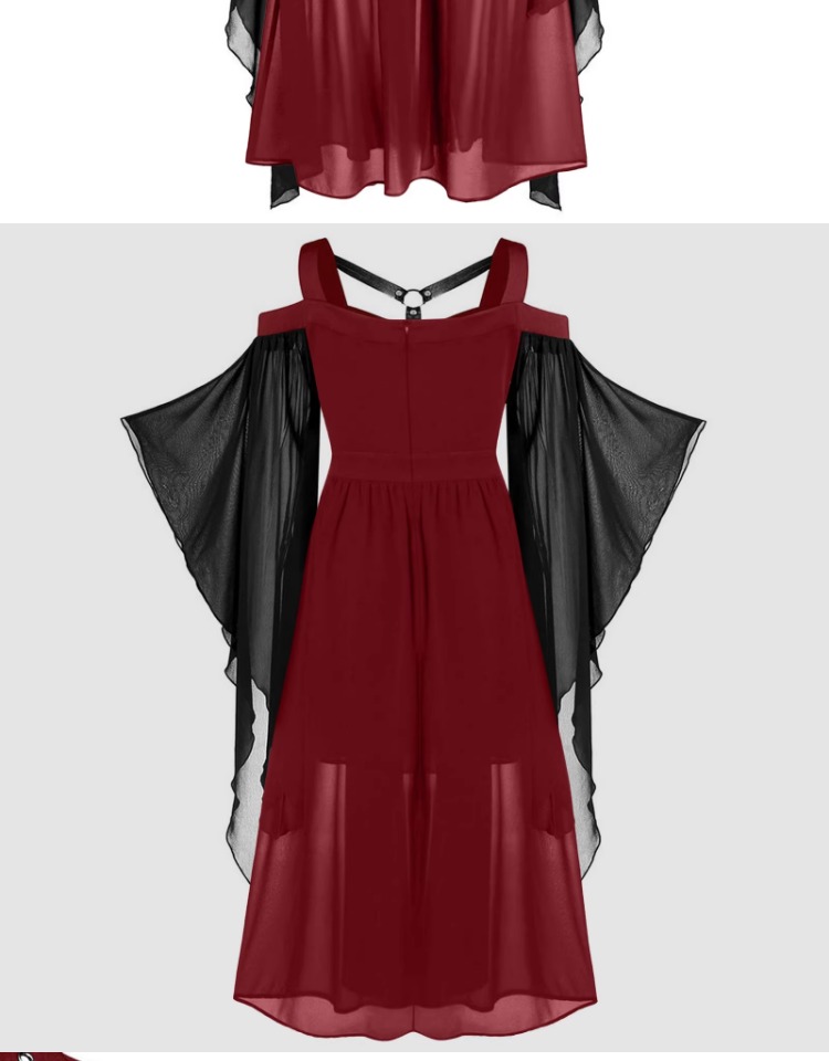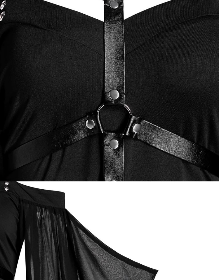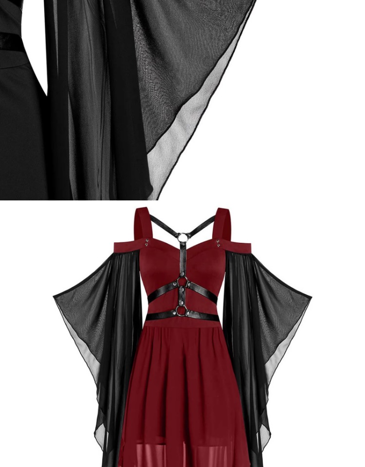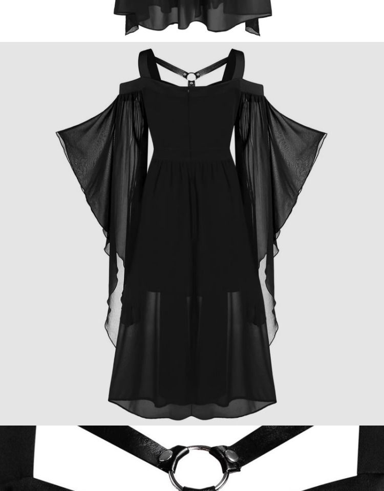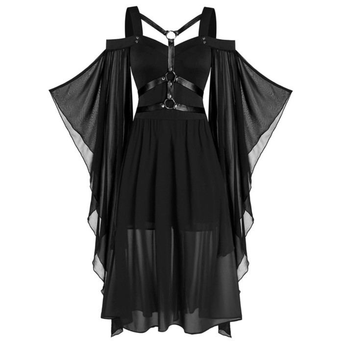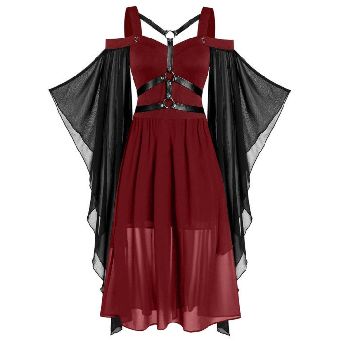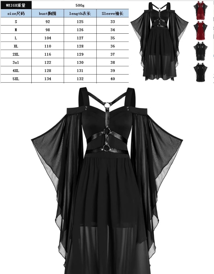 大碼女裝哥特式不規則萬聖節女巫吊帶綁帶喇叭袖大擺連衣裙S-5XL