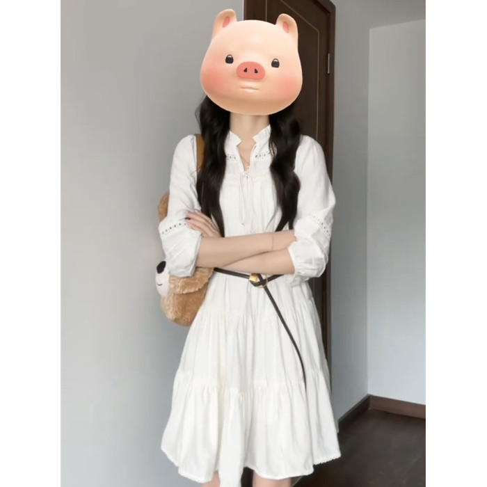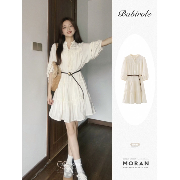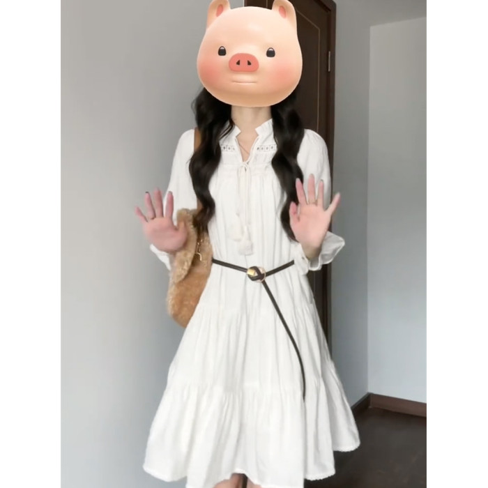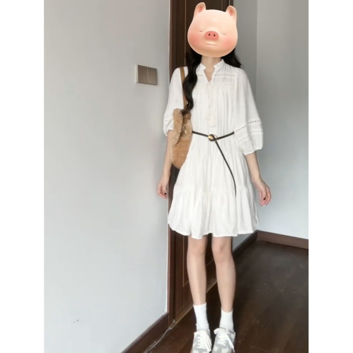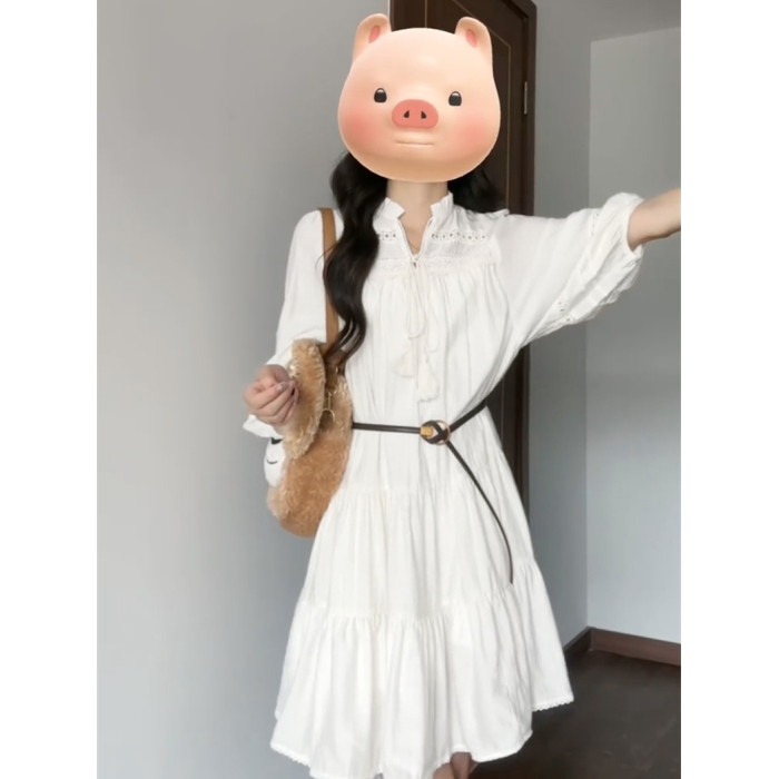 法式茶歇白色系帶V領腰帶鏤空連衣裙子女夏收腰顯瘦2025早秋新款