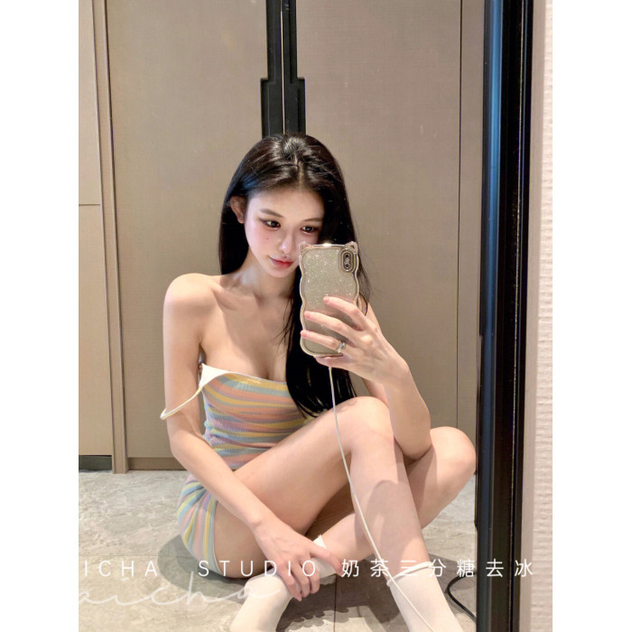 夏季新款吊帶條紋彩虹包臀短裙修身顯瘦小個子純欲風內搭連衣裙女