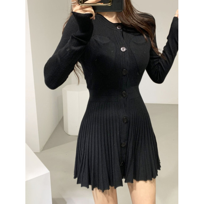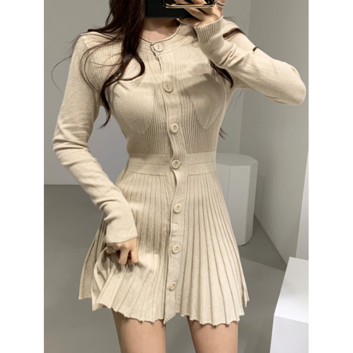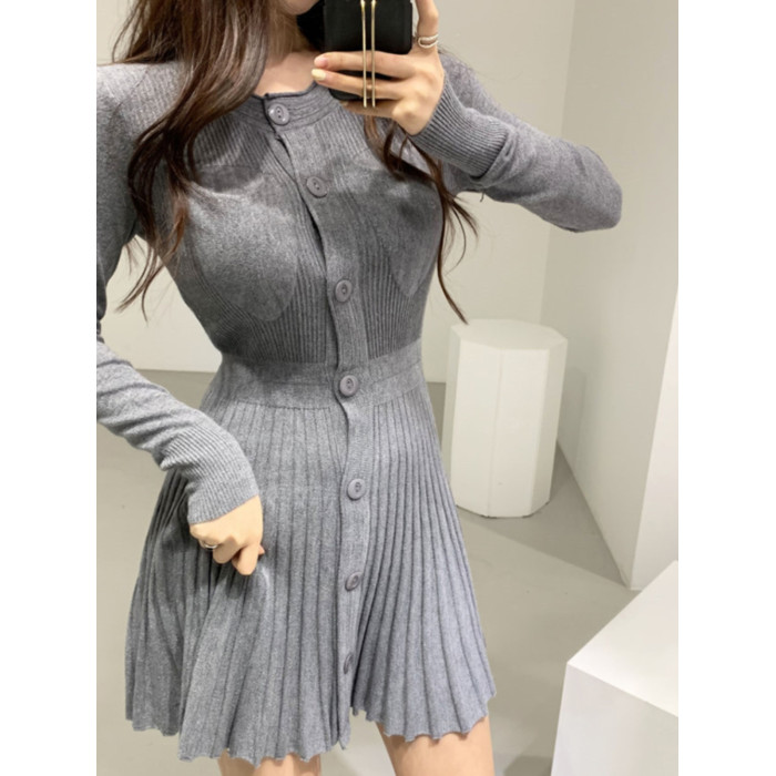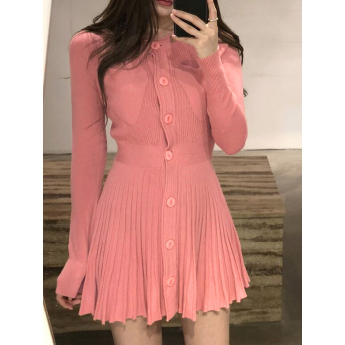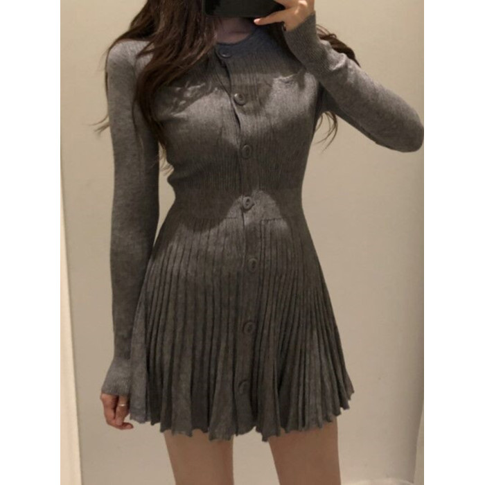 韓國chic復古網紅洋氣時尚修身顯瘦百搭毛針織打底連衣裙百褶短裙