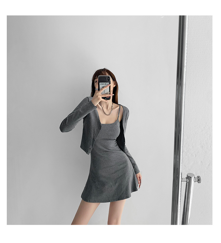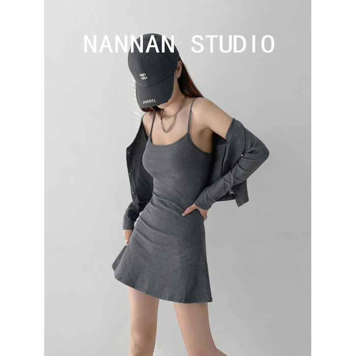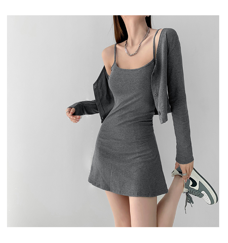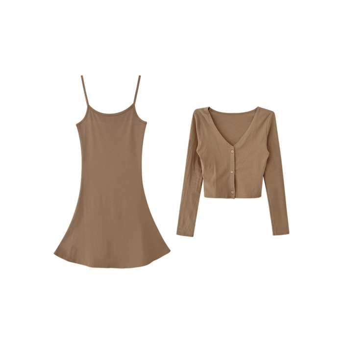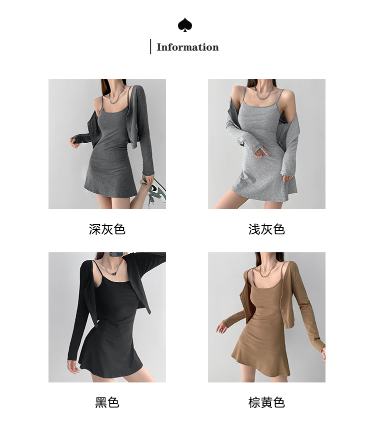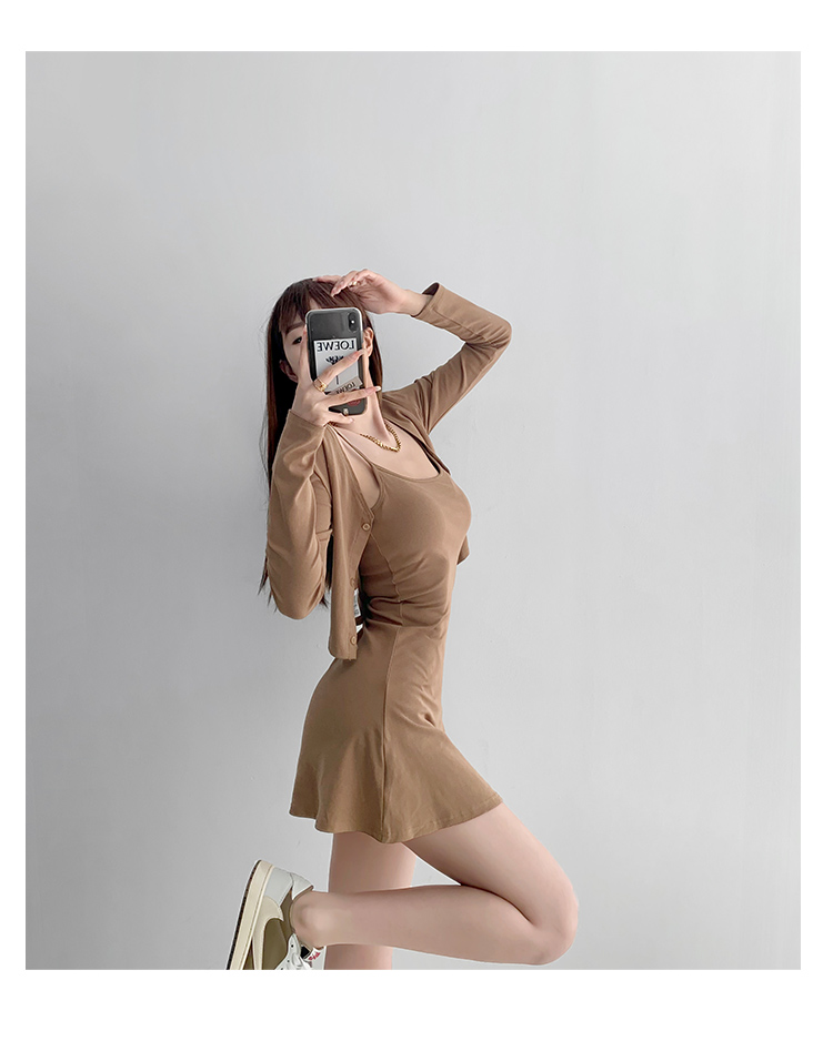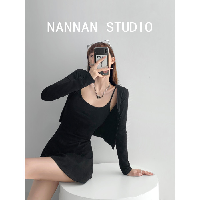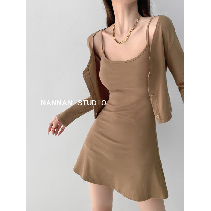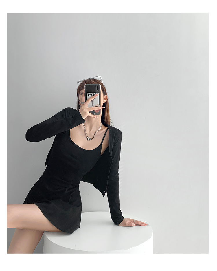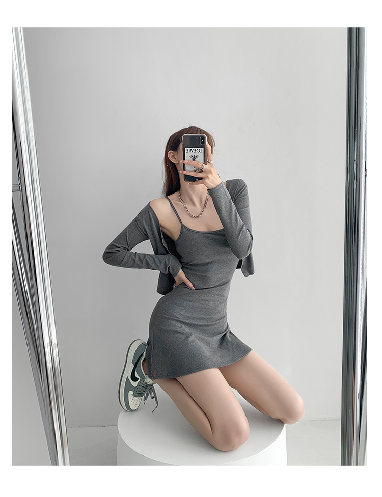 歐美性感修身短款魚尾吊帶連衣裙外搭長袖針織坎肩開衫兩件套女春