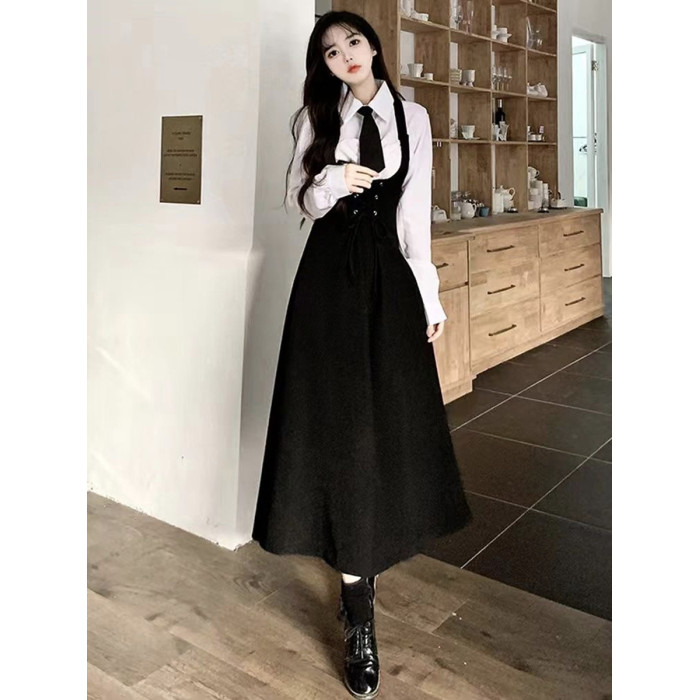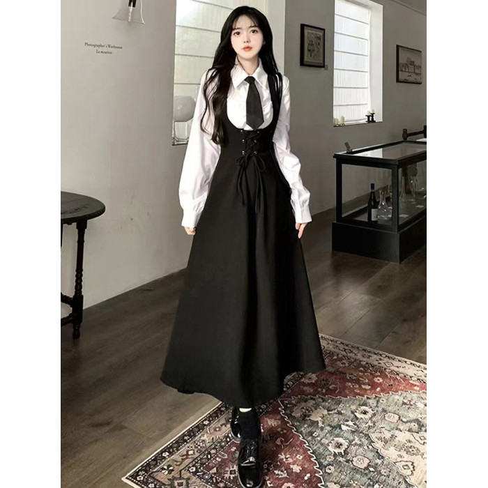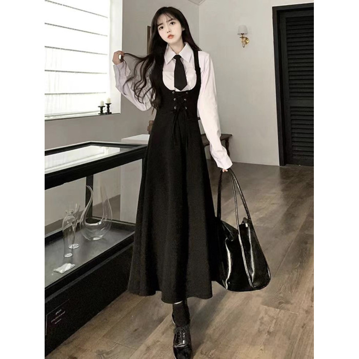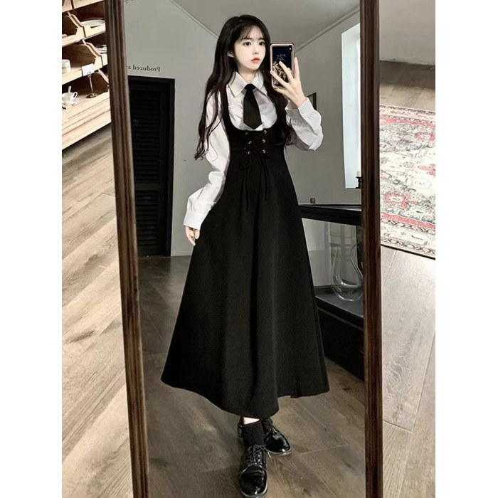 法式赫本風背帶連衣裙女春秋新款百搭顯瘦高級感襯衫收腰兩件套裝
