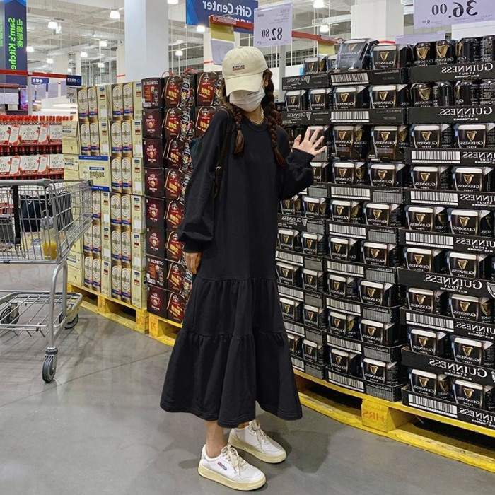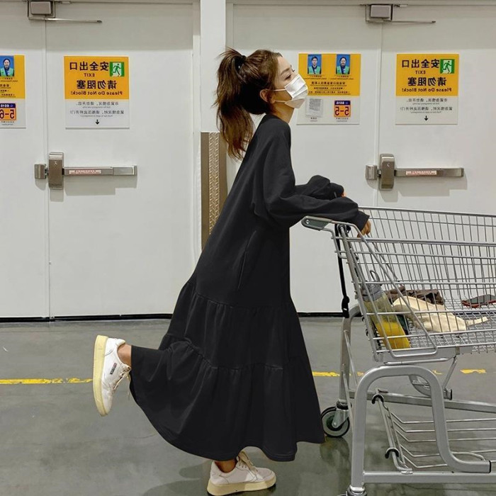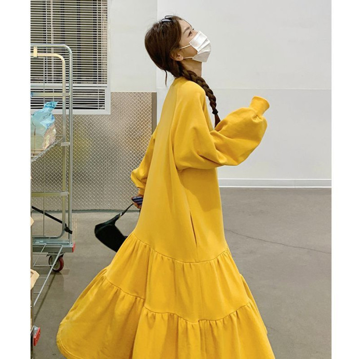 胖MM300斤春秋冬大碼長袖連衣裙女寬松遮肚加絨荷葉邊A字衛衣長裙