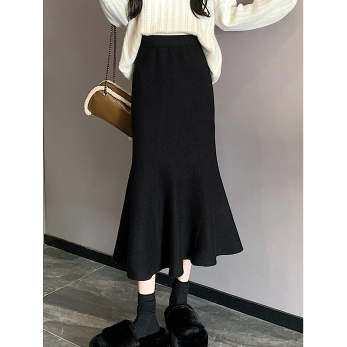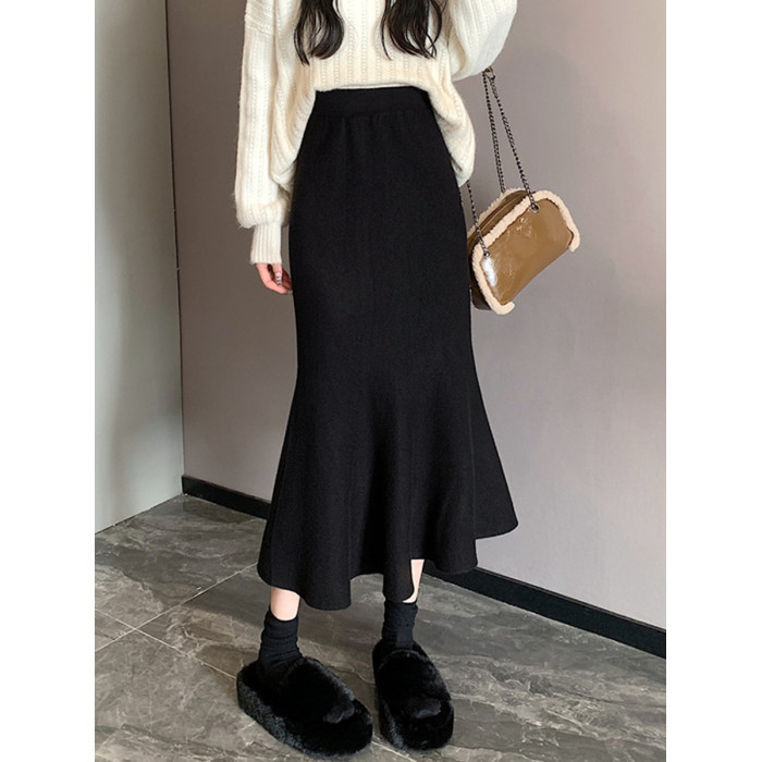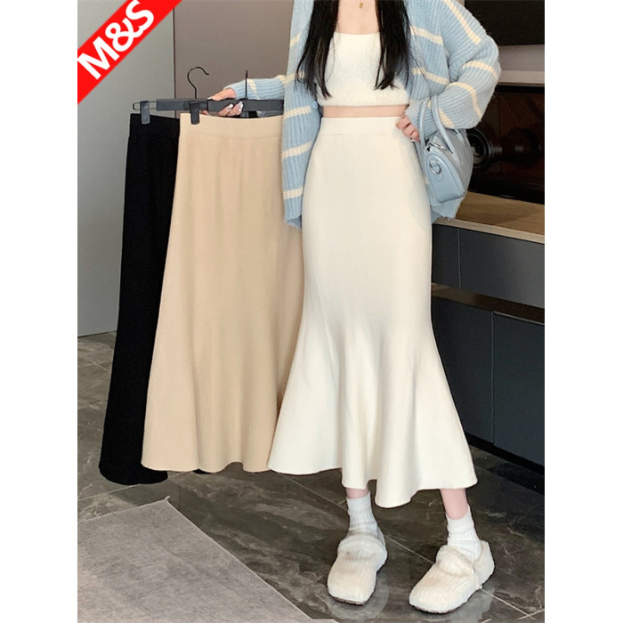 杏色針織魚尾裙包臀半裙女秋冬新款高腰a字長裙冬季米白色半身裙