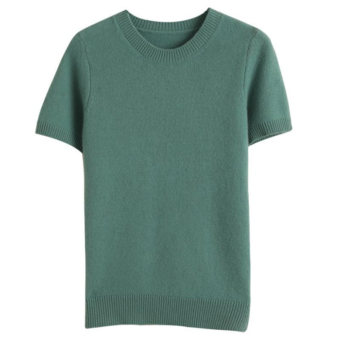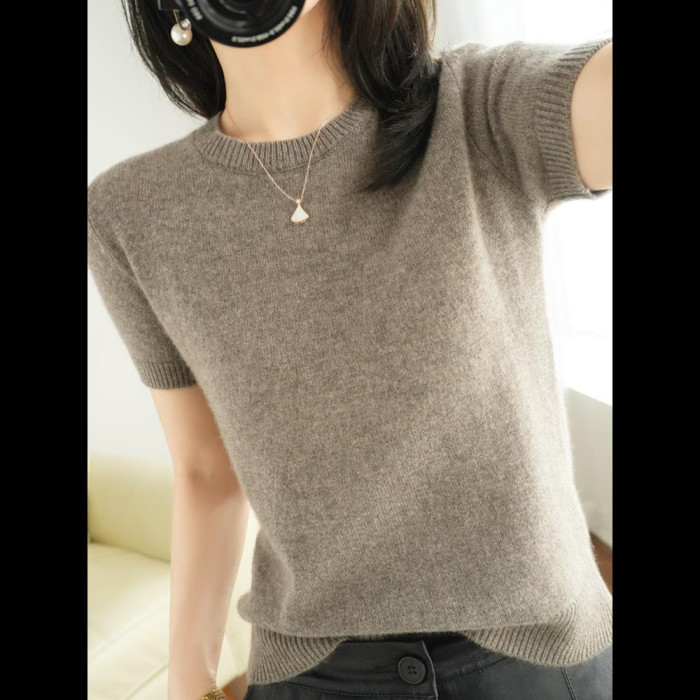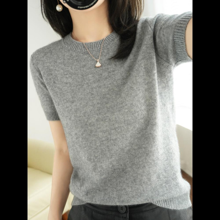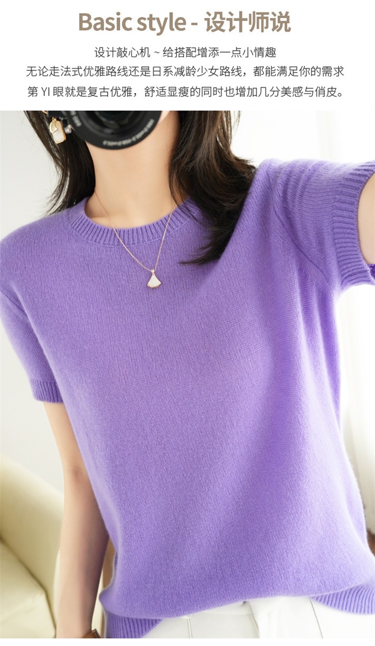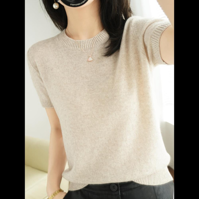 薄款羊毛針織短袖t恤女24夏季新款圓領寬松短款羊絨半袖上衣外穿