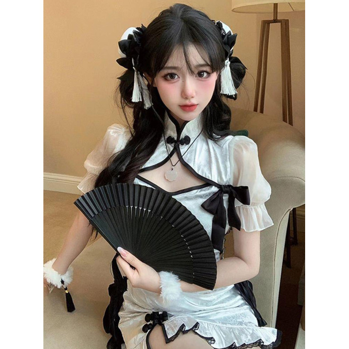 國風甜辣性感鏤空暗紋提花改良旗袍裙收腰修身開叉短款製服連衣裙