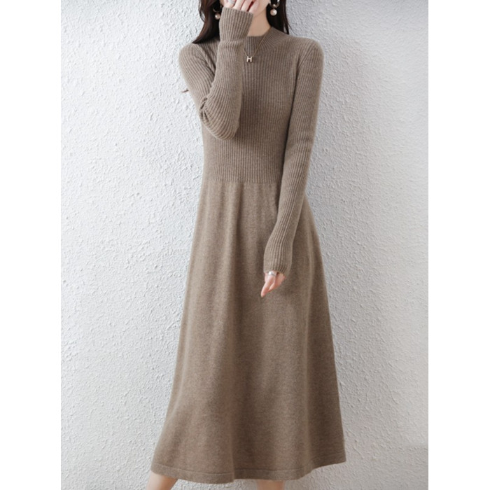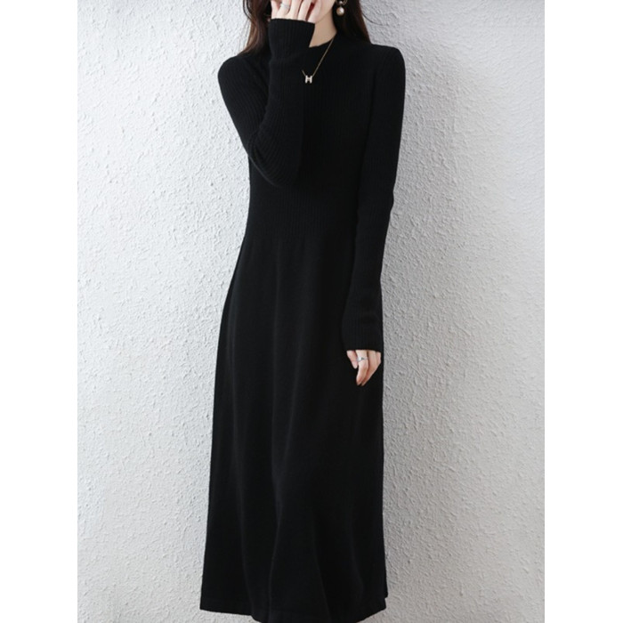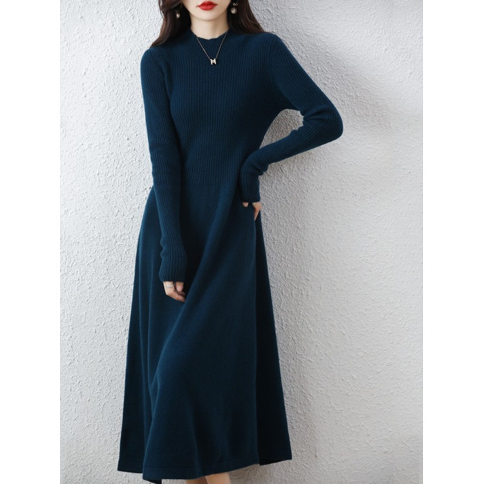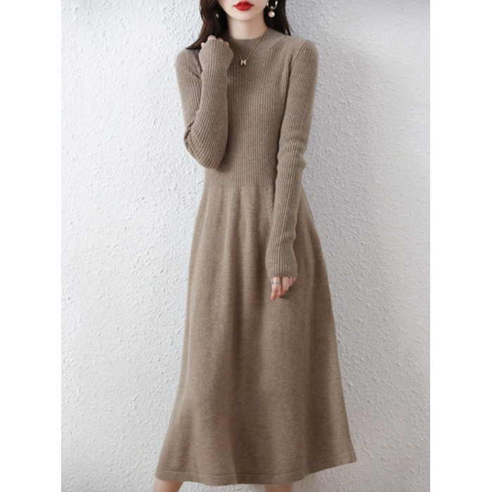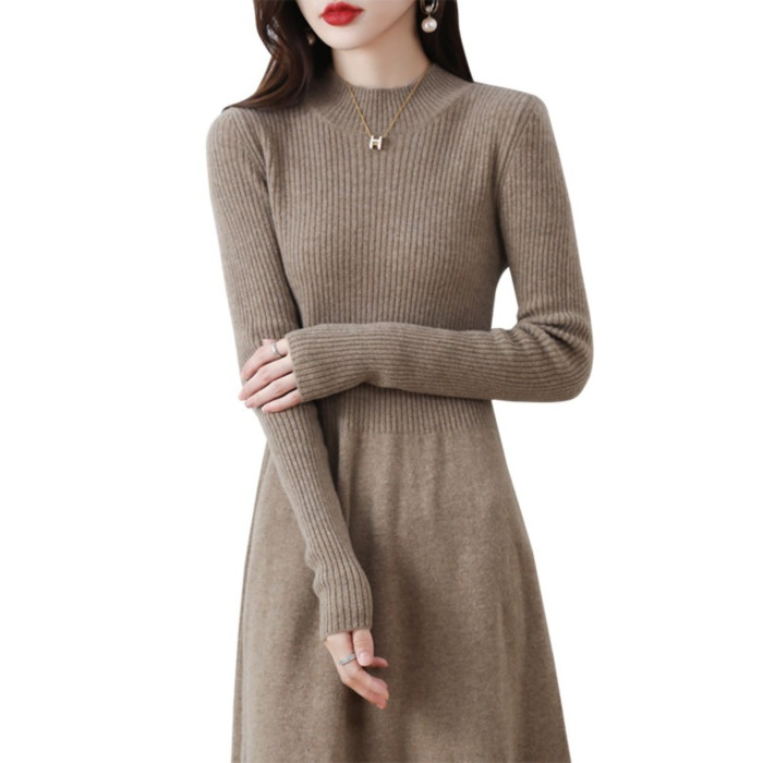 2023秋冬新款A字連衣裙女中長款半高領毛衣過膝顯瘦針織羊絨長裙