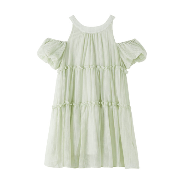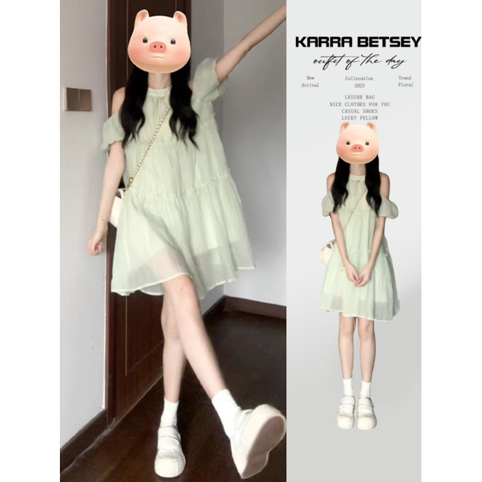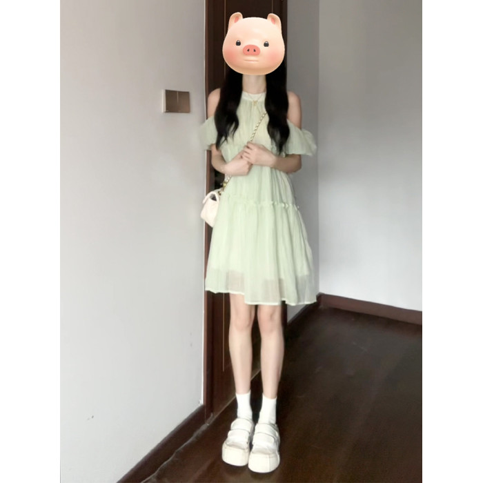 2025新款小個子露肩掛脖吊帶綠色連衣裙子女夏季法式初戀仙女短裙