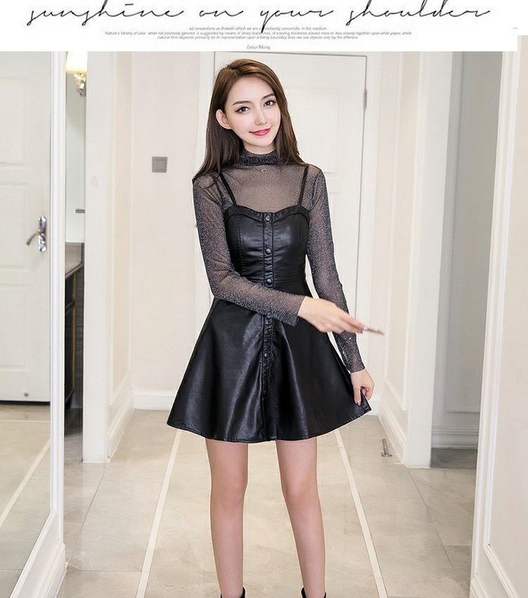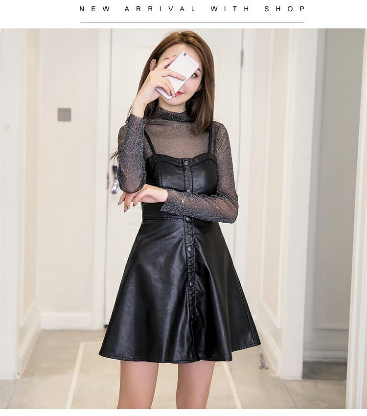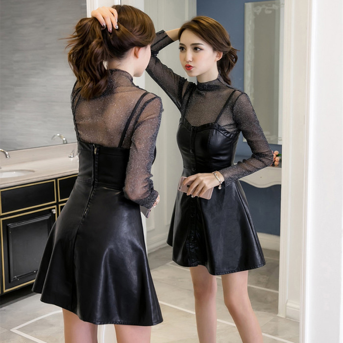 PU皮連衣裙兩件套秋季性感透視衫小心機吊帶裙顯瘦短裙時尚套裝女