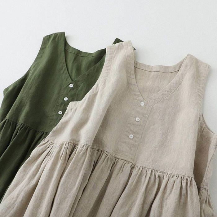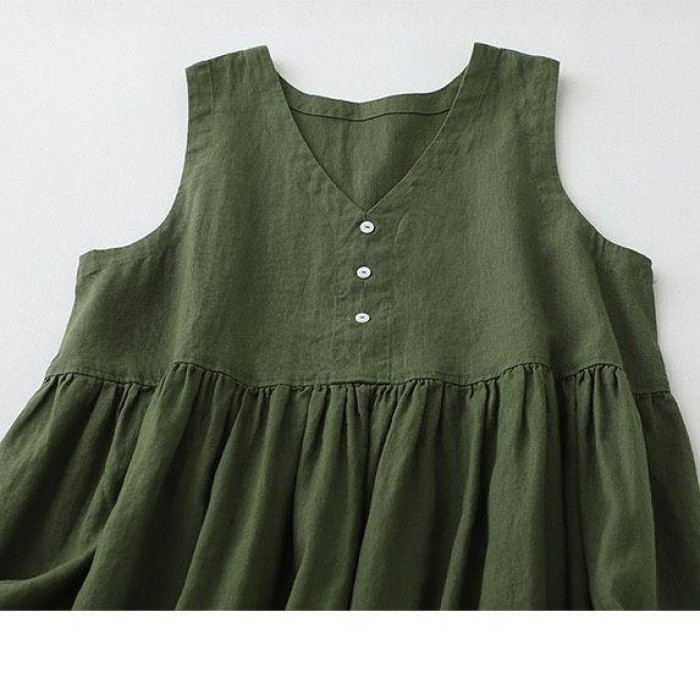棉麻復古簡約純色V領背心女夏季寬松大碼遮肚顯瘦減齡無袖連衣裙